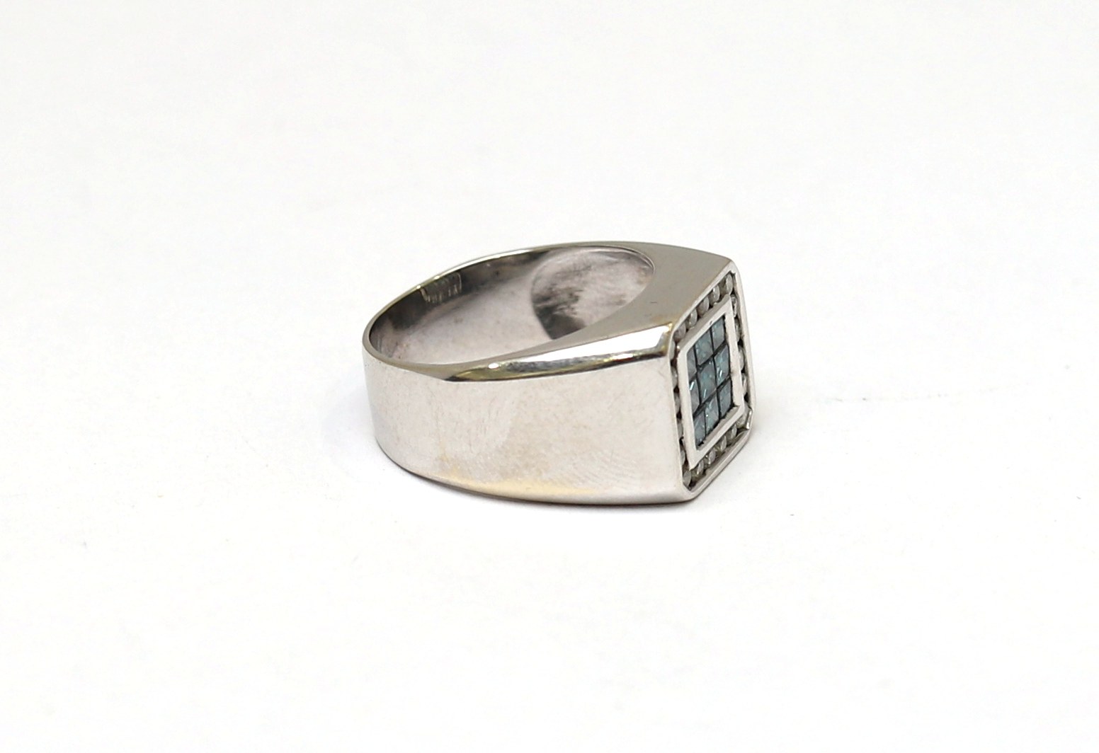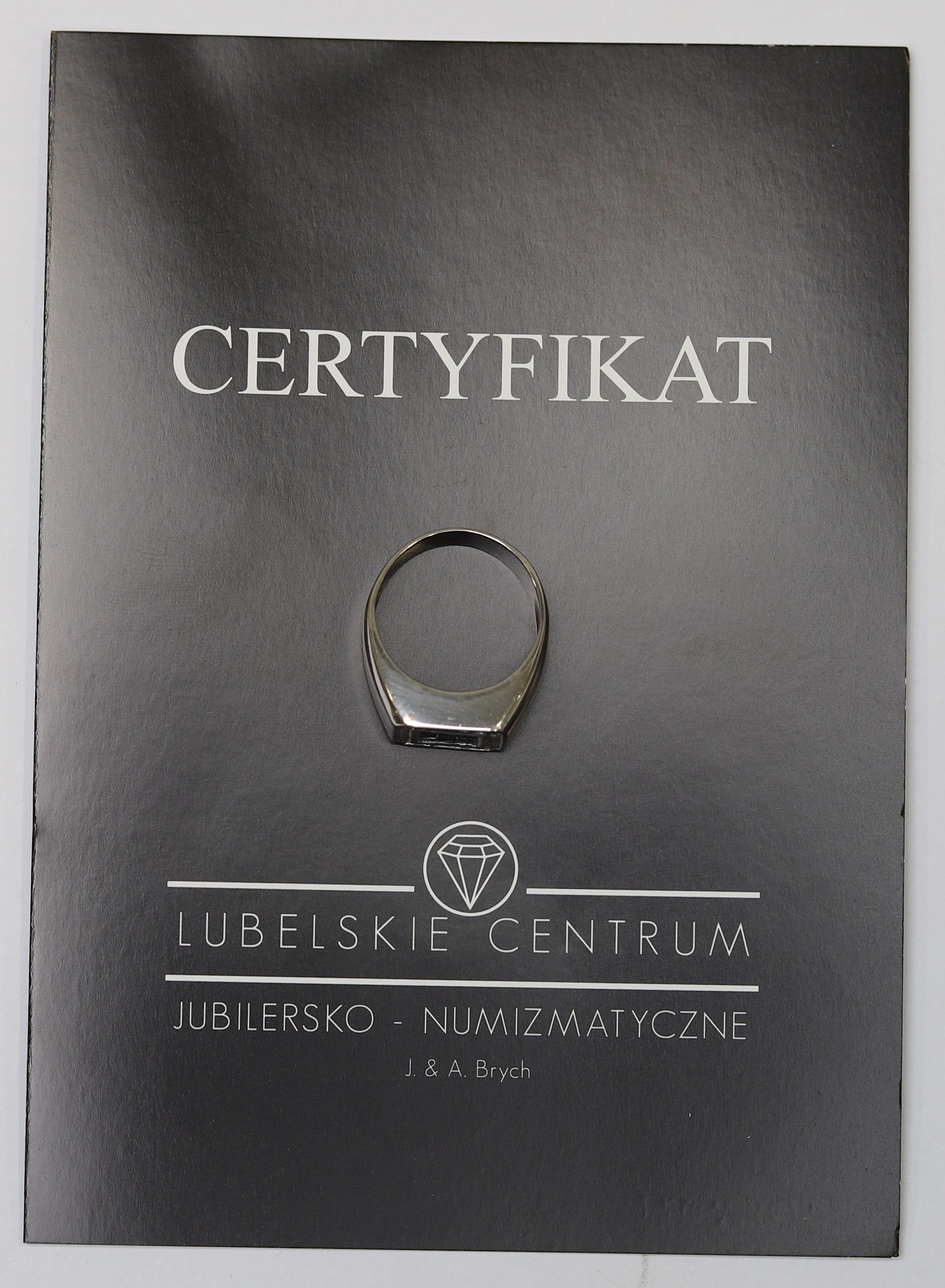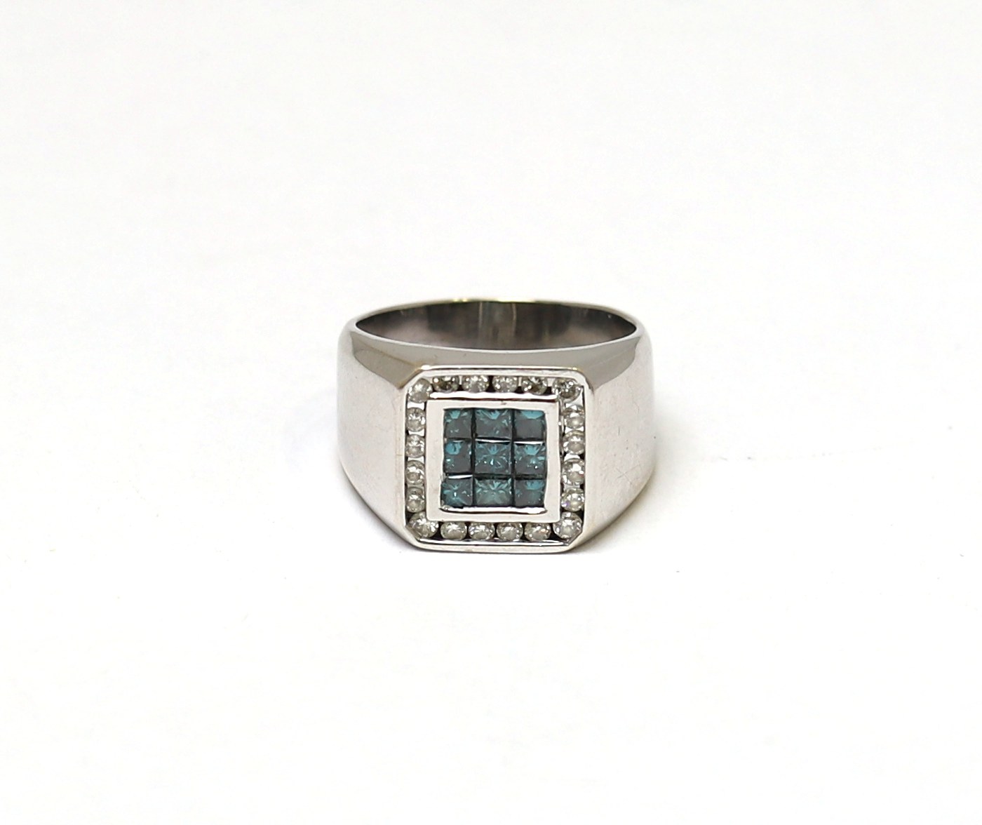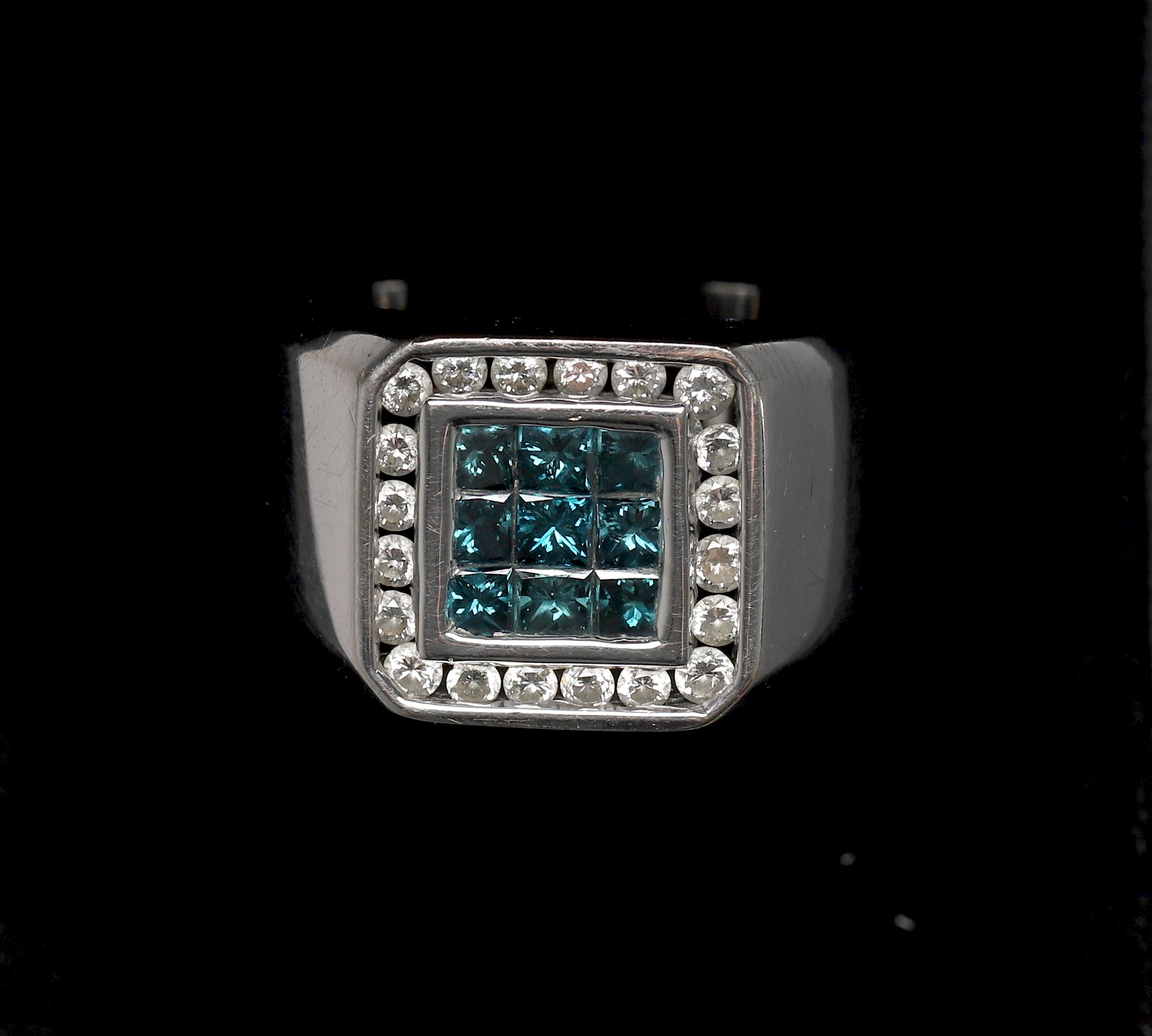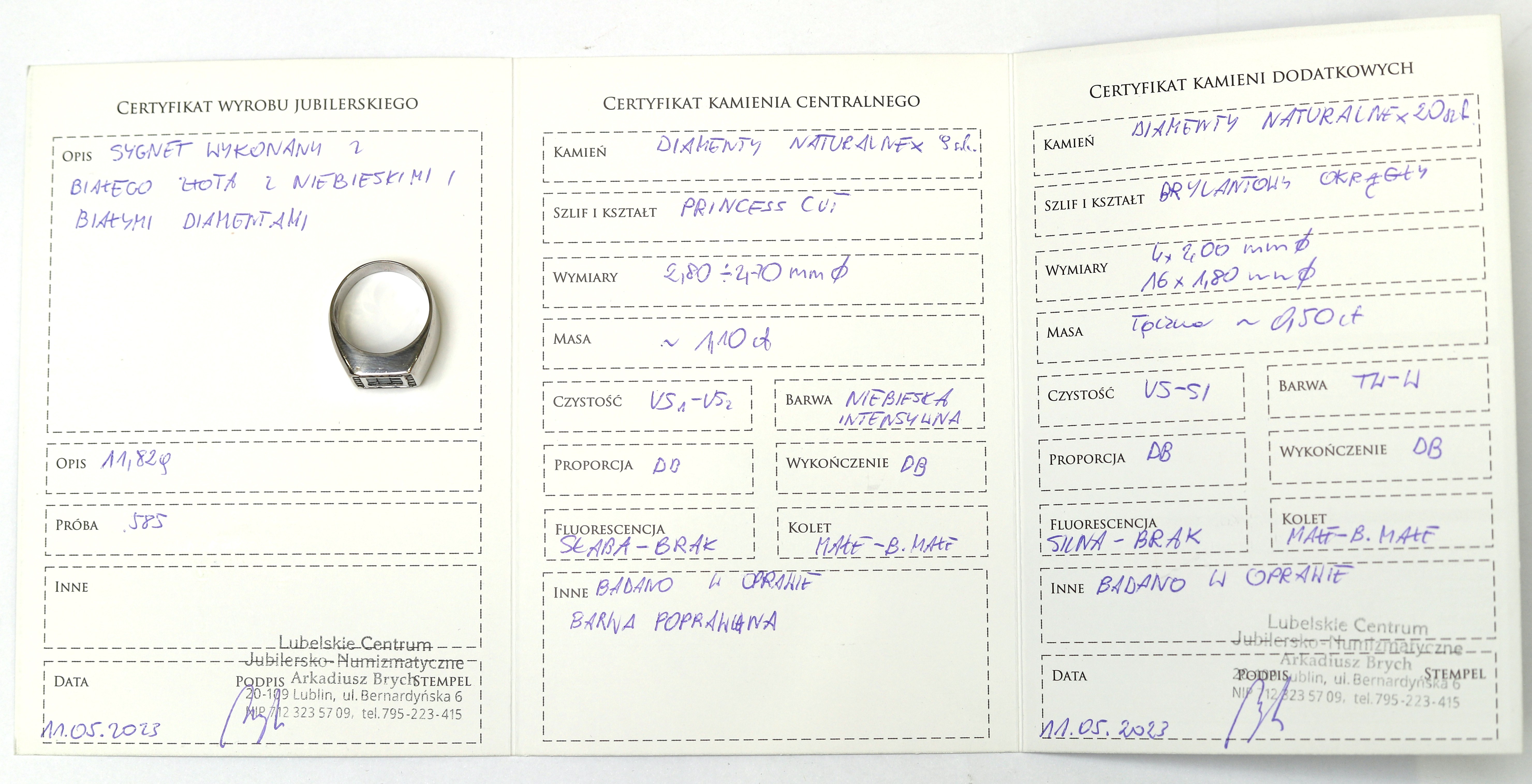 Złoto .585, rozmiar 21 , diamenty princessa ~1,1 ct, czystość VS1-VS2, barwa niebieska intensywna, diamenty w szlifie brylantowym ~0,5 ct, czystość VS-Si, barwa TW-W, waga łączna wyrobu 11,82 g.