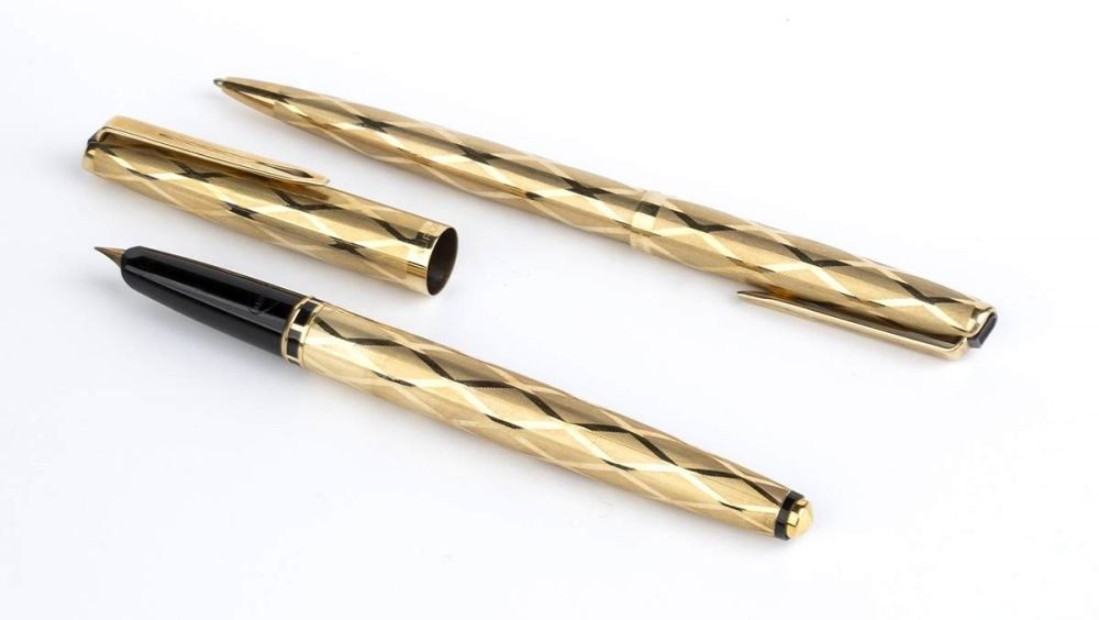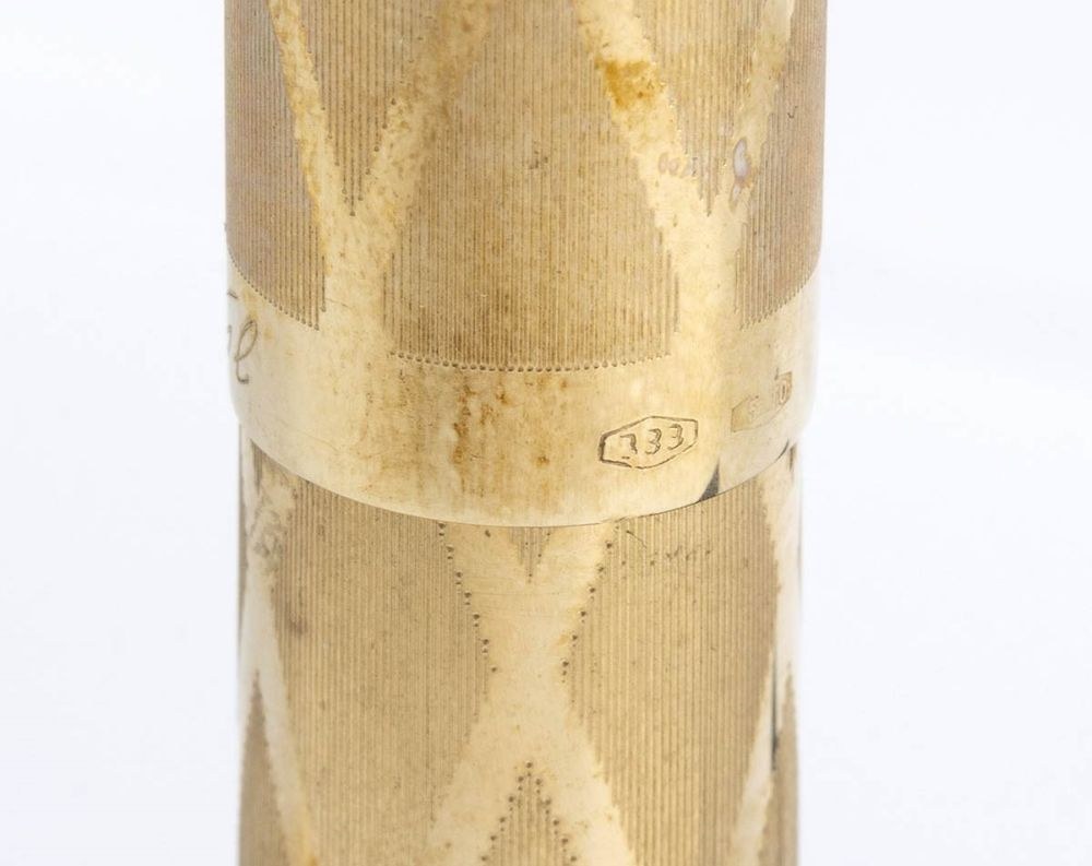 9k gold barrel and cap with geometric decorations hallmarked "333 - " 5 TO". Fountain pen with piston filling system