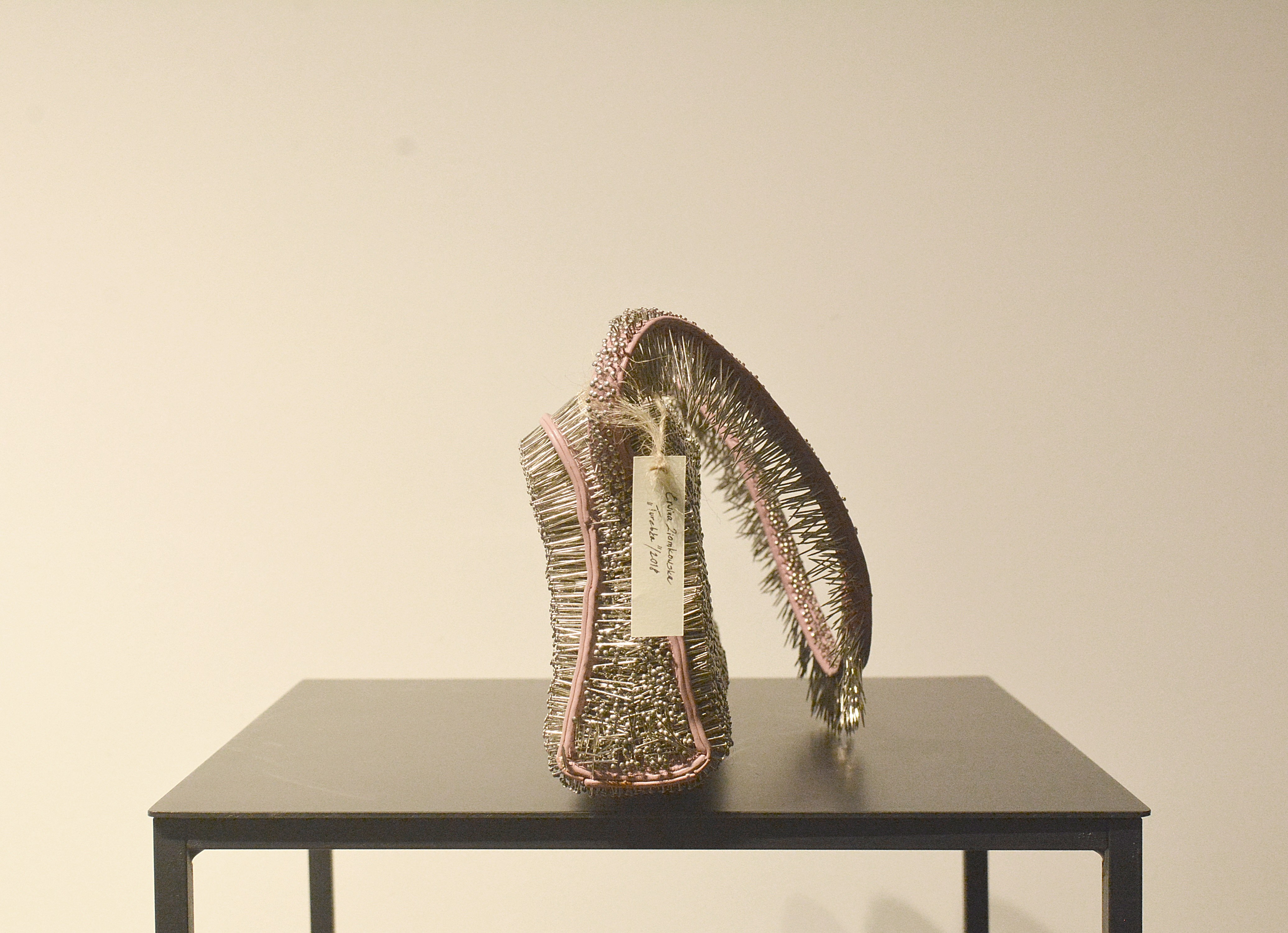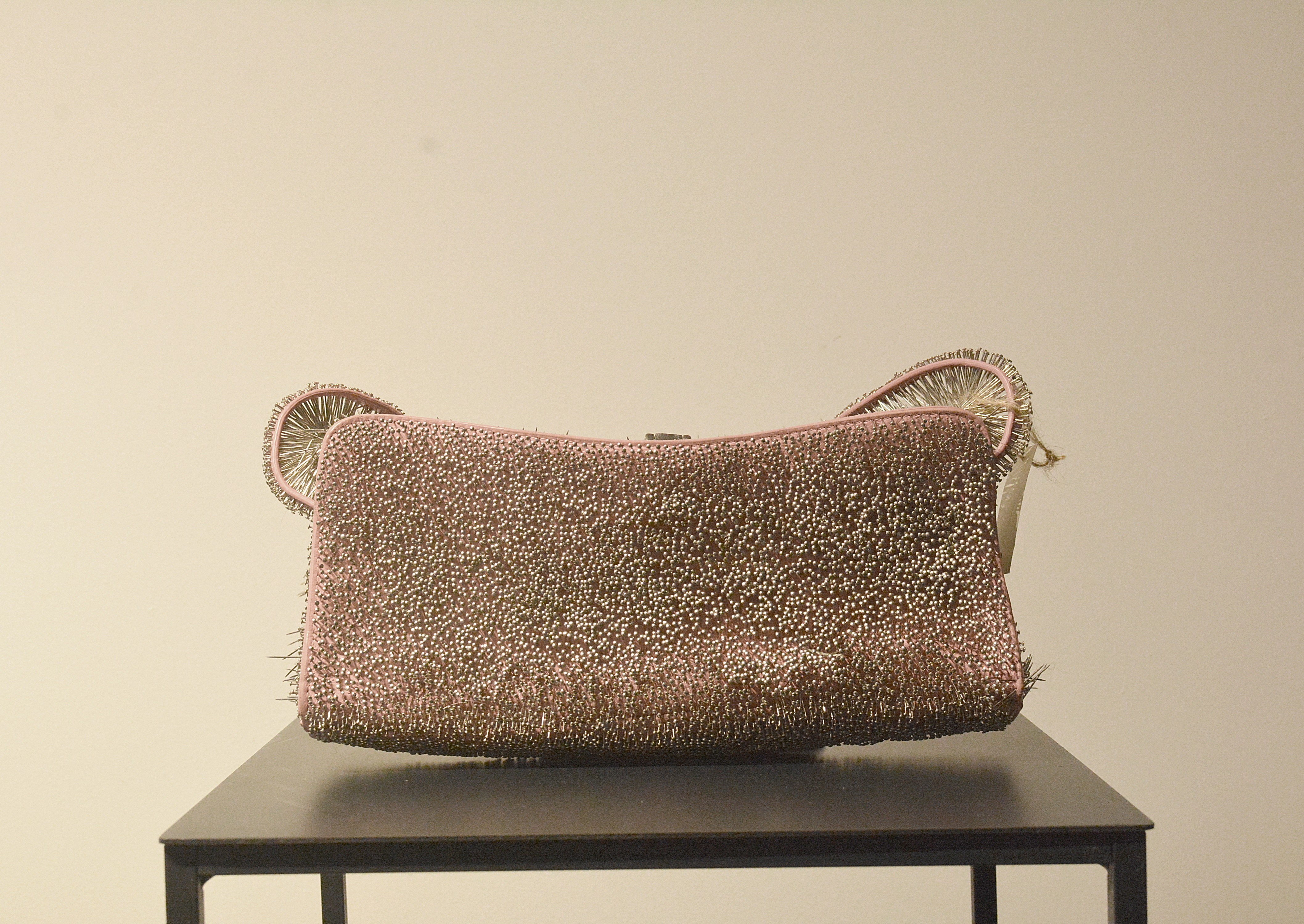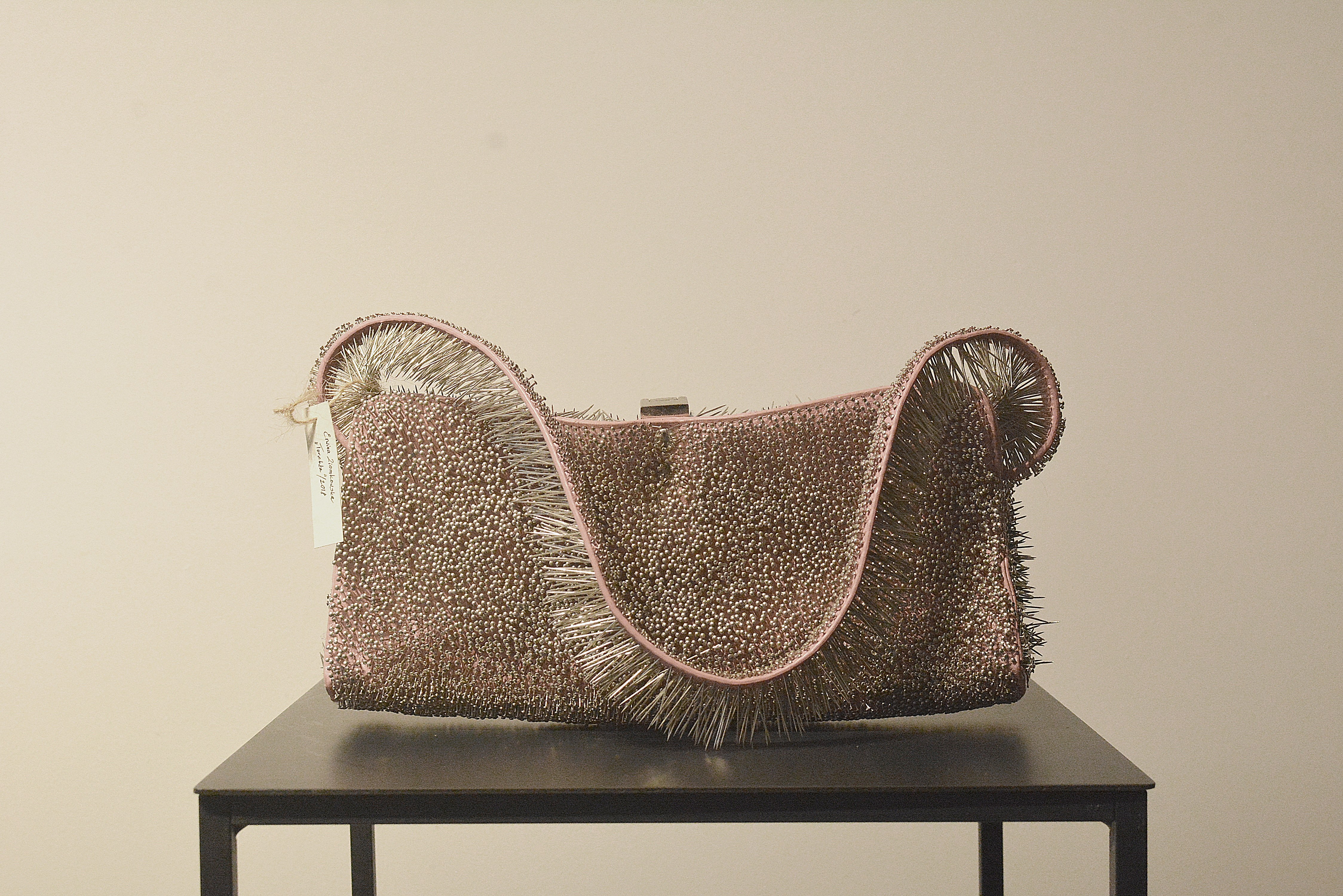 ready made (torebka), szpilki, ok. 25 x 31 x 4,5 cm; karteczka z sygnaturą dołączona do obiektu