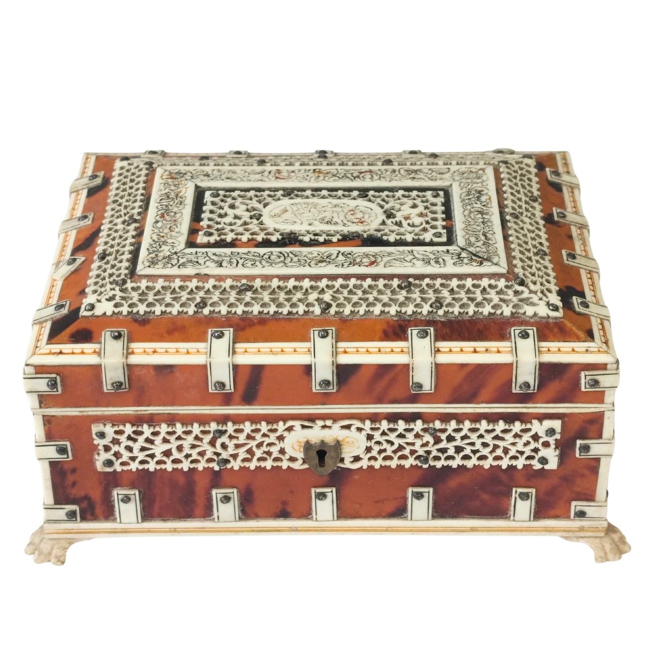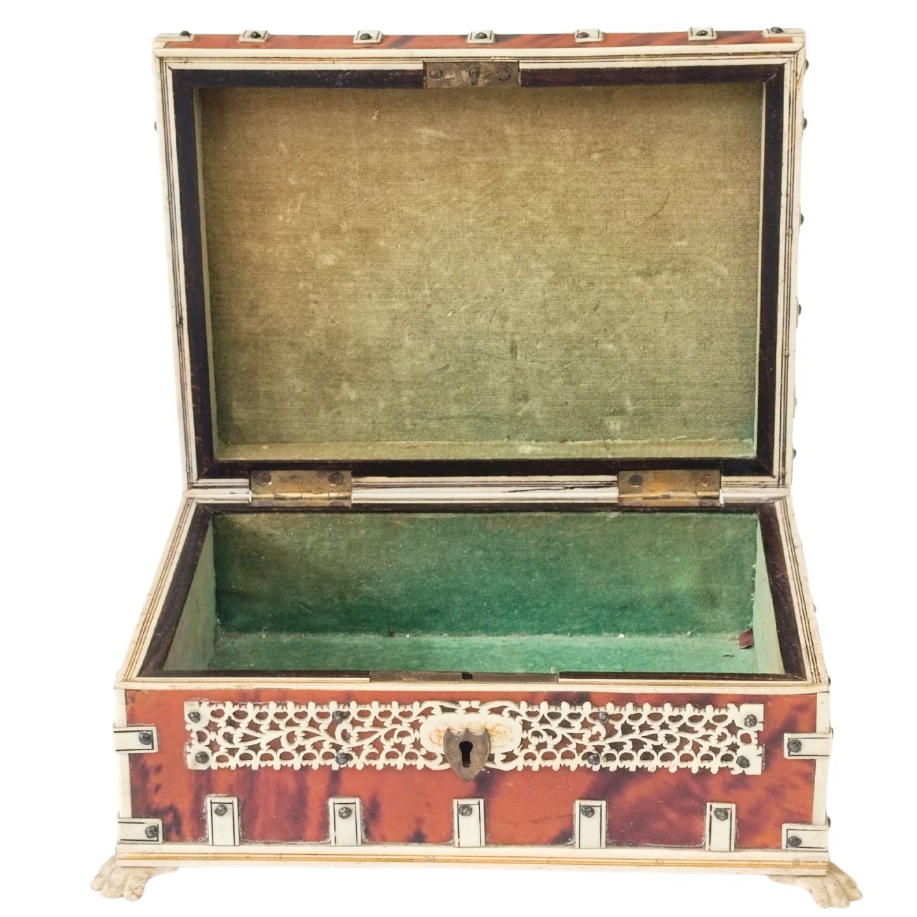 Dekoracyjna szkatułka umieszczona na czterech konsolowych stopach. Drewno inkrustowane szylkretem oraz kością słoniową.