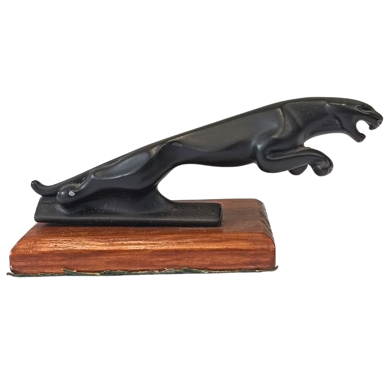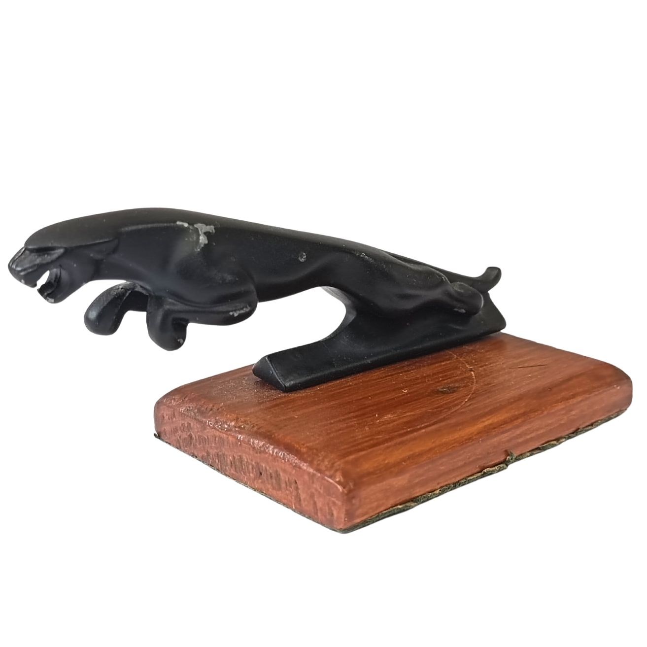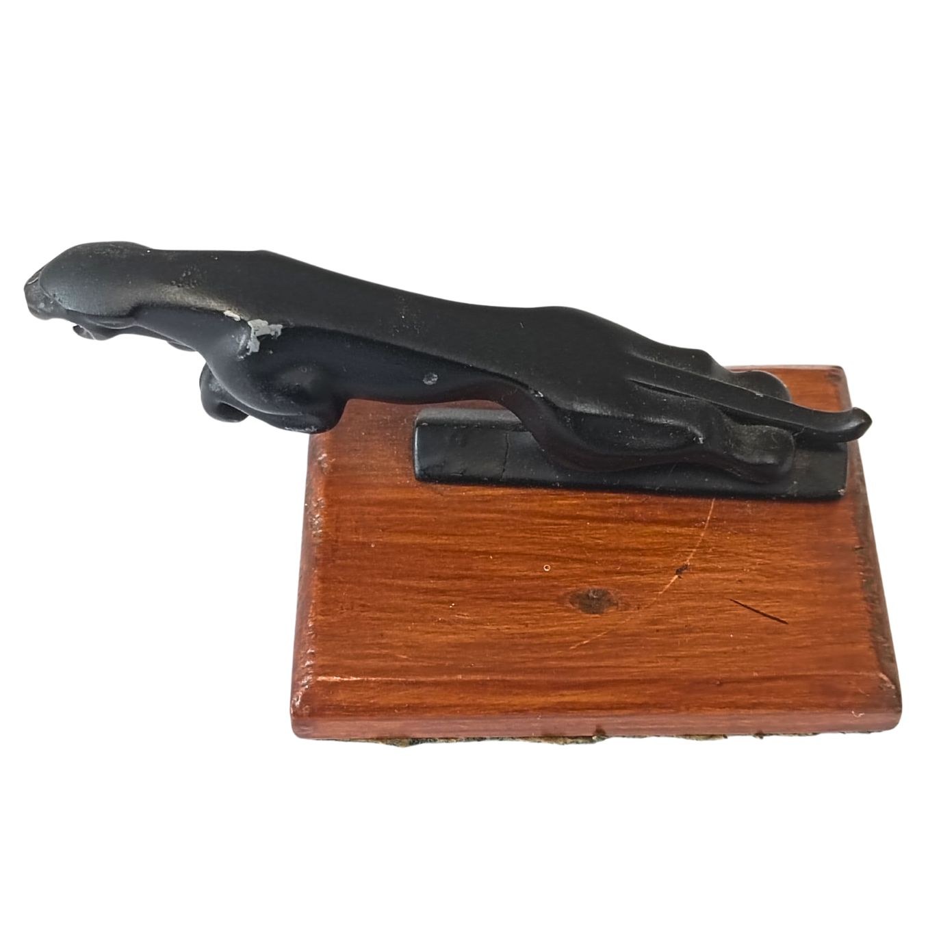Przycisk do papieru / dekoracja z metalową figurką jaguara na drewnianej podstawie. Niewielkie odpryski farby na jaguarze.