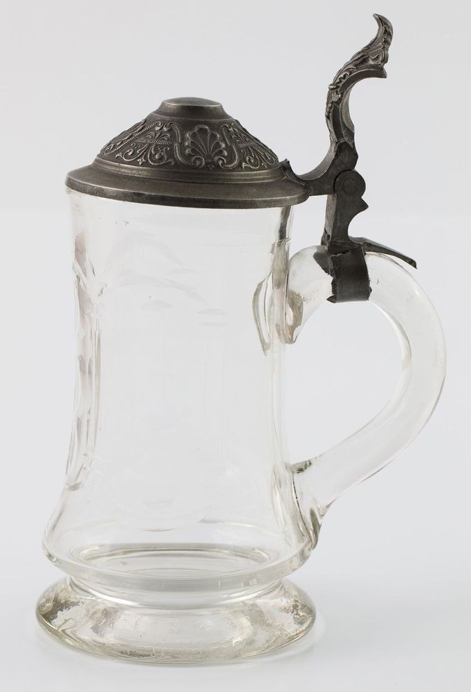 Szkło bezbarwne, szlifowane, cyna (pokrywka), dł. 22, śr.10,5 cm