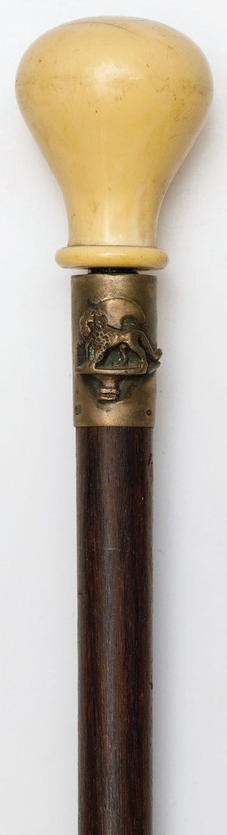 Drewno toczone, kość (gałka), opaska srebrna, próba 800, skuwka mosiężna, dł. 87 cm