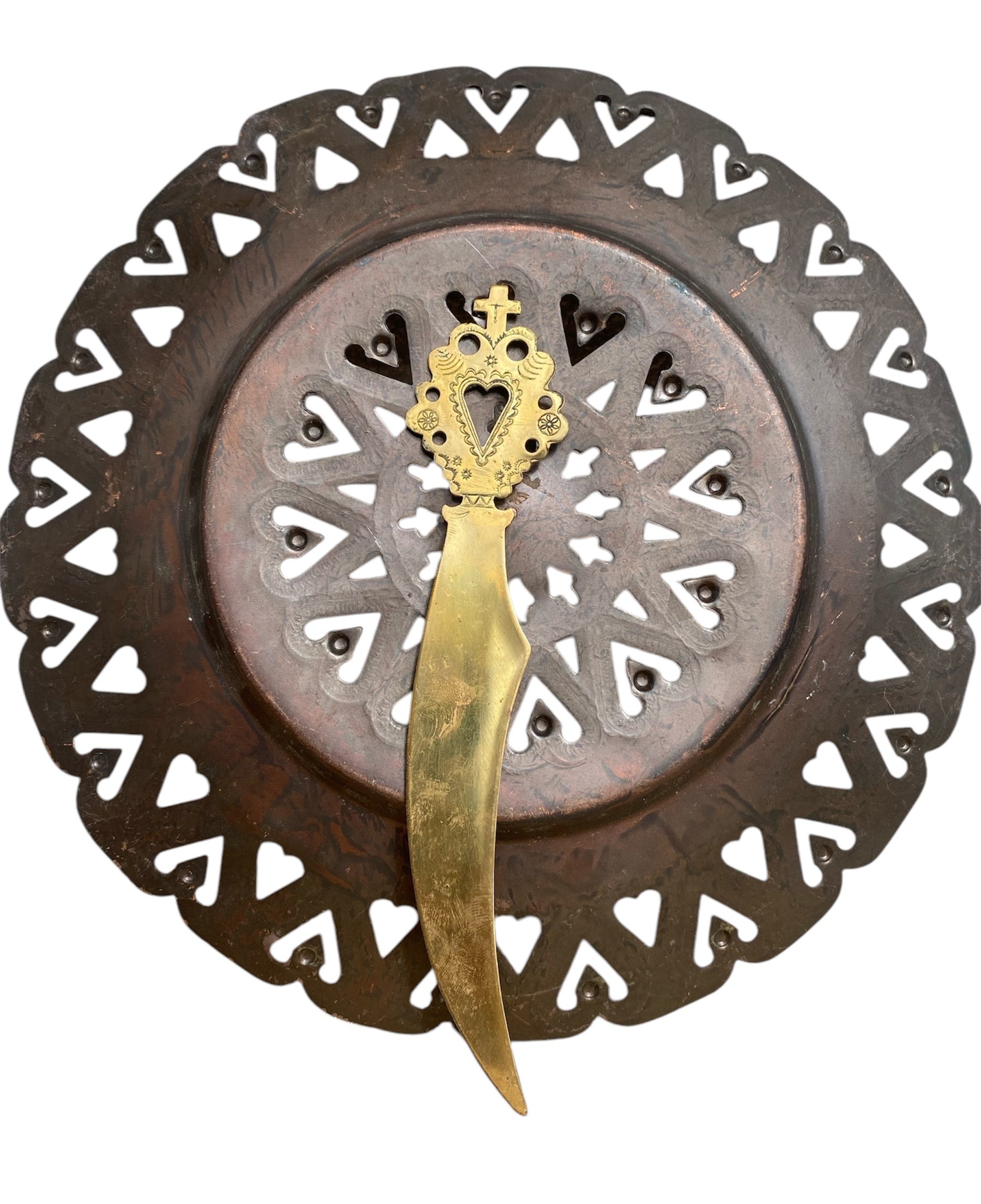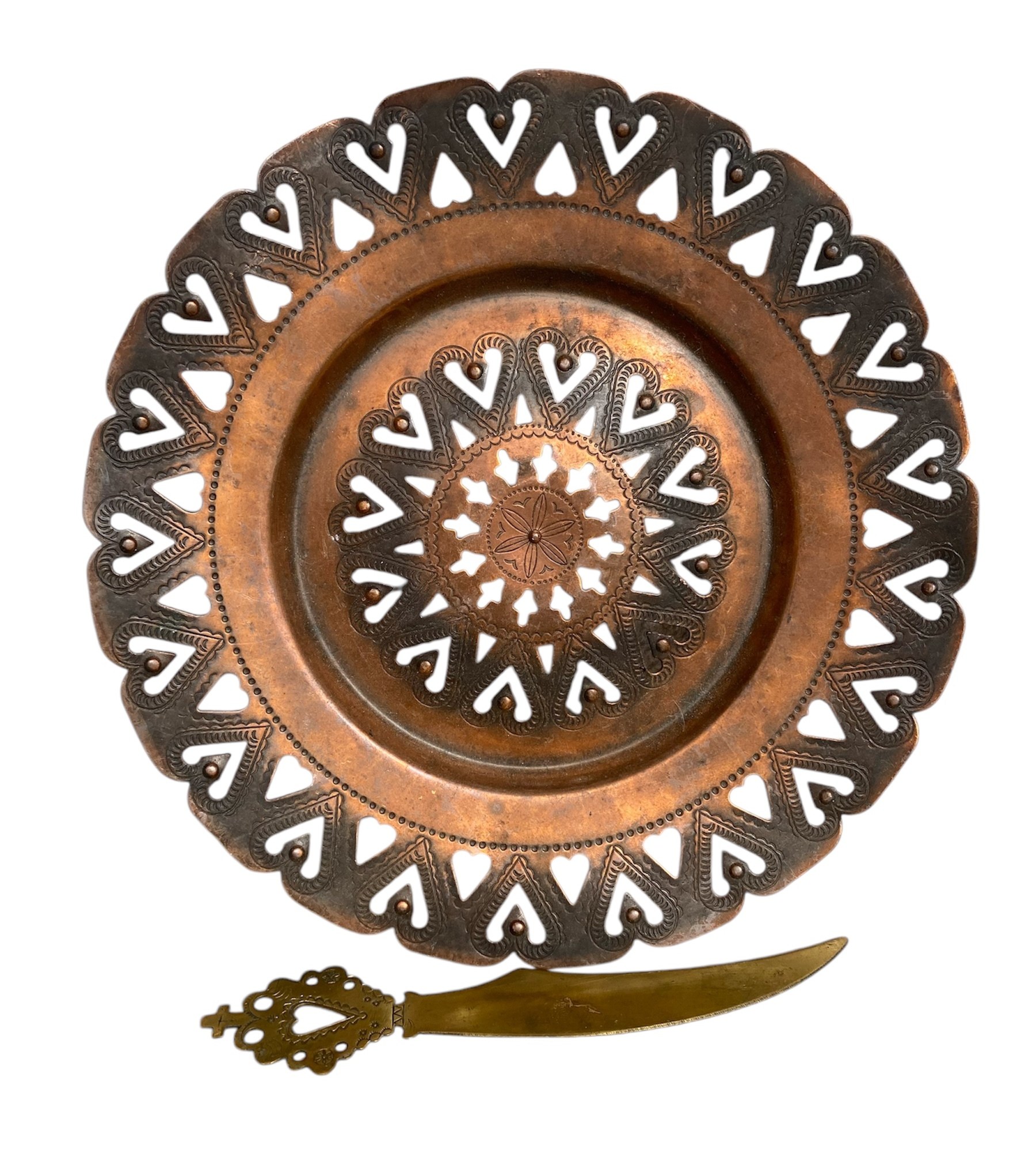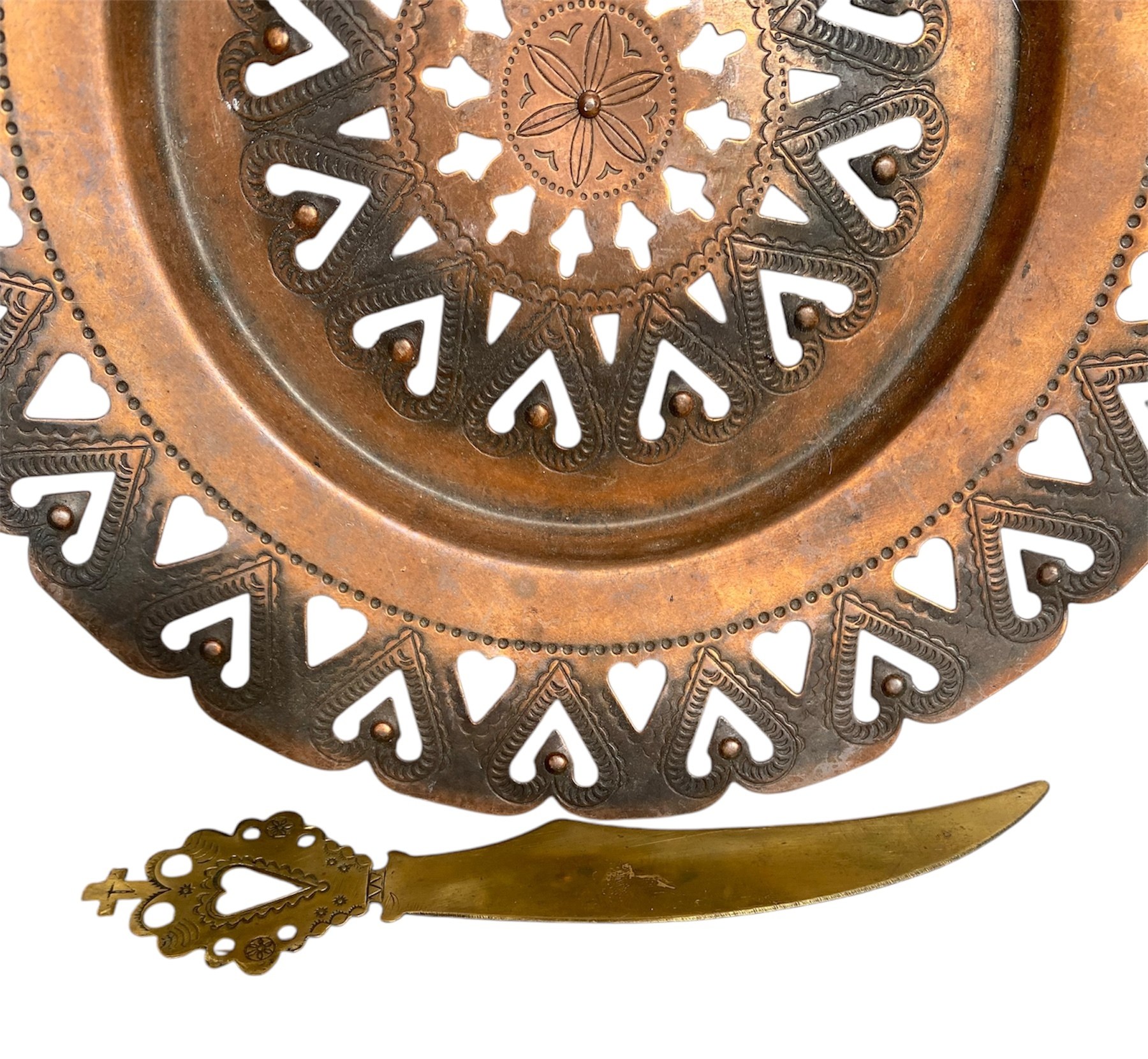 Miedziany talerz dekoracyjny i nożyk do listów z motywem zakopiańskim