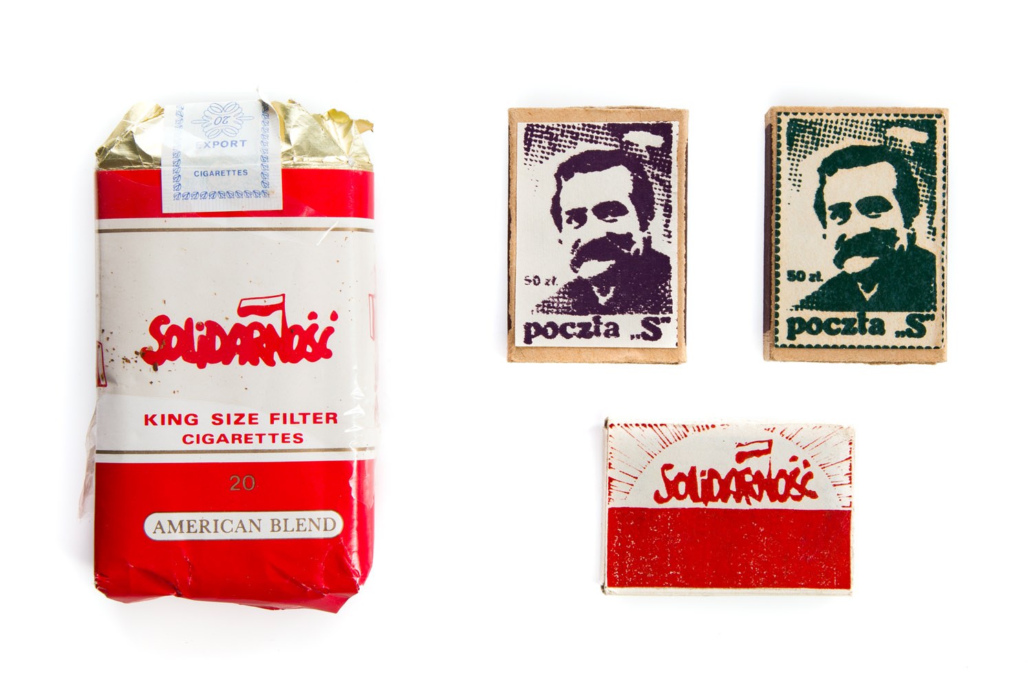 Paczka papierosów oraz zapałki "Solidarność" i "Poczta S"