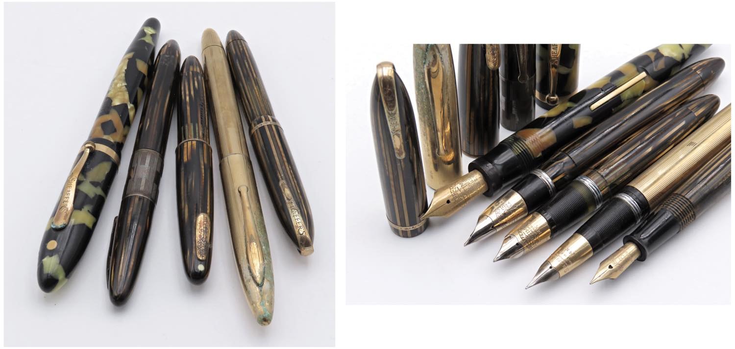SHEAFFER'S. Lotto di 10 penne stilografiche. Vari modelli ed epoche, perlopiù con pennini in metallo dorato ed in minoranza in oro, con sistemi di ricarica a stantuffo e a goccia. Tutte le penne sono usate e vendute in scatola neutra. Esaminare foto o chiedere condition report.