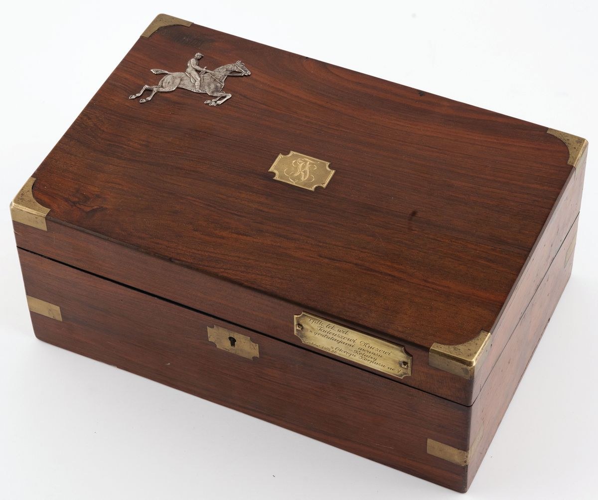 Wtórne aplikacje: jeździec; kartusz z monogramem: KJ; mosiężna tabliczka z napisem: Ppłk lek. wet. Tadeuszowi Kuczowi z gratulacjami awansu Koledzy z Okręgu Korpusu nr. V Kraków 19 1/i 28