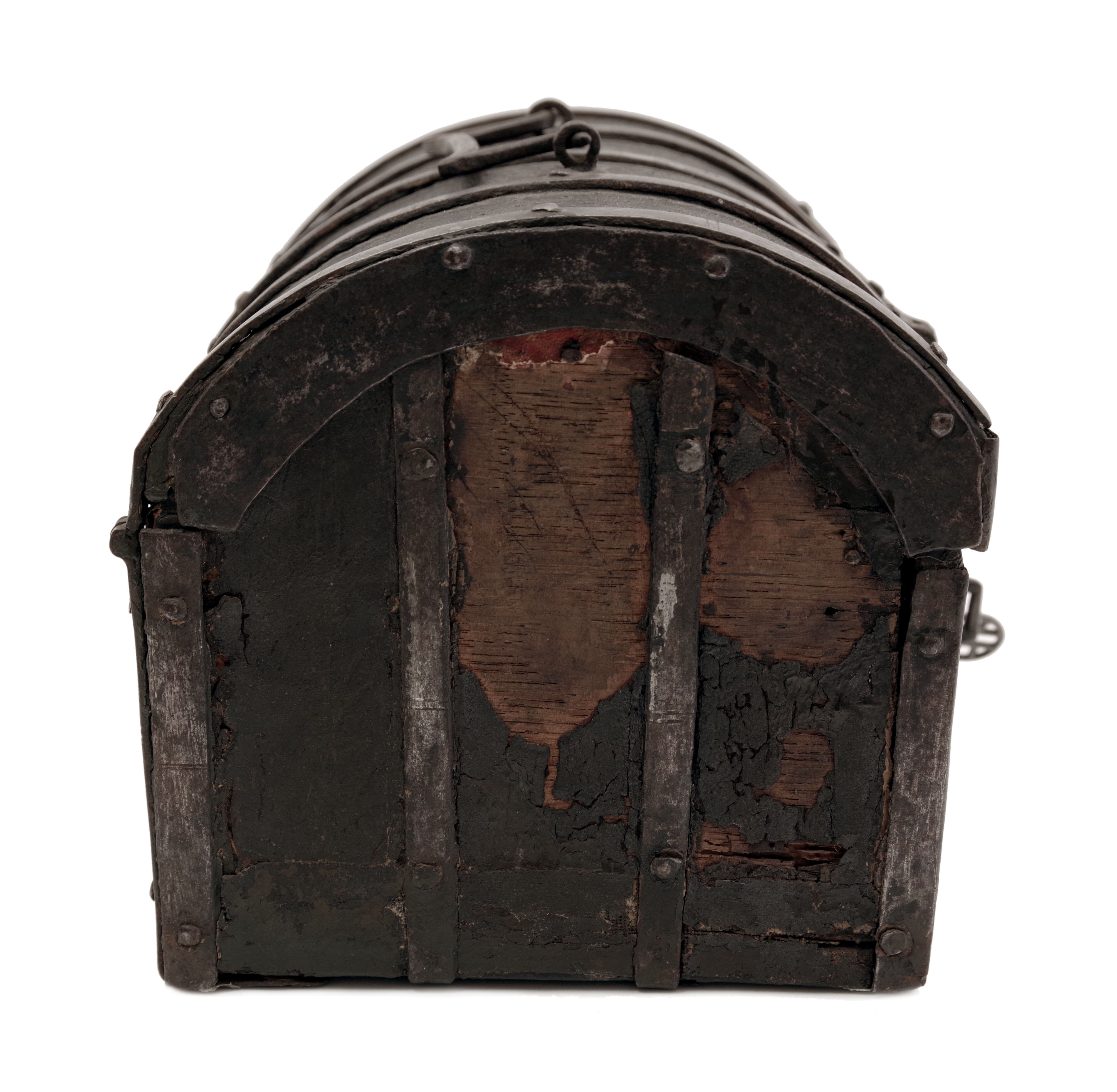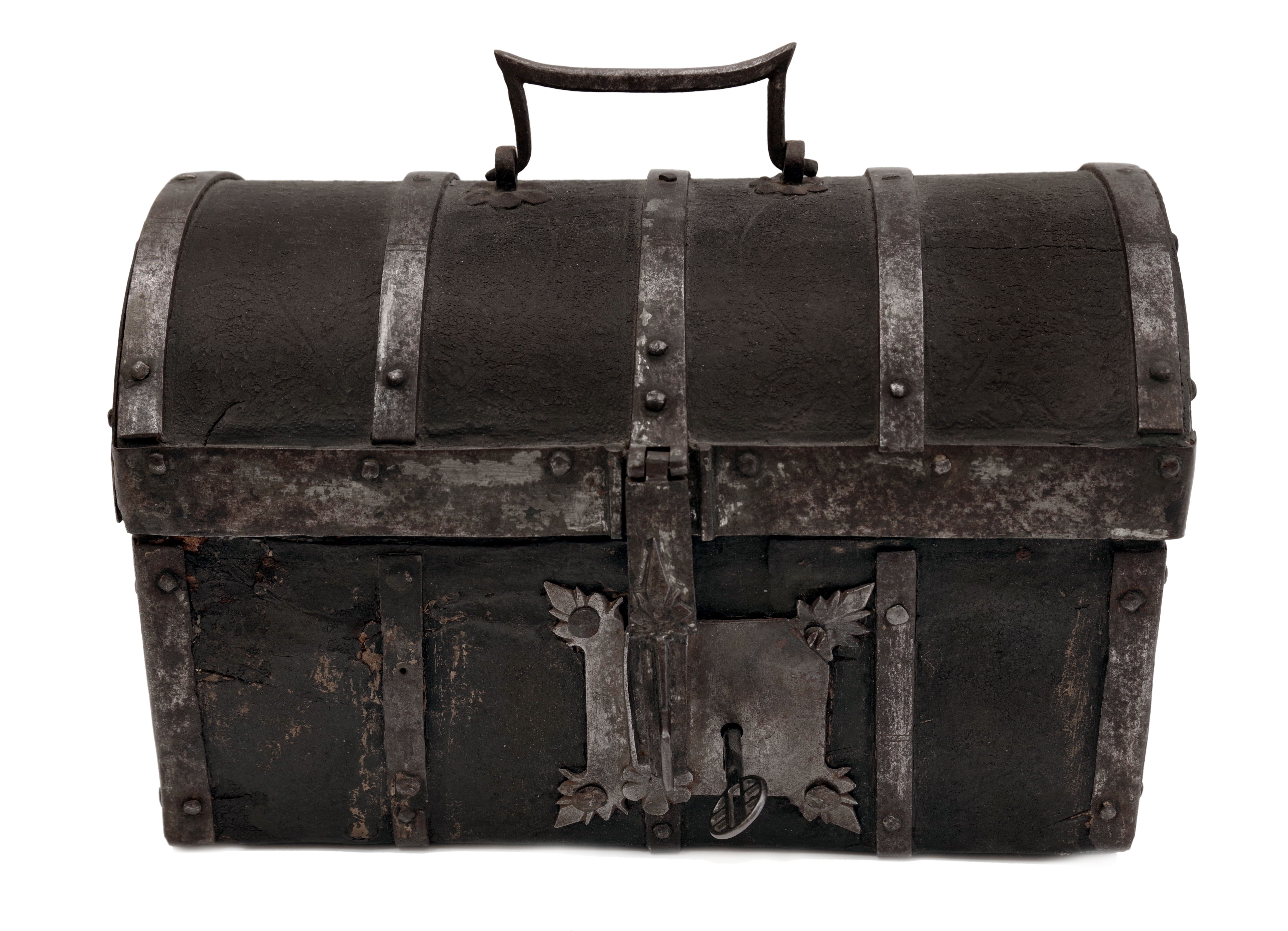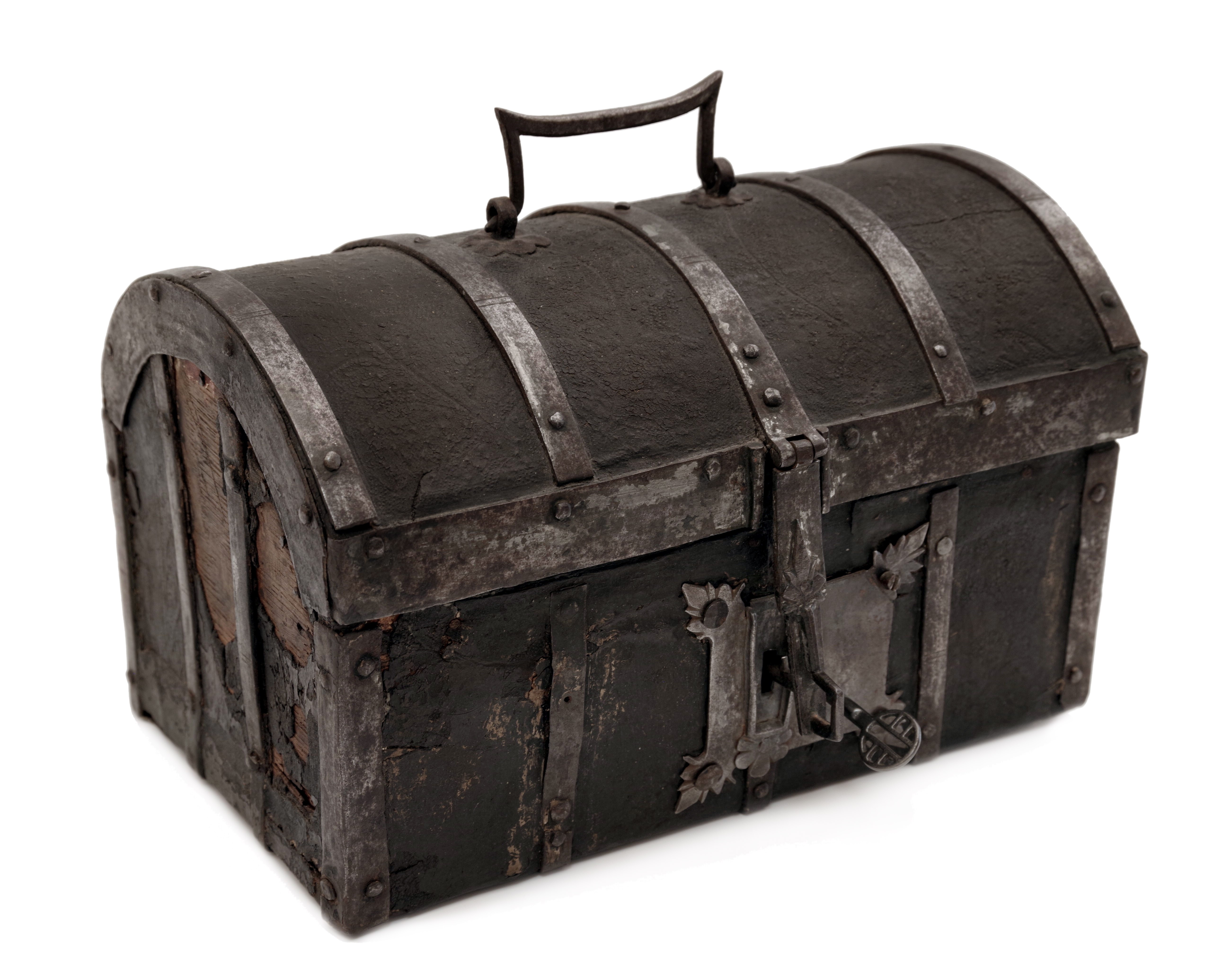 Malý kufřík nebo schránka s dřevěným tělem potaženým kůží s tlačeným florálním stylizovaným gotickým dekorem, železná montáž. Uvnitř původní výstelka. Originální zámek. Patrně Španělsko, 15. století, rozměry 28,5 x 17,5 x 18,5 cm. Známky stáří a používání, na boční stěně část kůže schází.