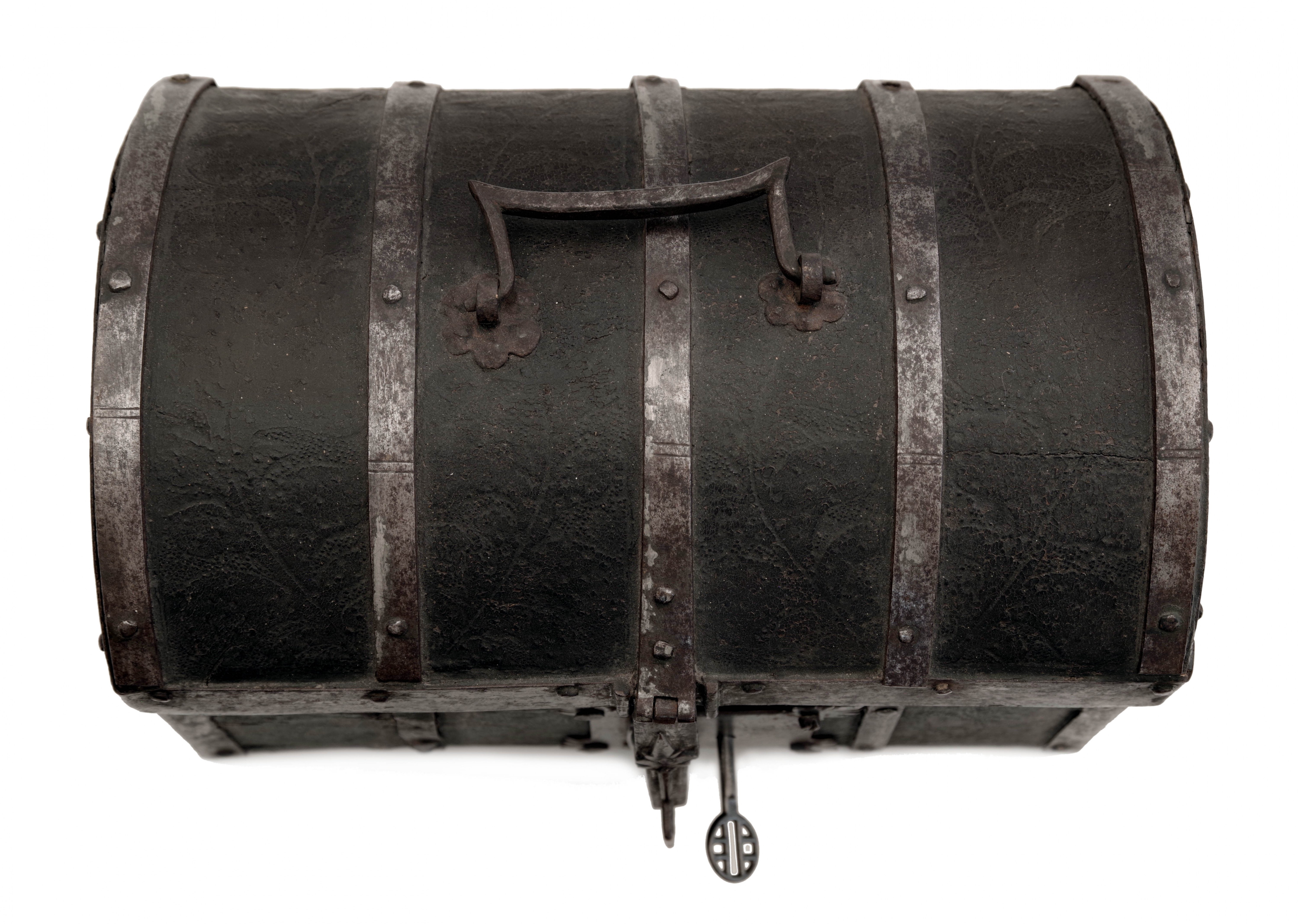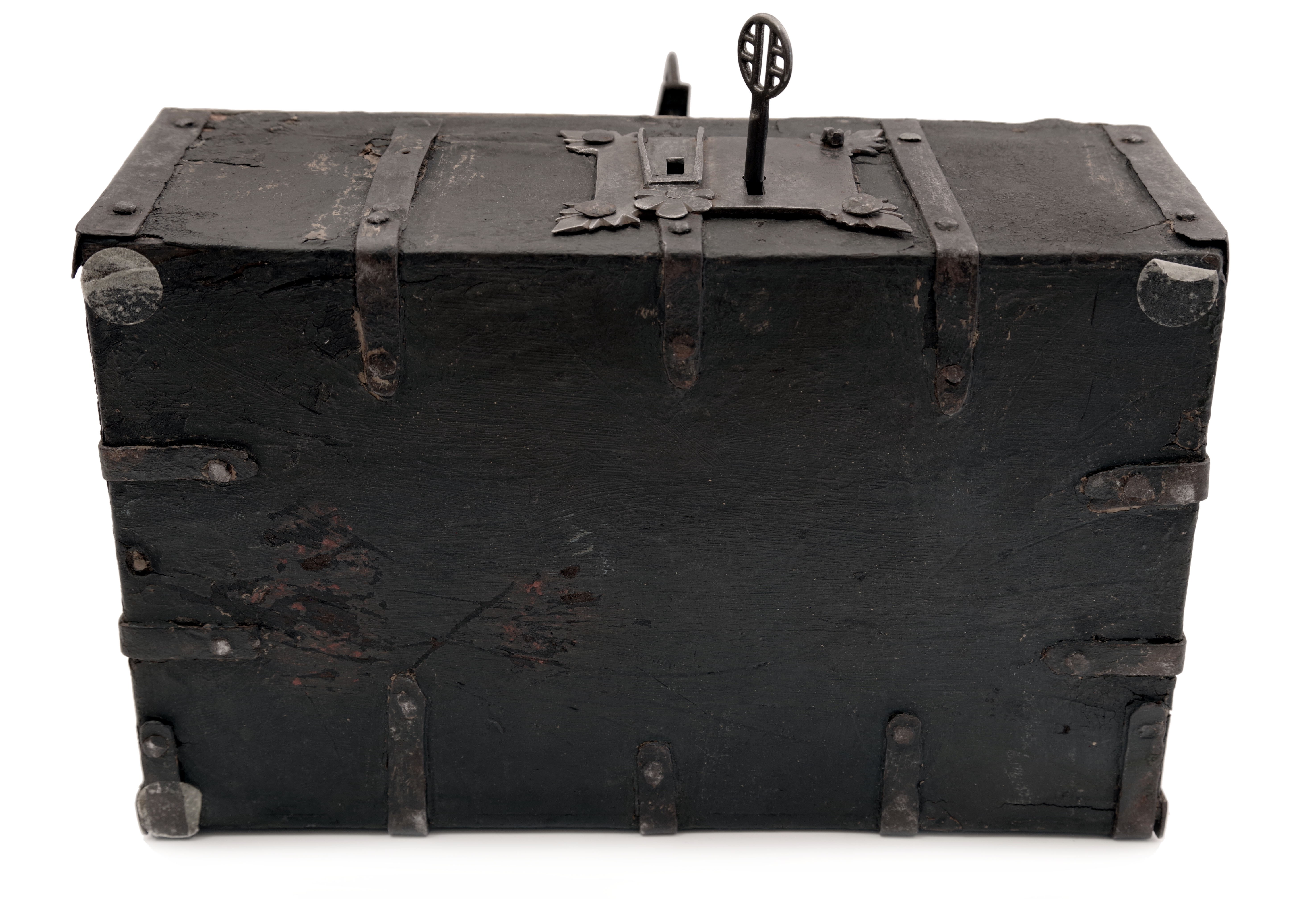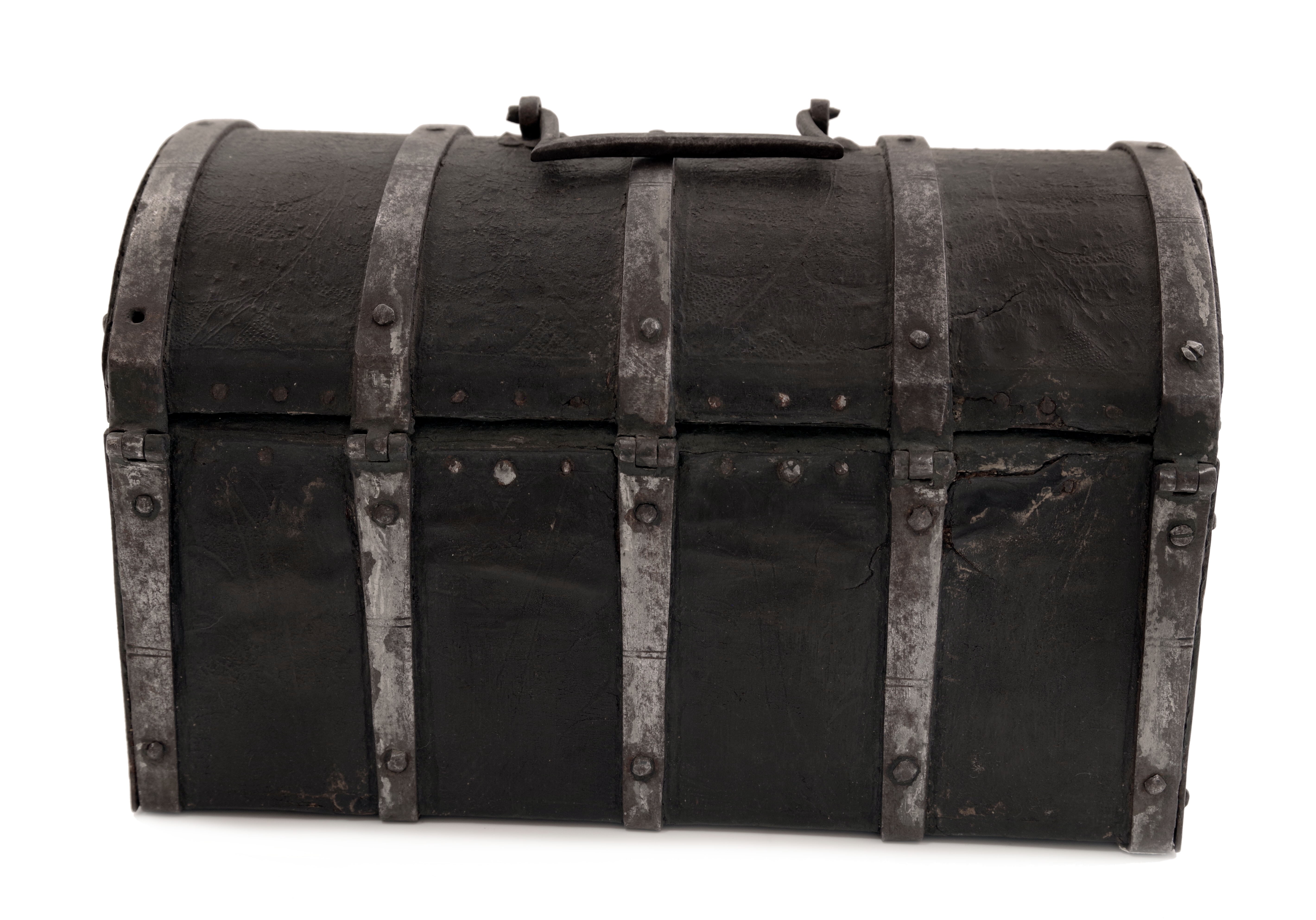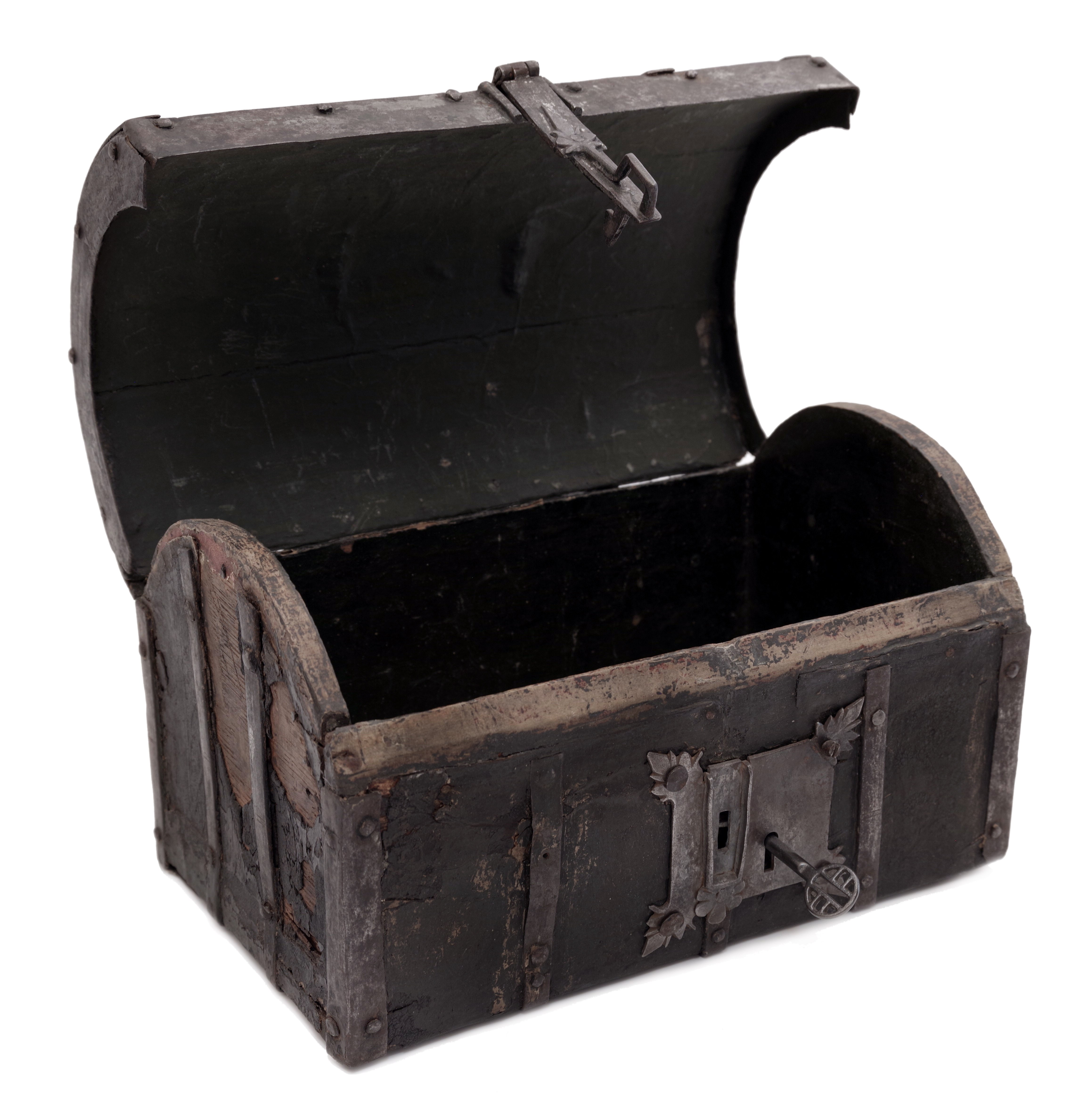 Malý kufřík nebo schránka s dřevěným tělem potaženým kůží s tlačeným florálním stylizovaným gotickým dekorem, železná montáž. Uvnitř původní výstelka. Originální zámek. Patrně Španělsko, 15. století, rozměry 28,5 x 17,5 x 18,5 cm. Známky stáří a používání, na boční stěně část kůže schází.