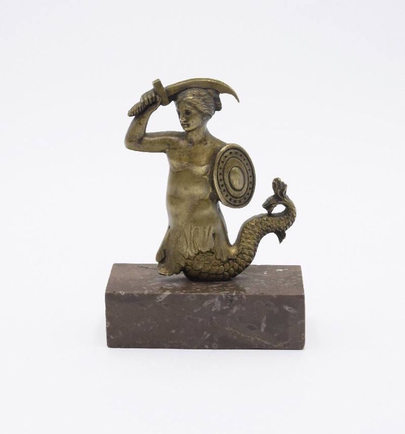 Figurka Syrenki z mieczem uniesionym nad głowę i tarczą w lewej ręce. Podstawa z prostokątnego klocka różowo-beżowego marmuru.