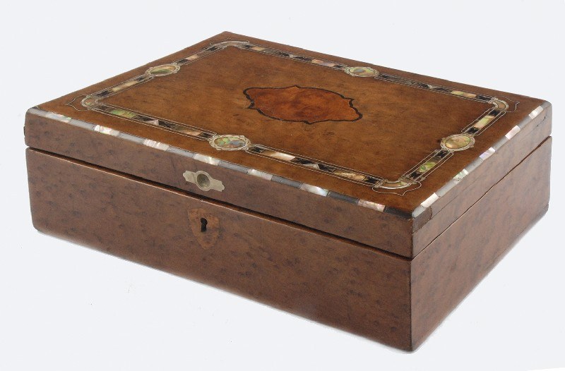 drewno, okleina, masa perłowa, metal; 11 x 33 x 21,5 cm.