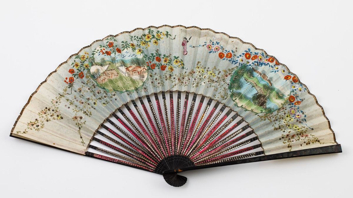 Drewno lakowane, czerwona i srebrna farba, papier, farby wodne - kwiaty, pejzaże i postać kobieca, dł. 21,5 cm