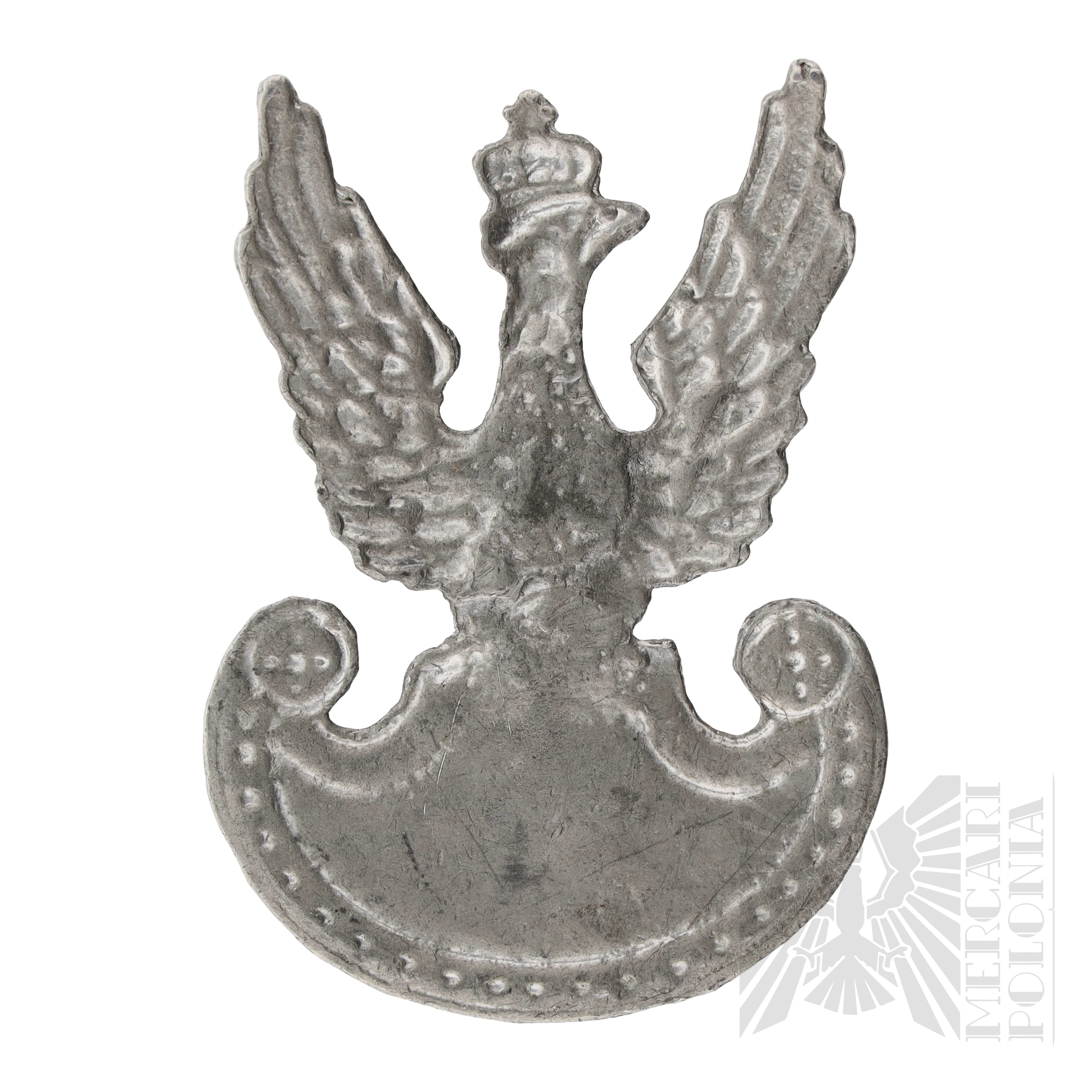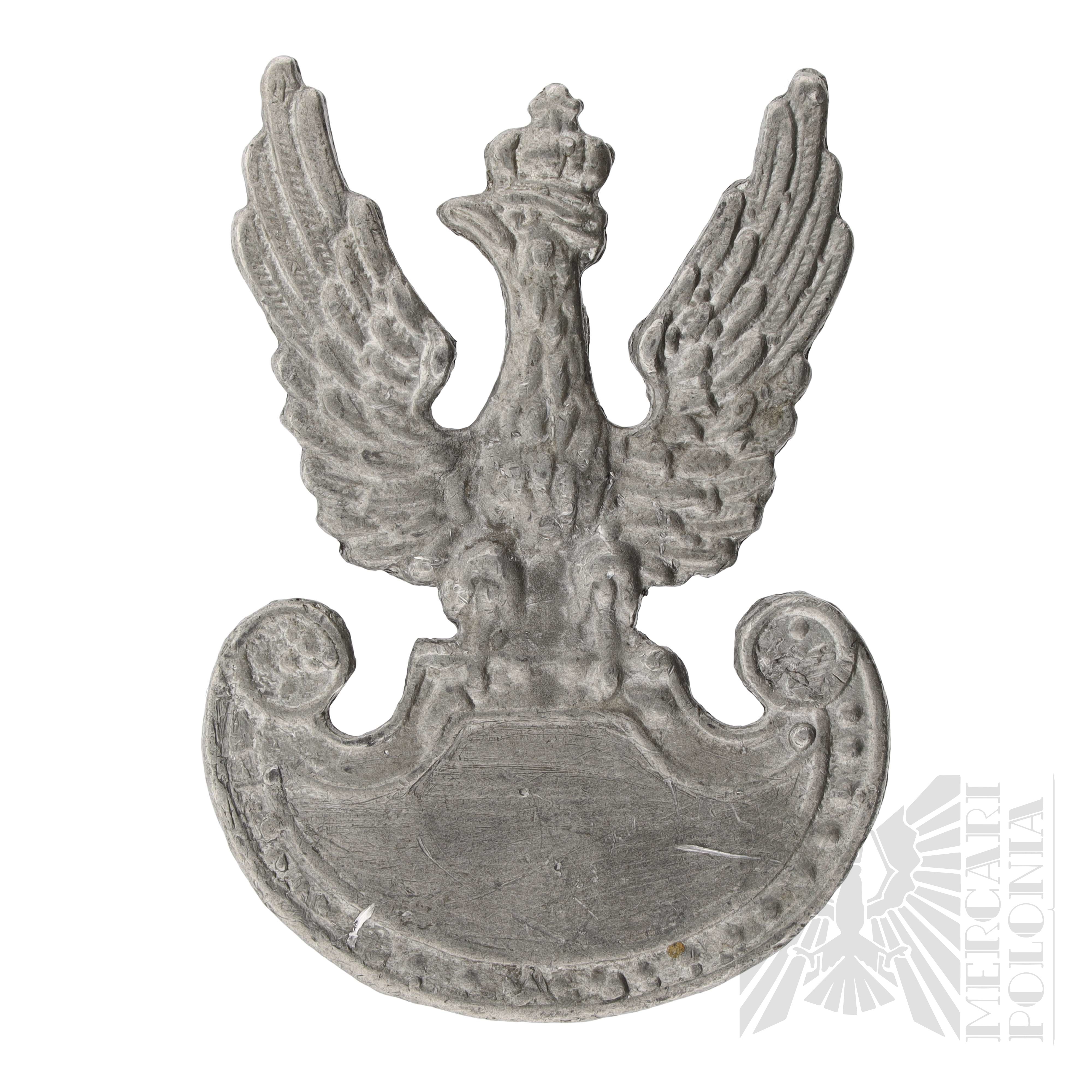 Polski orzeł na czapkę przedstawiający orła z rozpiętymi skrzydłami siedzącego na tarczy amazonek. Głowa zwieńczona zamkniętą koroną. Orzeł odlany w aluminium warsztatowa, tego typu odlewy były używane przez Polskie Siły Zbrojne na Zachodzie, Organizacje Konspiracyjne w Polsce oraz 1 Armię Wojska Polskiego.