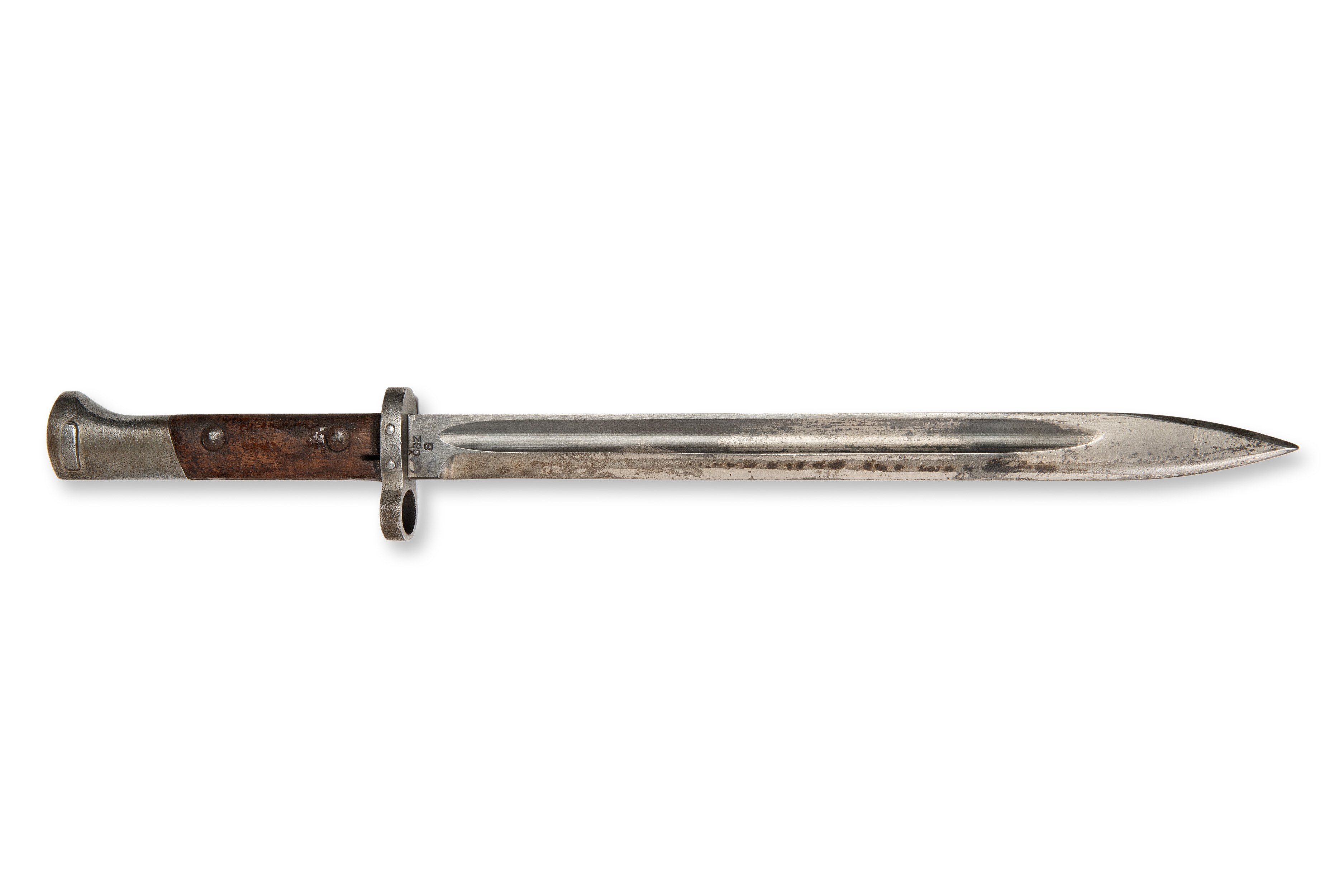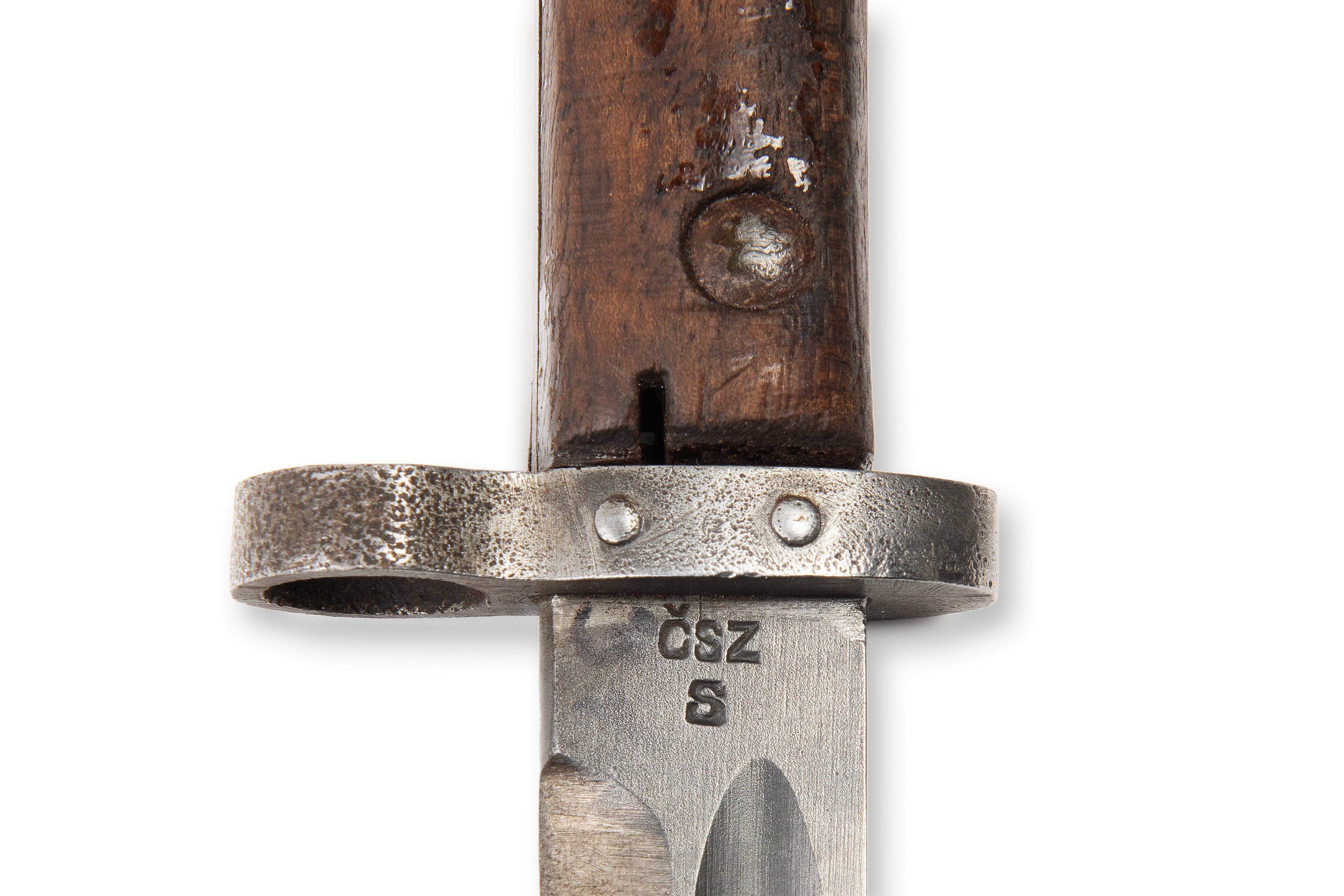 Bayonet model 24 from 1927, made in Czechoslovakia. This bayonet was intended for the Czechoslovak military units and is equipped with the signatures: "ČSZ S" (on the blade on the left), "E lev 27" (on the blade on the right) and "ZL 7703" (on the head of the handle). The bayonet is unsheathed and shows fine traces of removed corrosion on the pommel of the grip, indicating normal wear from use. This bayonet is a historical artefact and represents a valuable collector's item from the period between the two world wars.***IMPORTANT NOTICE***