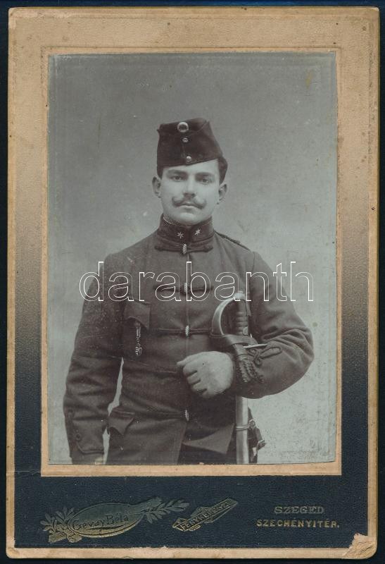 cca 1900 Huszár fotója kartonon 9x12 cm Fityegő jelvény, bőr kardbojttal