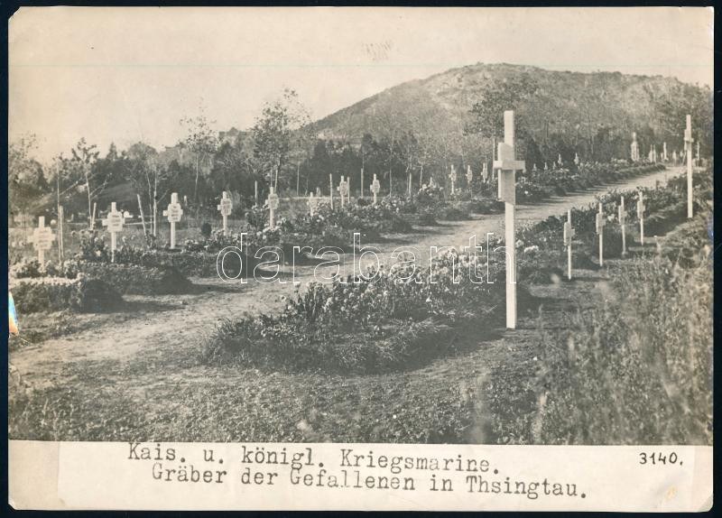 cca 1914-1918 Csingtao (Tsingtau / Tsingtao, Kína), az Osztrák-Magyar Cs. és Kir. Haditengerészet (K. u. k. Kriegsmarine) elesett hőseinek sírjai (katonai temető). Csingtao 1898-tól 1914-ig a németek által birtokolt kikötőváros volt, míg az I. világháborúban az egyesített brit és japán haderők augusztustól novemberig tartó ostrommal, a német és osztrák-magyar védőket legyőzve végül sikeresen bevették. Eredeti fotó, feliratozva, szélén kisebb sérüléssel, 22,5x16,5 cm / cca 1914-1918 Qingdao (Tsingtau / Tsingtao, China), graves of the fallen heroes of the Austro-Hungarian Navy (K. u. k. Kriegsmarine). Qingdao was a German-controlled port between 1898 and 1914, until in WWI, the combined forces of the United Kingdom and Japan successfully took the city after a 3-month siege by defeating the German and Austro-Hungarian defenders. Original photo, with description at the bottom, with slight damage on the edge, 22.5x16.5 cm