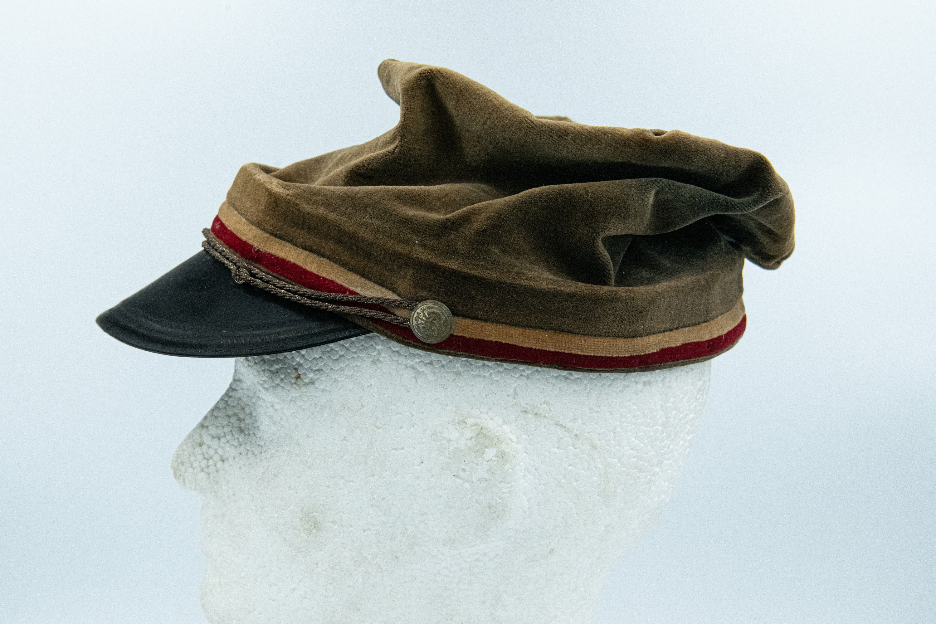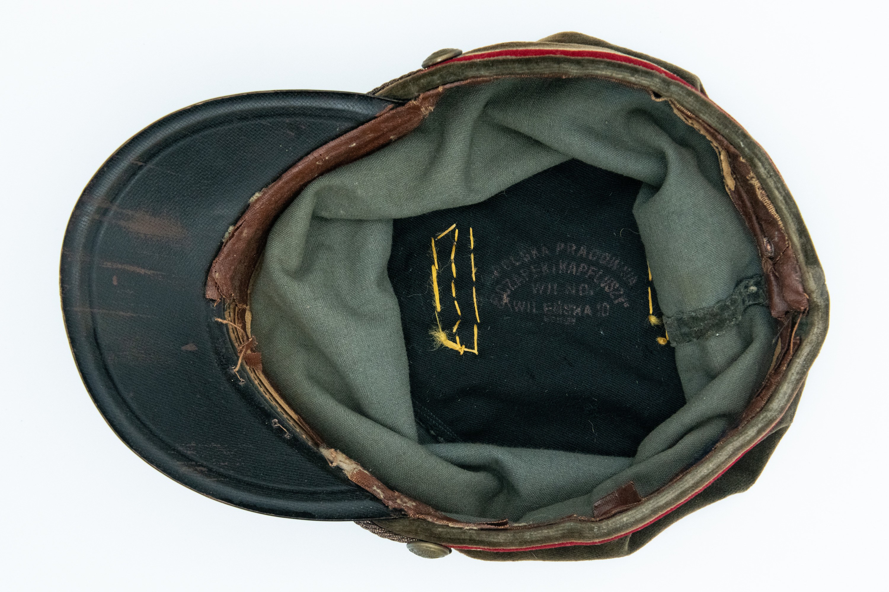 Czapka uniwersytecka, dekiel akademicki, Wilno. Wykonany z materiału w kolorze oliwkowej zieleni. Krawędź czapki biało-czerwona. Po bokach guziki z orłem w koronie z przypiętym podwójnym sznurkiem z bajorka. Daszek czapki sztywny, czarny, tworzywo sztuczne. Wewnątrz pieczątka: "POLSKA PRACOWNIA CZAPEK I KAPELUSZY WILEŃSKA 10 WILNO(?)". W górnej części naszywki (korporacja akademicka Jagiellonia) Wewnątrz ubytki, wykruszenia. Stan dobry.