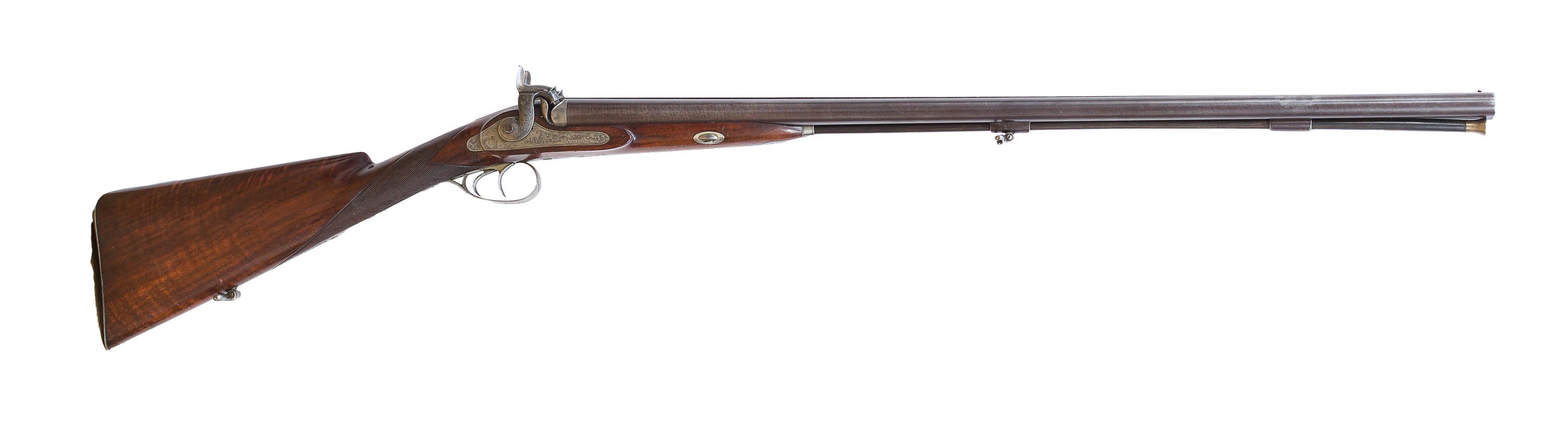L u f y giwerowane, zespolone wklęsłą listwą, mocowane do łoża przetyczką oraz śrubą na warkoczu do szyjki kolby. Z a m k i kapiszonowe, sprawne. Blachy zamków osadzone w wydrążonych gniazdach. Prawa blacha z bitą sygnaturą „A. LAUSANNE”, lewa z sygnaturą „VANNOD”. Na blachach i kurkach grawerowane motywy roślinne. Osada z jednolitego kawałka drewna orzechowego. Łoże, sięgające 1/3 długości lufy, z wydrążonym kanałem na pobojczyk. Szyjka przewężona, poprzecznie nacinana, z wyraźnie zaznaczonym grzbietem. Okucia osady – gniazda na przetyczkę, okucie wlotu kanału na pobojczyk, blachy zamków, osłona mocowania pasa nośnego oraz kapturek głowicy kolby – stalowe, z grawerowanymi motywami roślinnymi. Wysoka jakość wykonania.