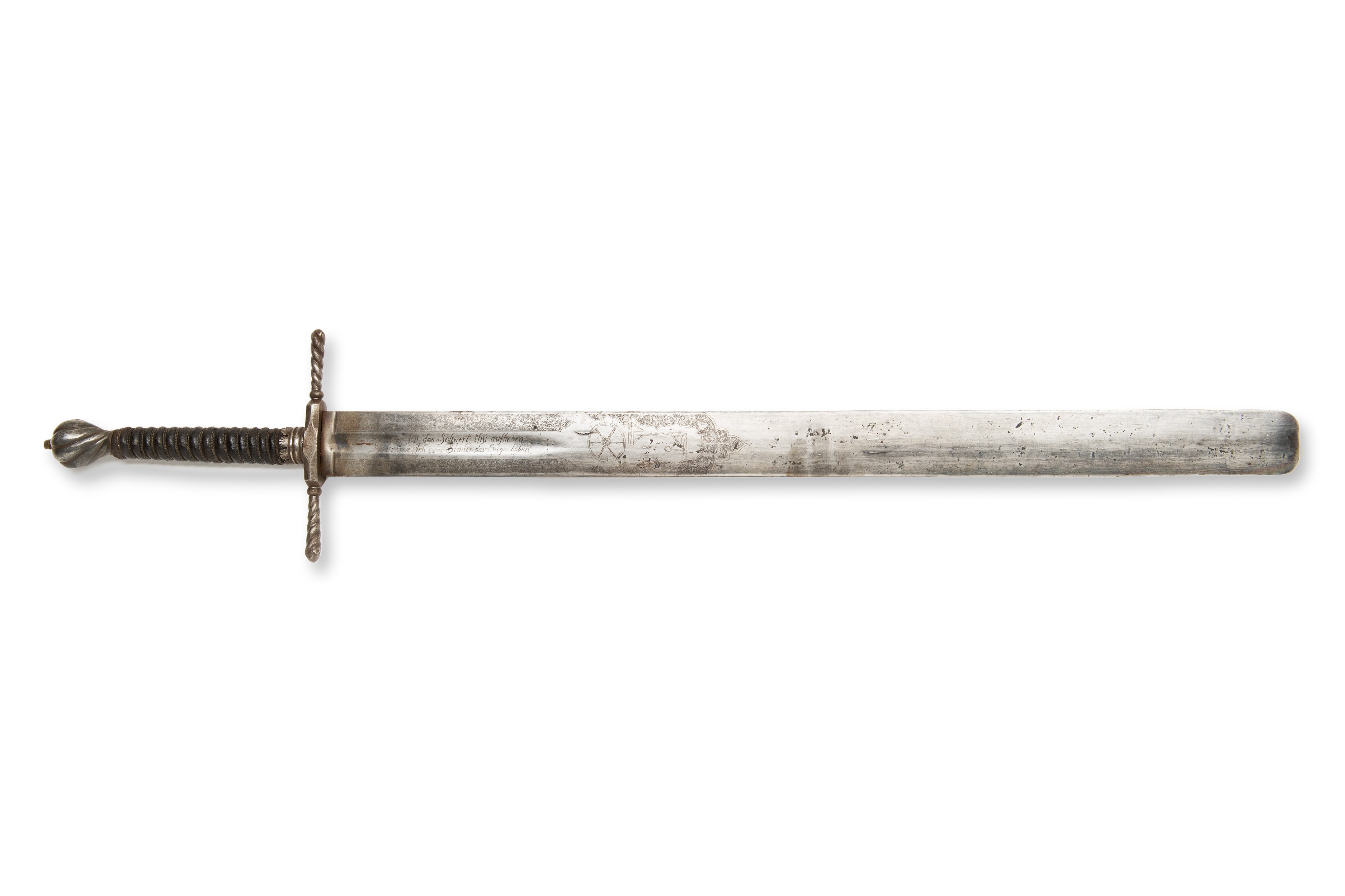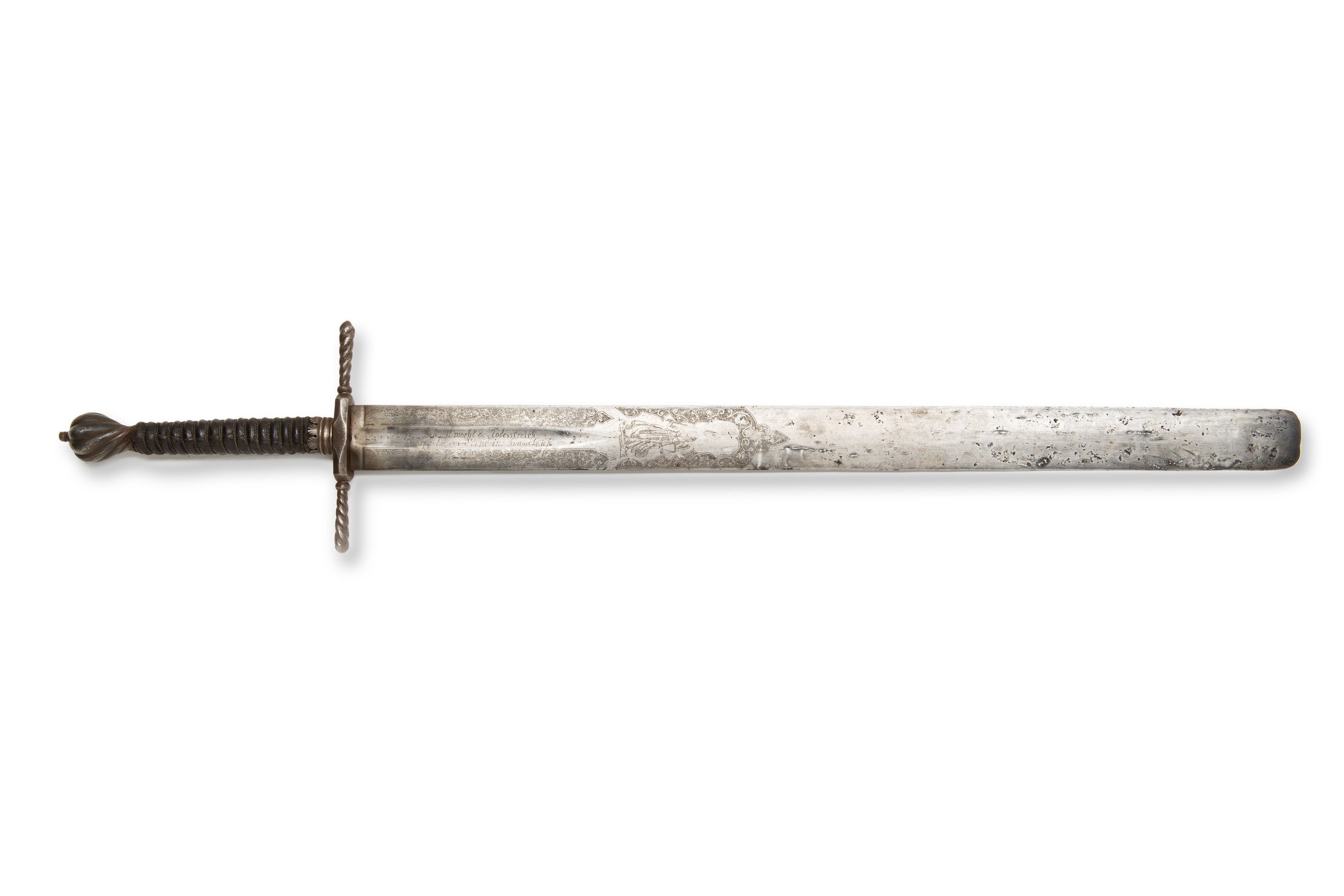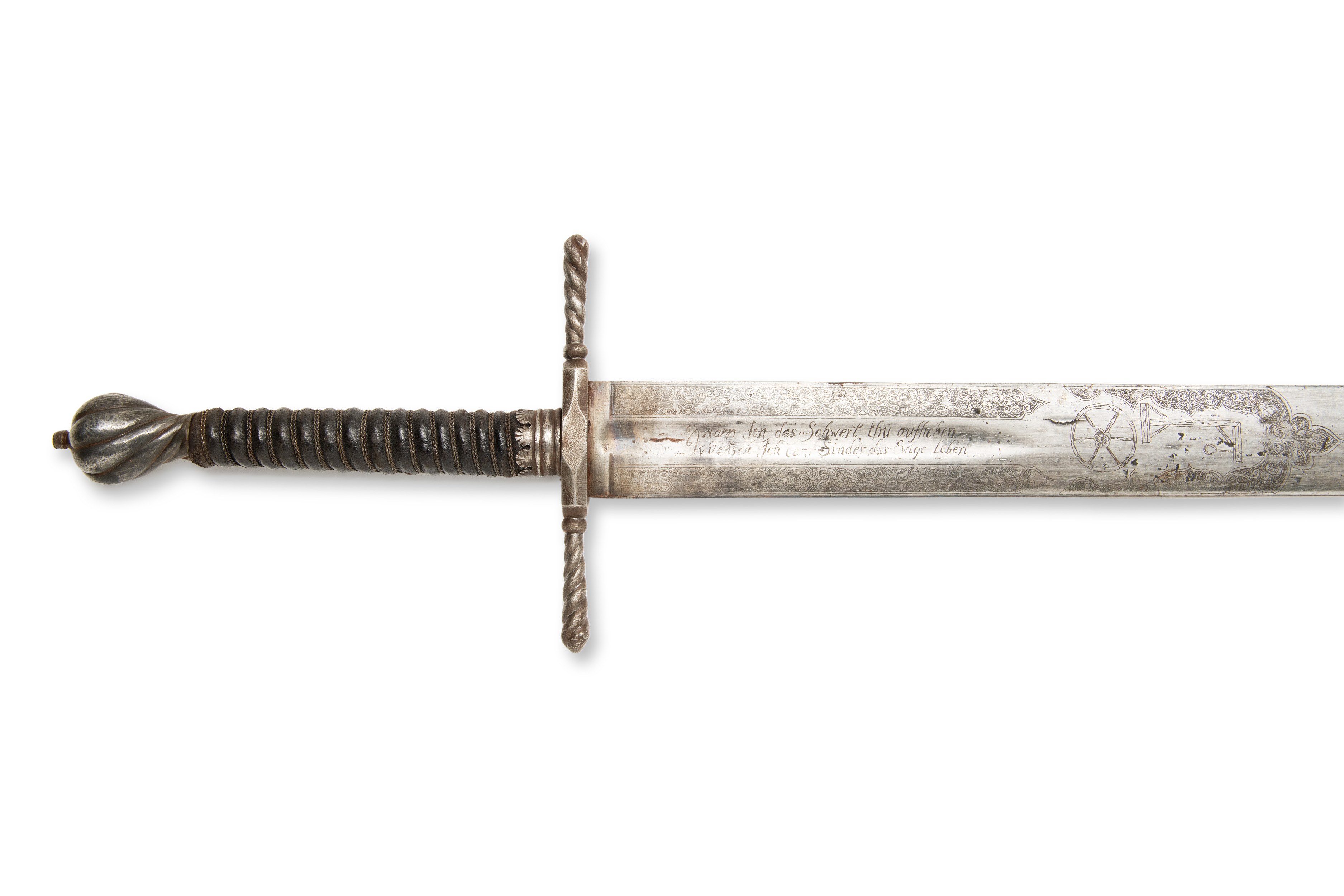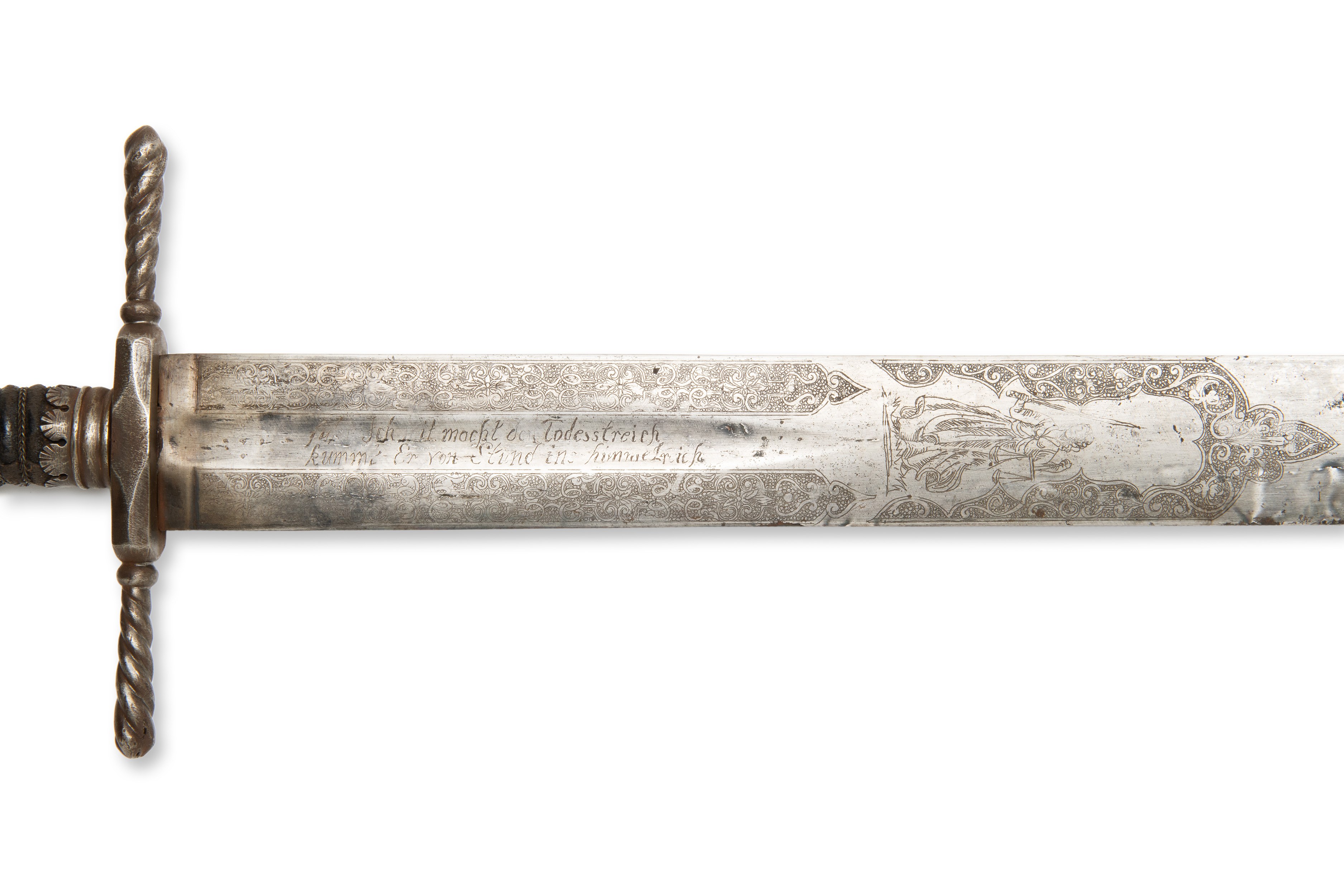 Executioner's sword from the 19th century (historicism), without scabbard. The blade is engraved with the inscription "Wann ich das Schwert thu aufheben, wünsch ich dem Singer das ewige Leben", which translates to "When I raise my sword, I wish the singer eternal life". This sword is a symbol of historical executions and rituals, with a strong ethical or philosophical message engraved on the blade.***IMPORTANT NOTICE***