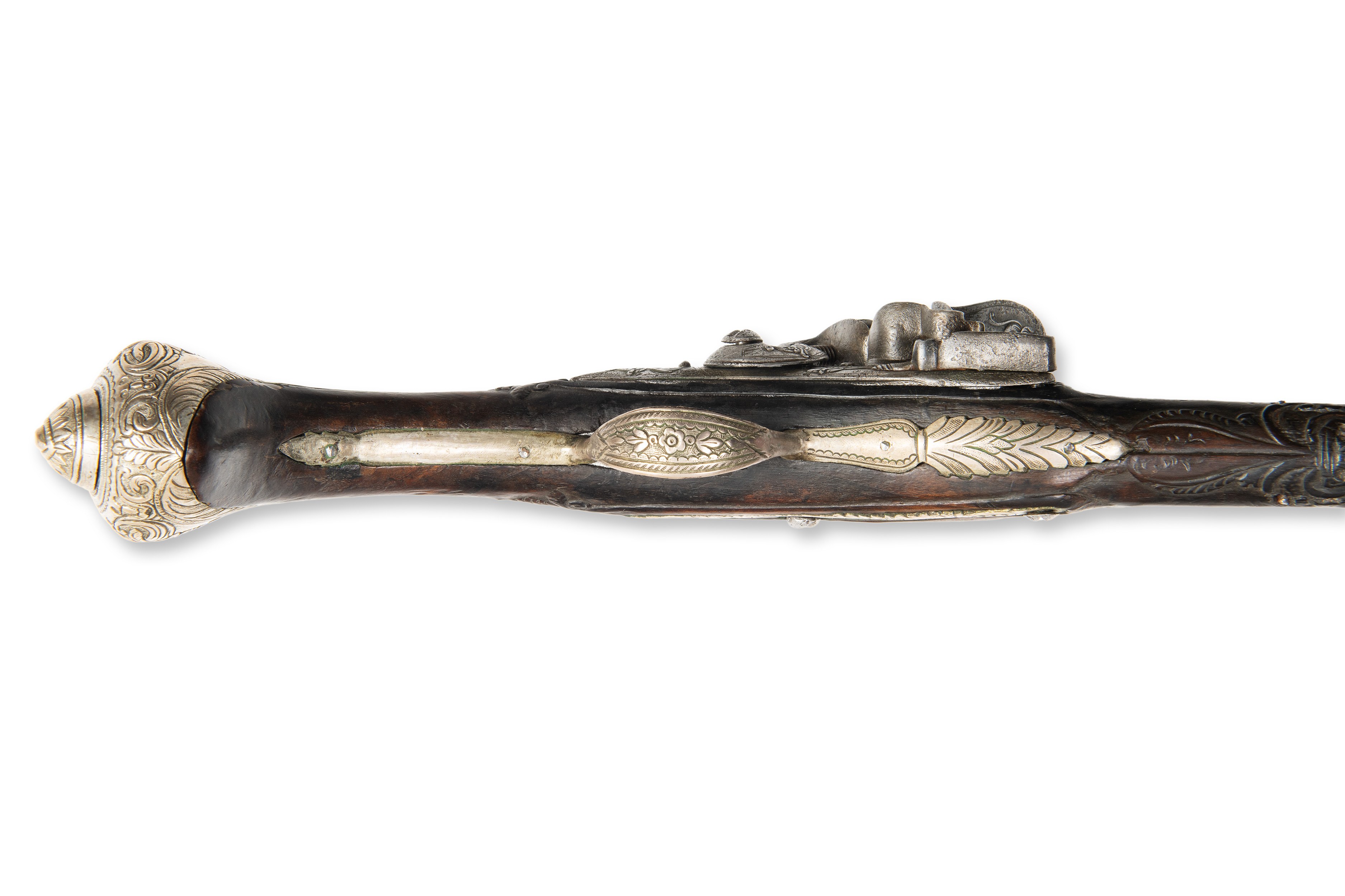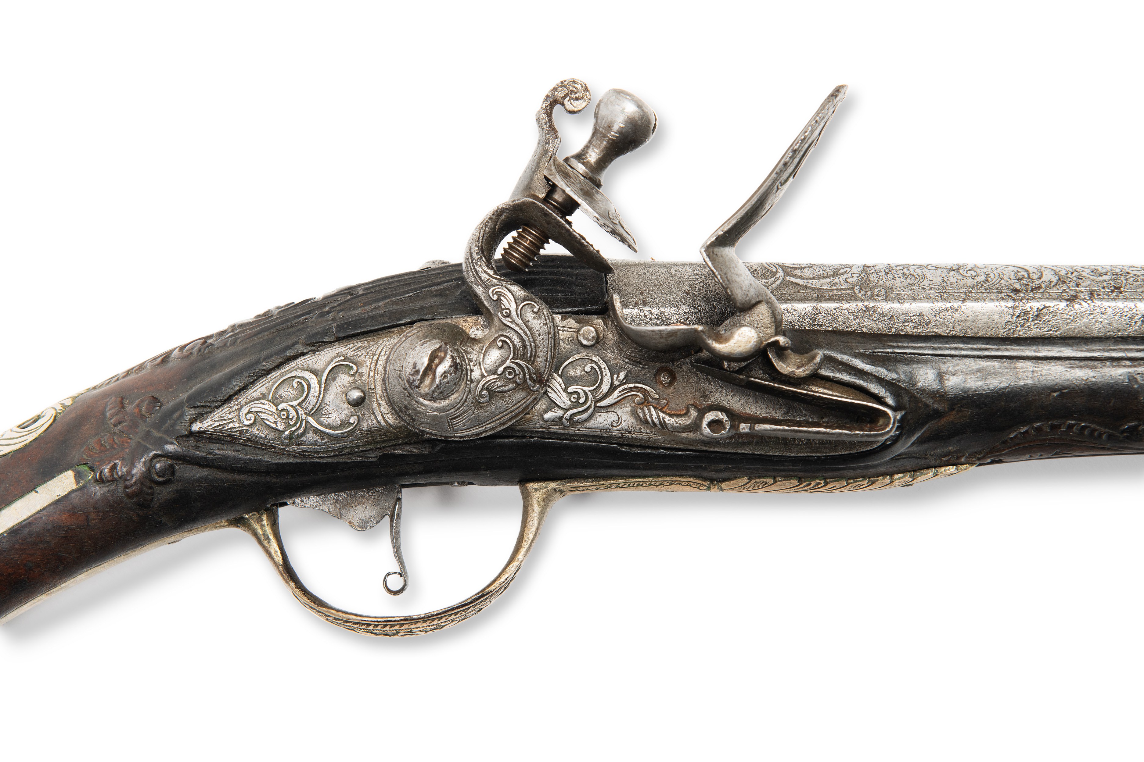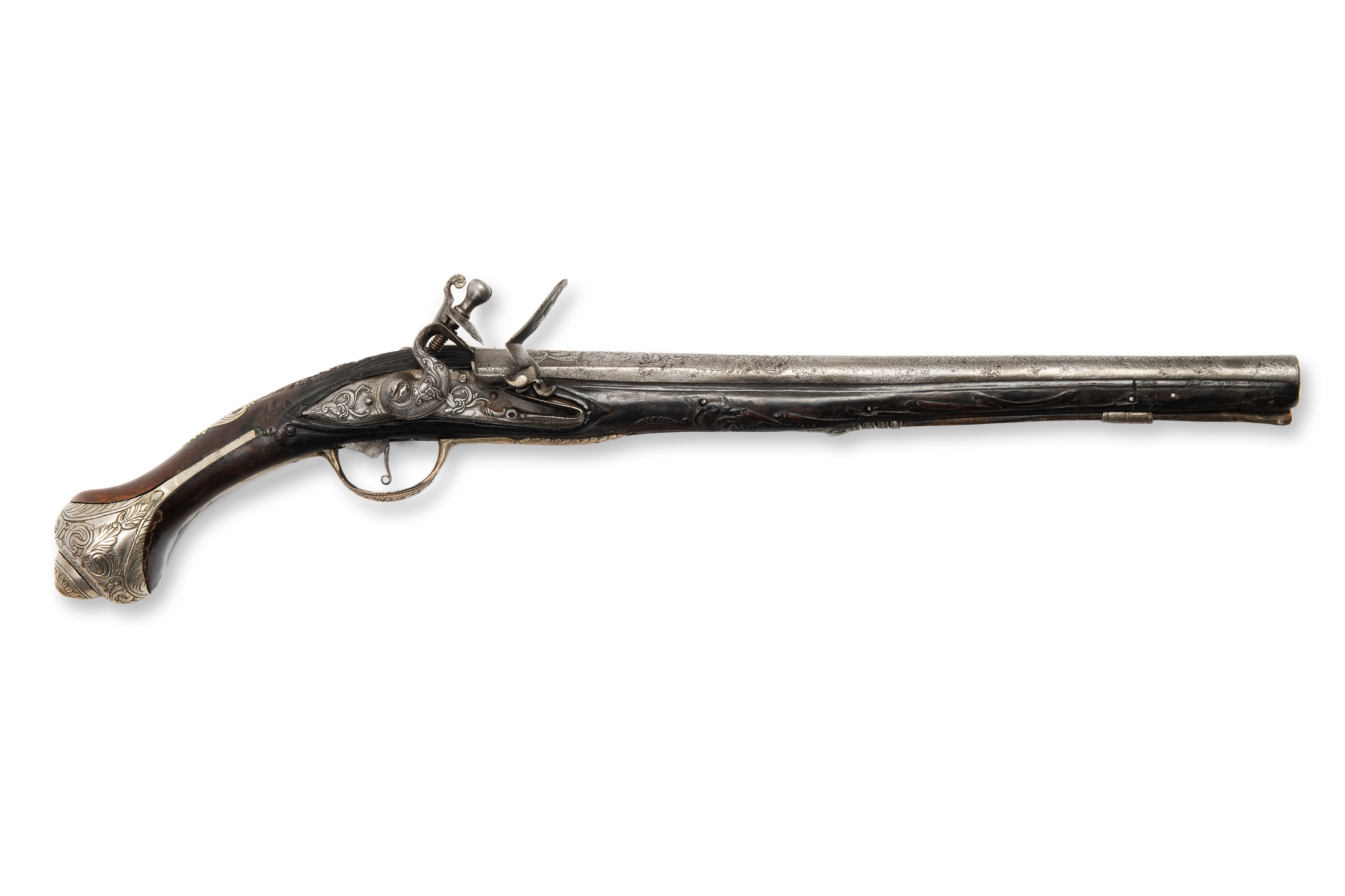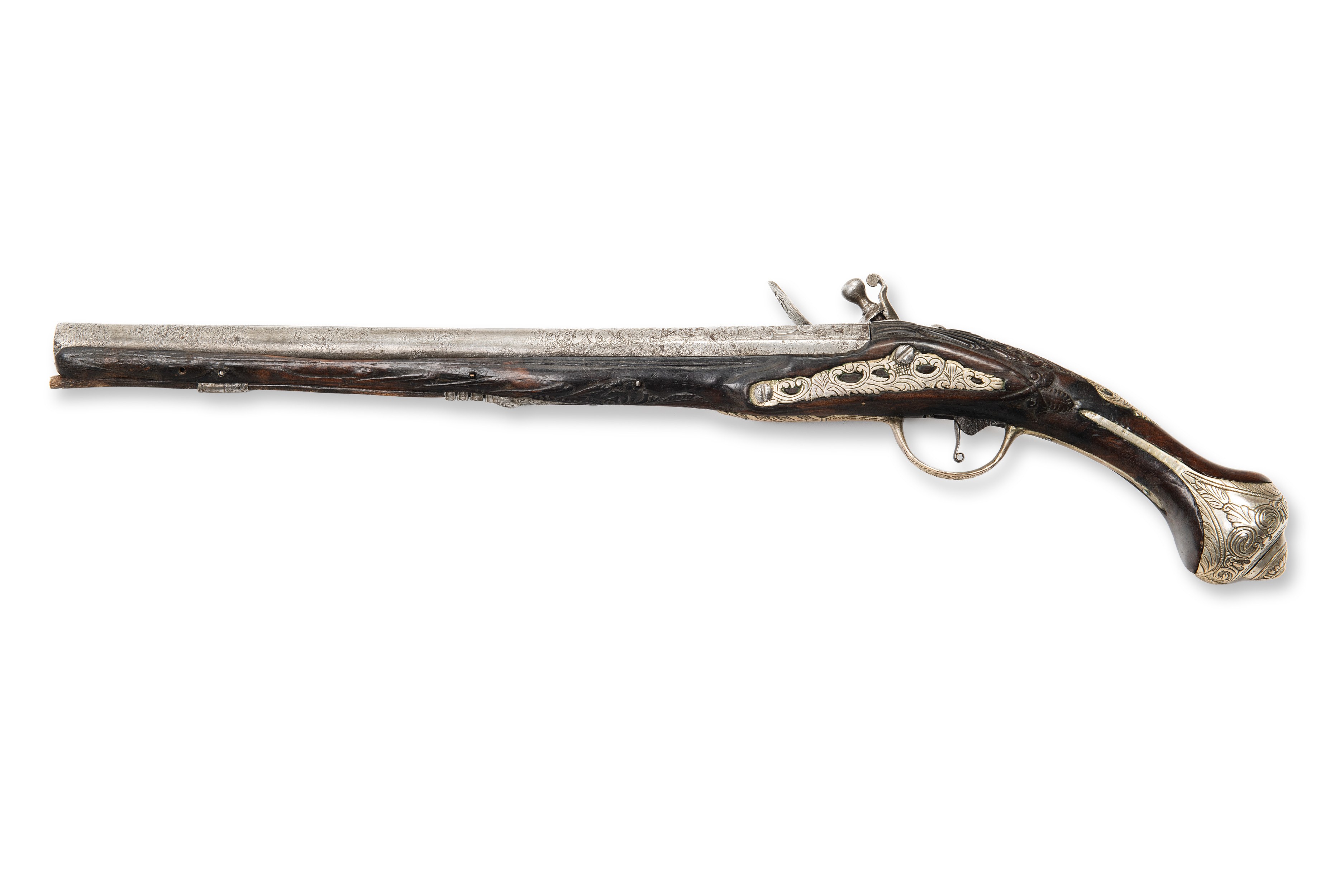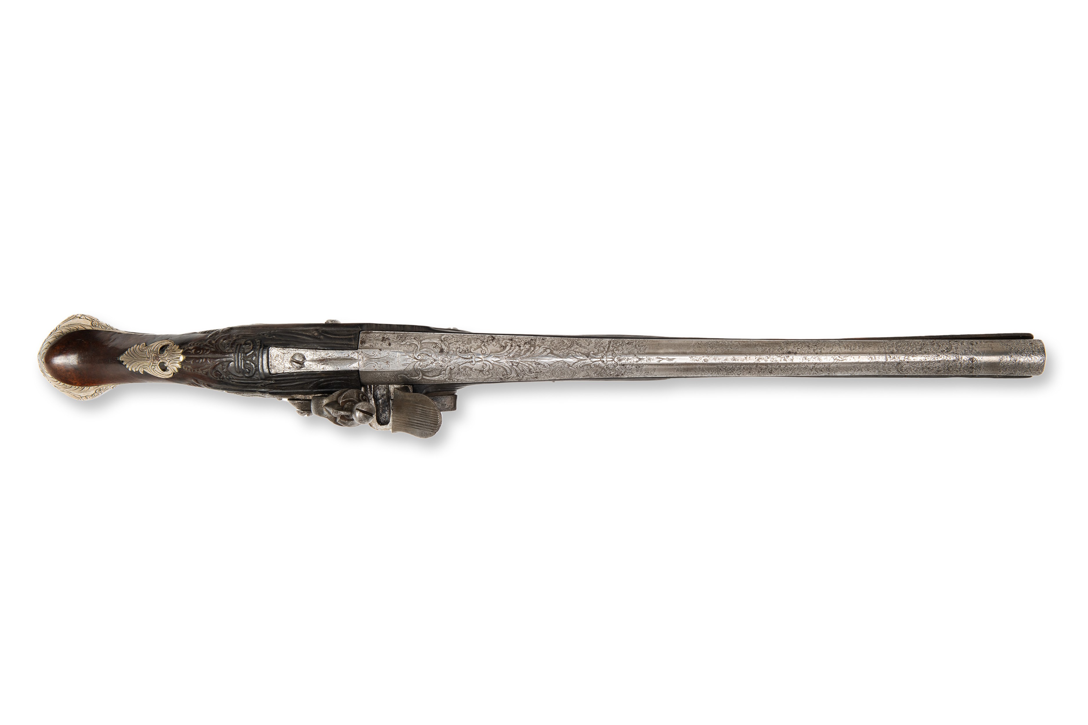 A flintlock pistol from around 1800, originating from Southern Europe. The weapon is richly decorated with relief decoration on the barrel, lock and garnish, which is characteristic of weapons of that time. There are traces of removed corrosion on the barrel and the forend is cracked at the front. This pistol was likely used in military or civilian applications and is prized for its decorative value as well as historical significance.***IMPORTANT NOTICE***