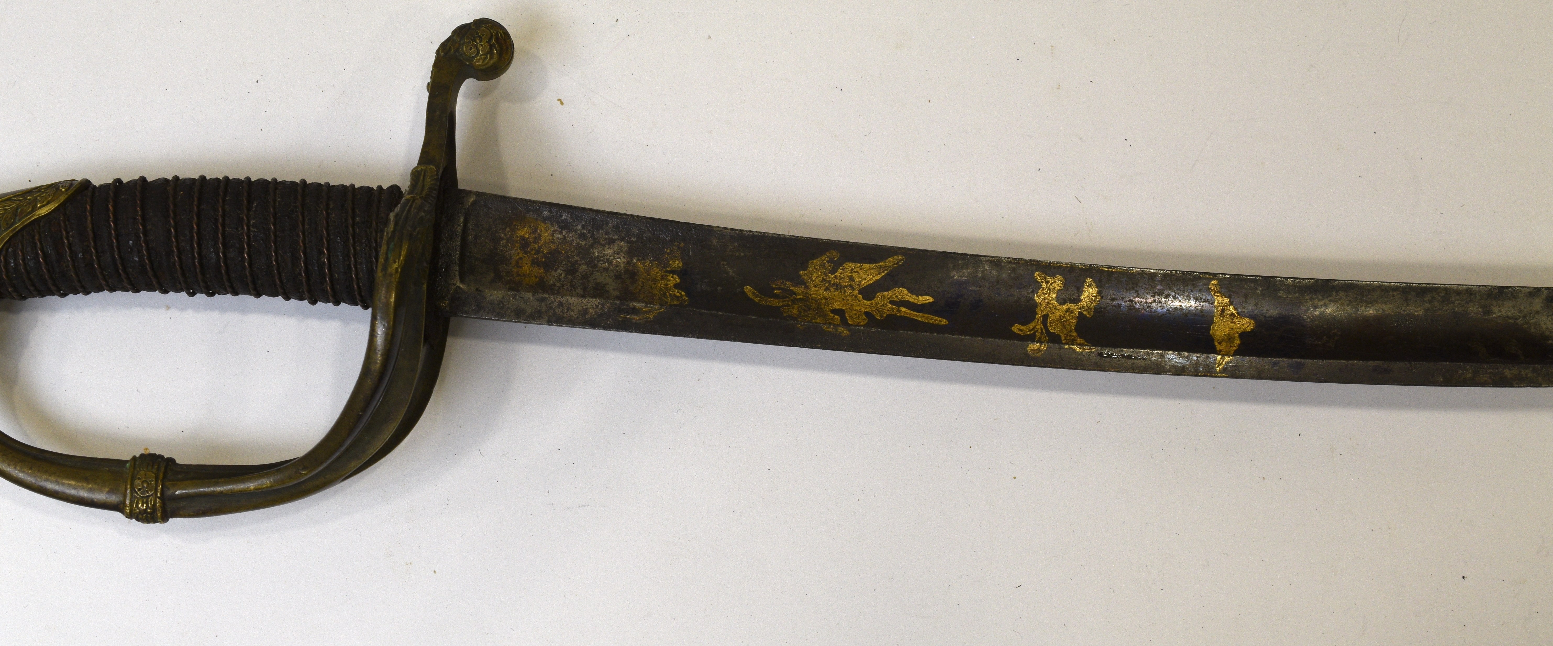 Głownia w dobrym stanie z zachowanym czernieniem i złoceniem.