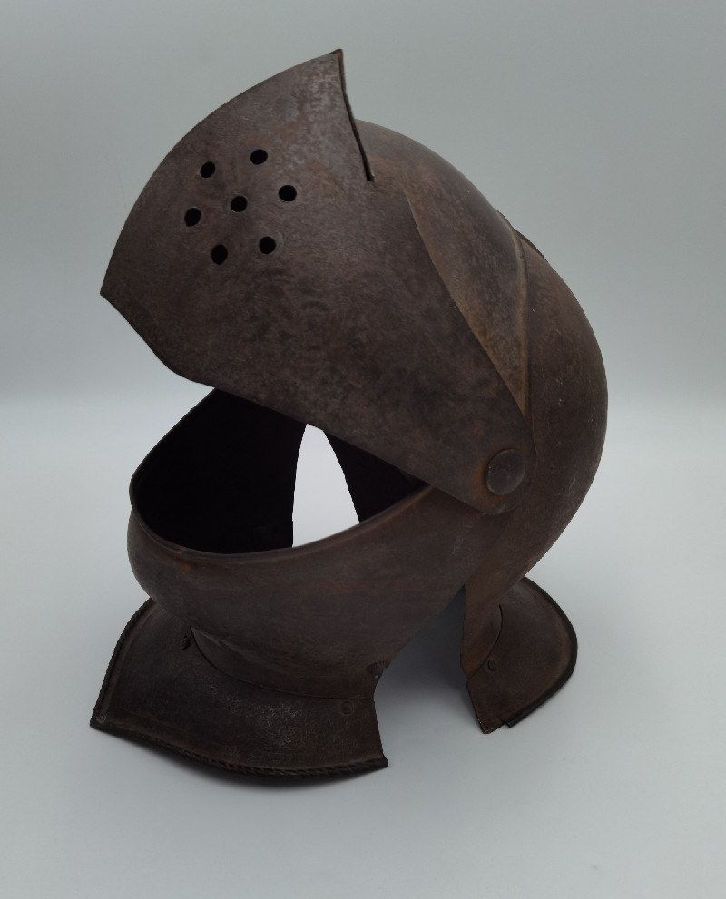gładki, kulisty dzwon z dwu blach spojonych pionowym szwem; zasłona z podbródkiem i obojczykiem oraz częścią ruchomą - na dwóch umieszczonych po bokach osiach, z kolistymi otworkami od frontu, tworzącymi szpary wzrokowe;