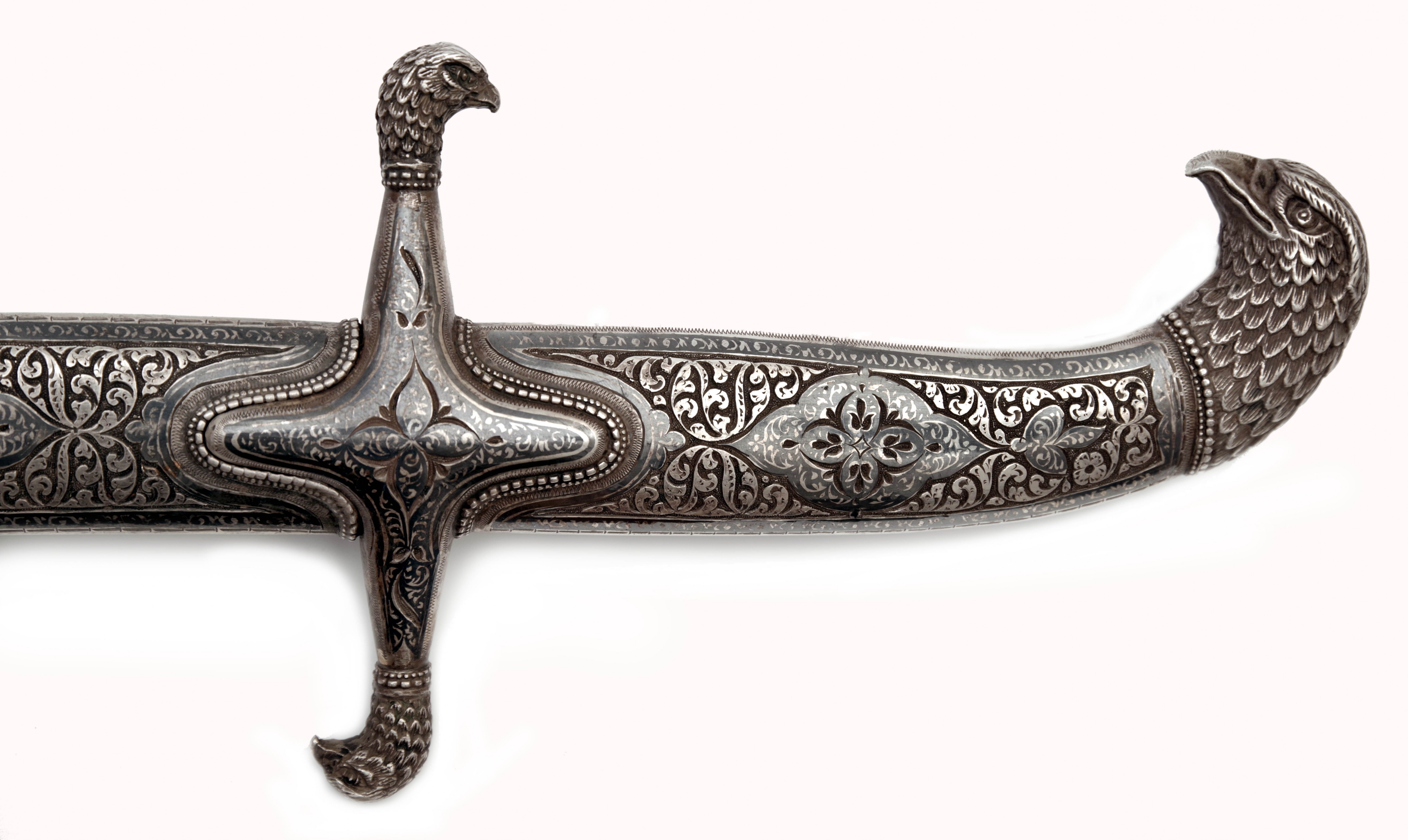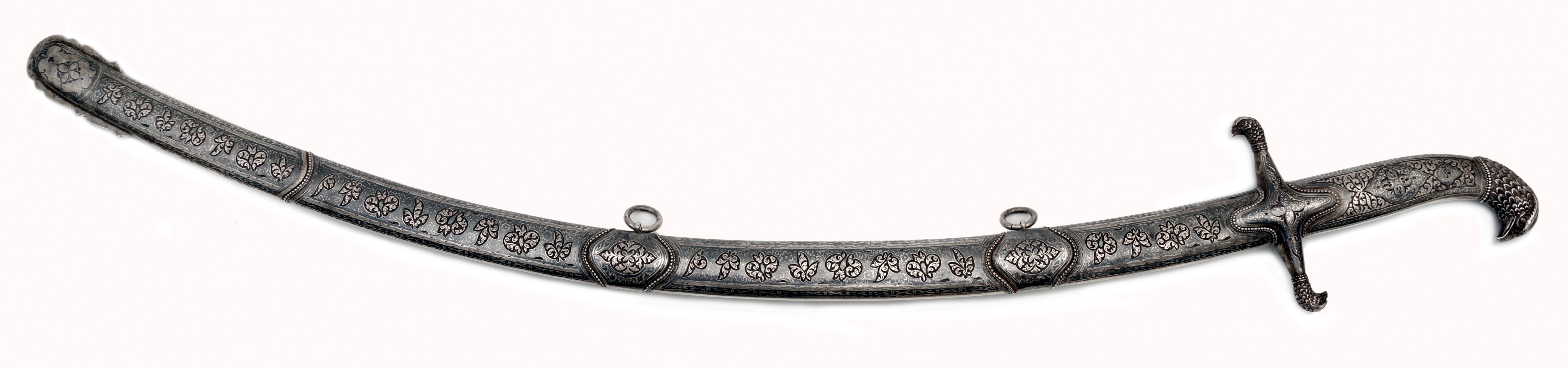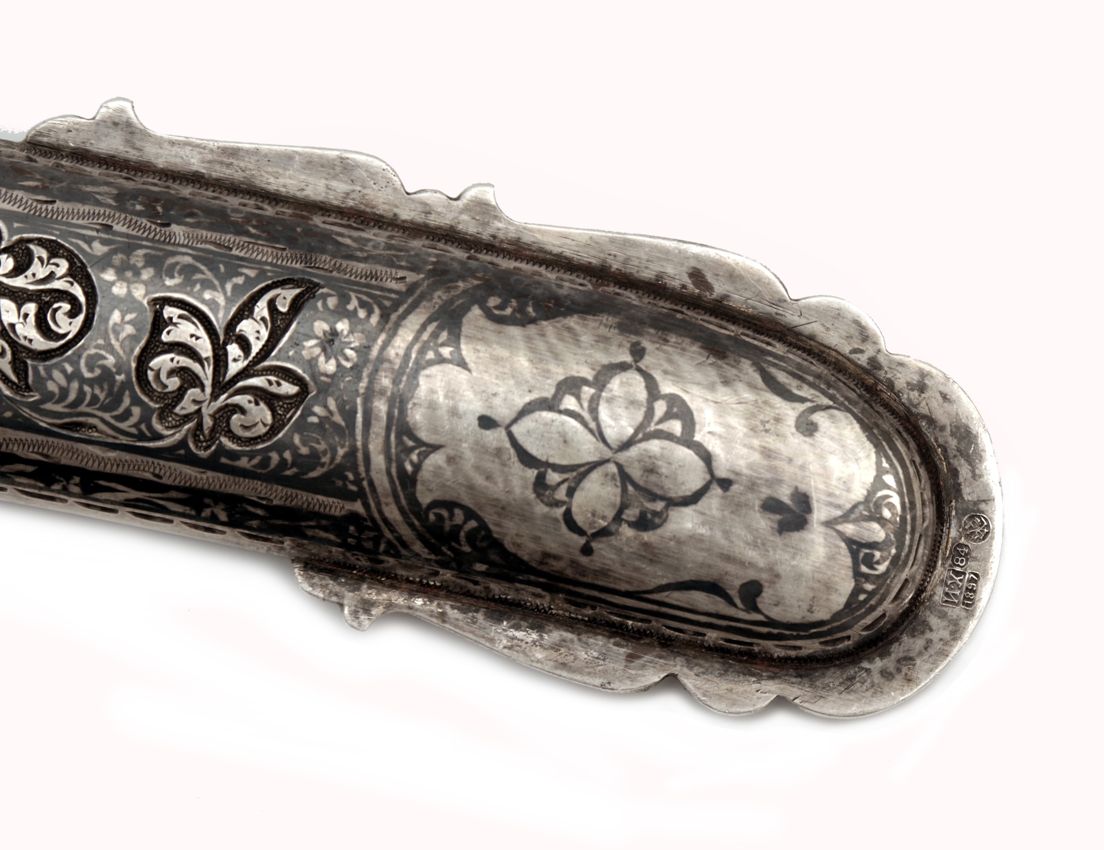 Stříbro o ryzosti 875/1000. Zakřivená čepel z damascénské oceli s oboustrannými dvojitými hřbetními rýhami, hřbetním hrotem a falešným ostřím. Carský orel leptaný z pohledové strany, na opačné straně erb knížete Windisch-Grätze. Jílec stříbrný, rytý, cizelovaný a puncovaný, zdobený nielem. Křížová záštita zakončená orlími hlavami. Hlavice v podobě orlí hlavy. Shodně dekorovaná stříbrná pochva zakončená volnými závěsnými kroužky. Ruské puncovní značky na nákončí pochvy. Carské Rusko 1897, délka 96 cm. Hmotnost stříbra 800 g, celková hmotnost 1398,40 g. Stav 1-