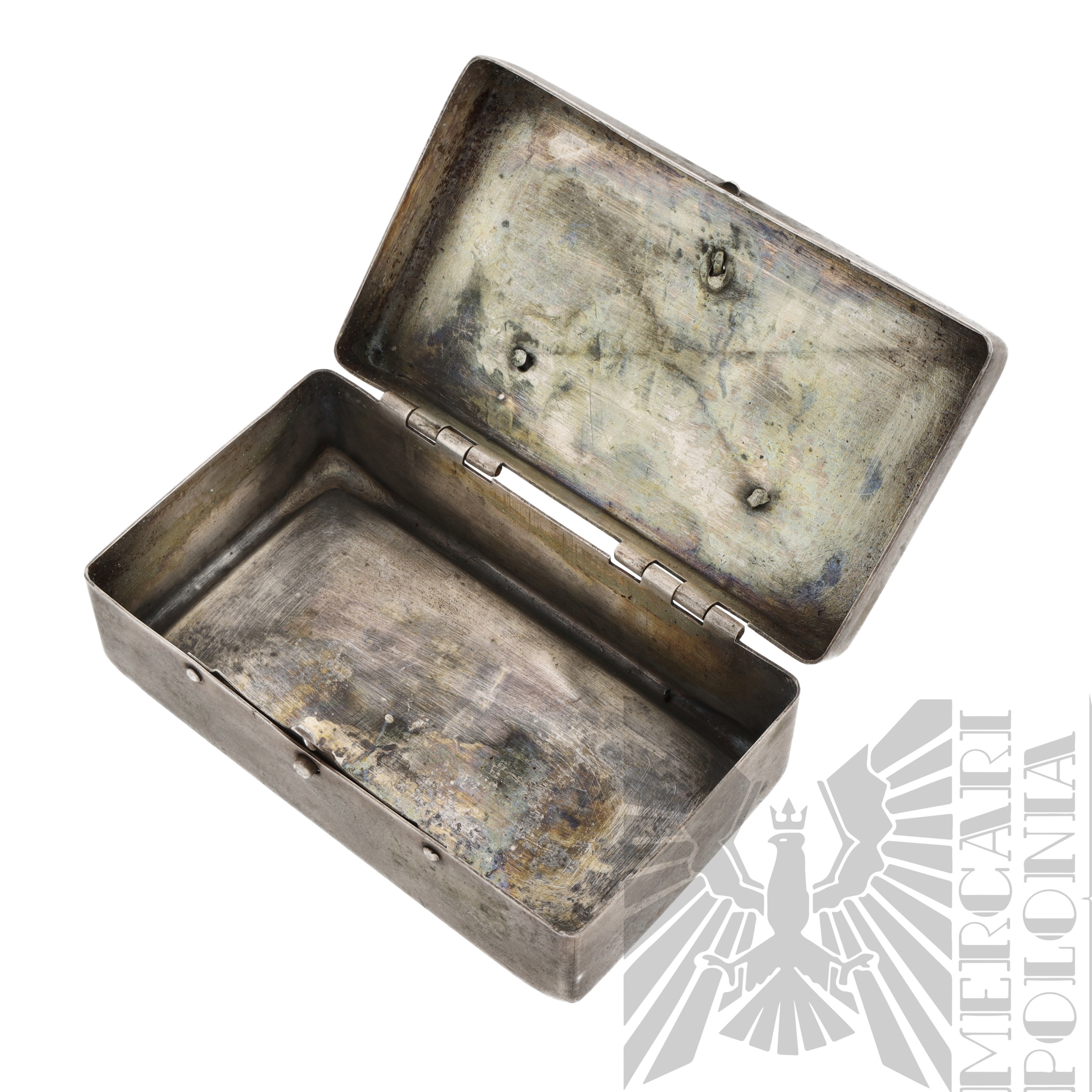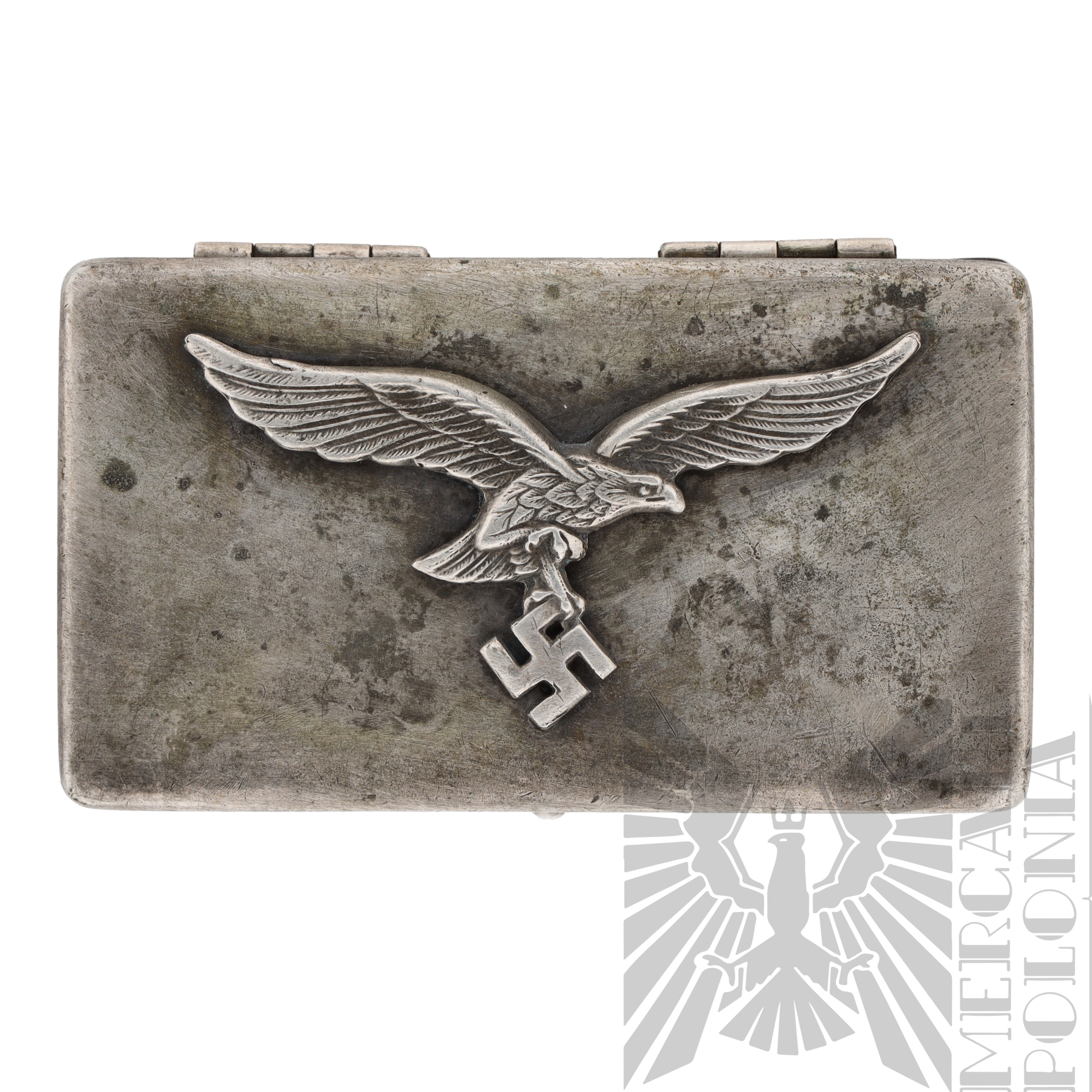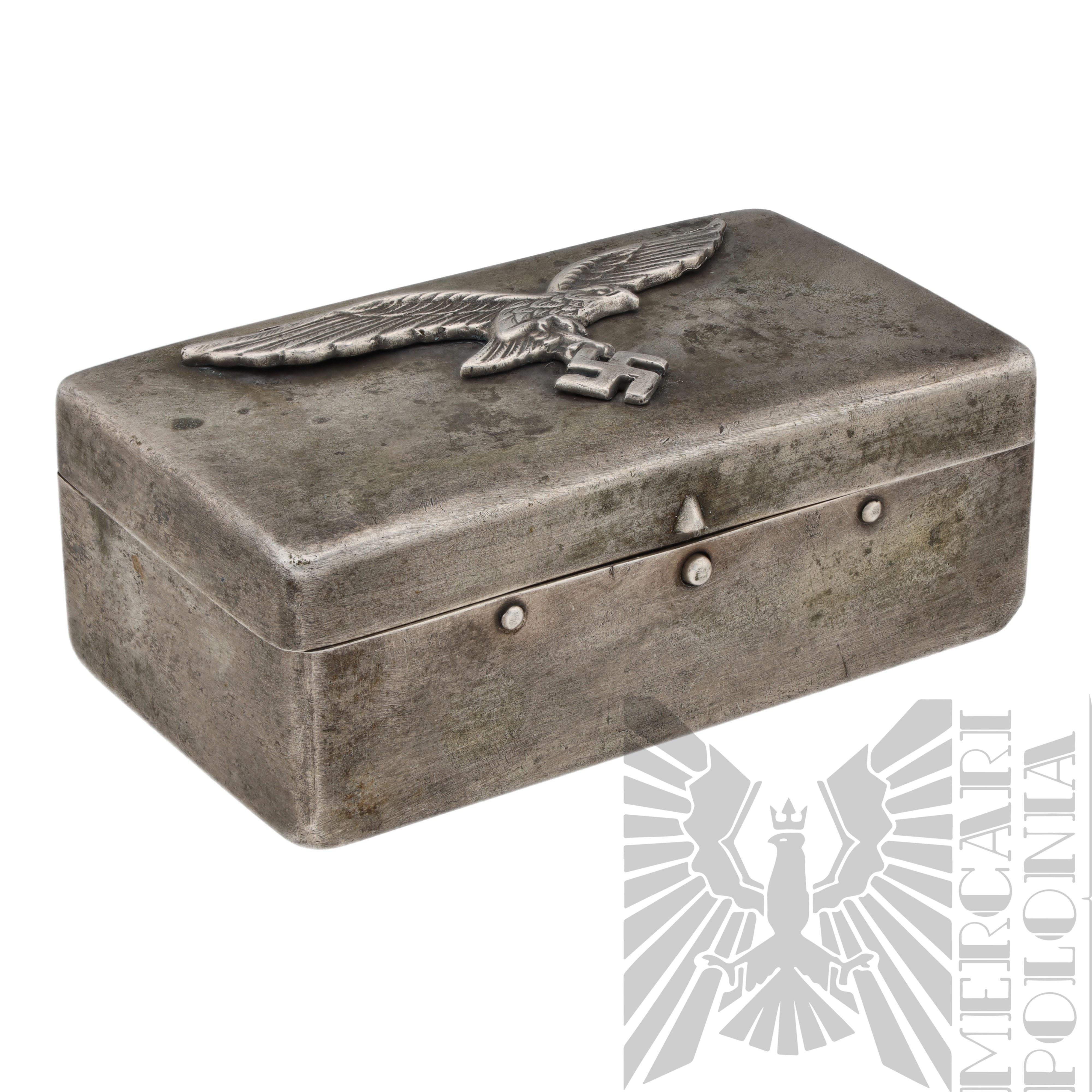 Metalowa szkatułka z okresu III Rzeszy z nałożoną na wieczku metalową gapą z orłem Luftwaffe trzymającego w szponach swastykę. Zamknięcie sprawne.