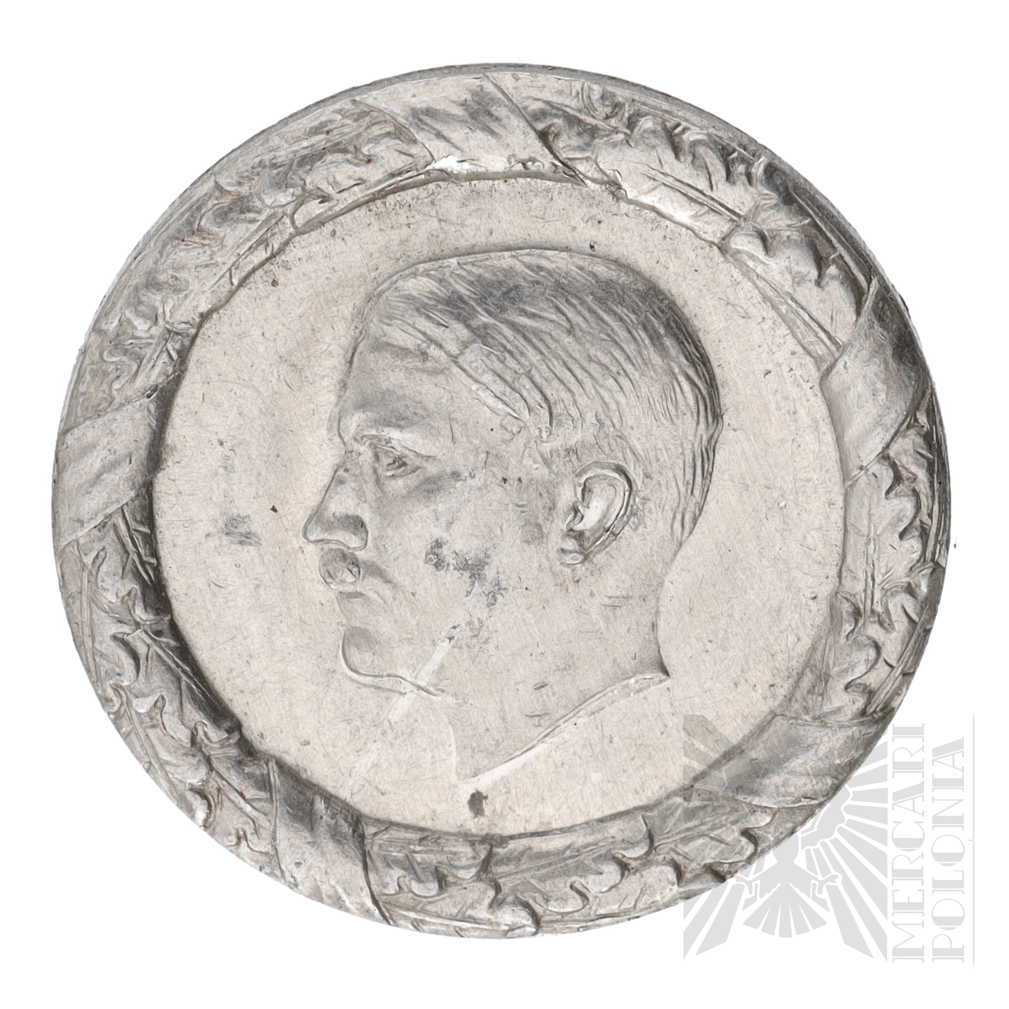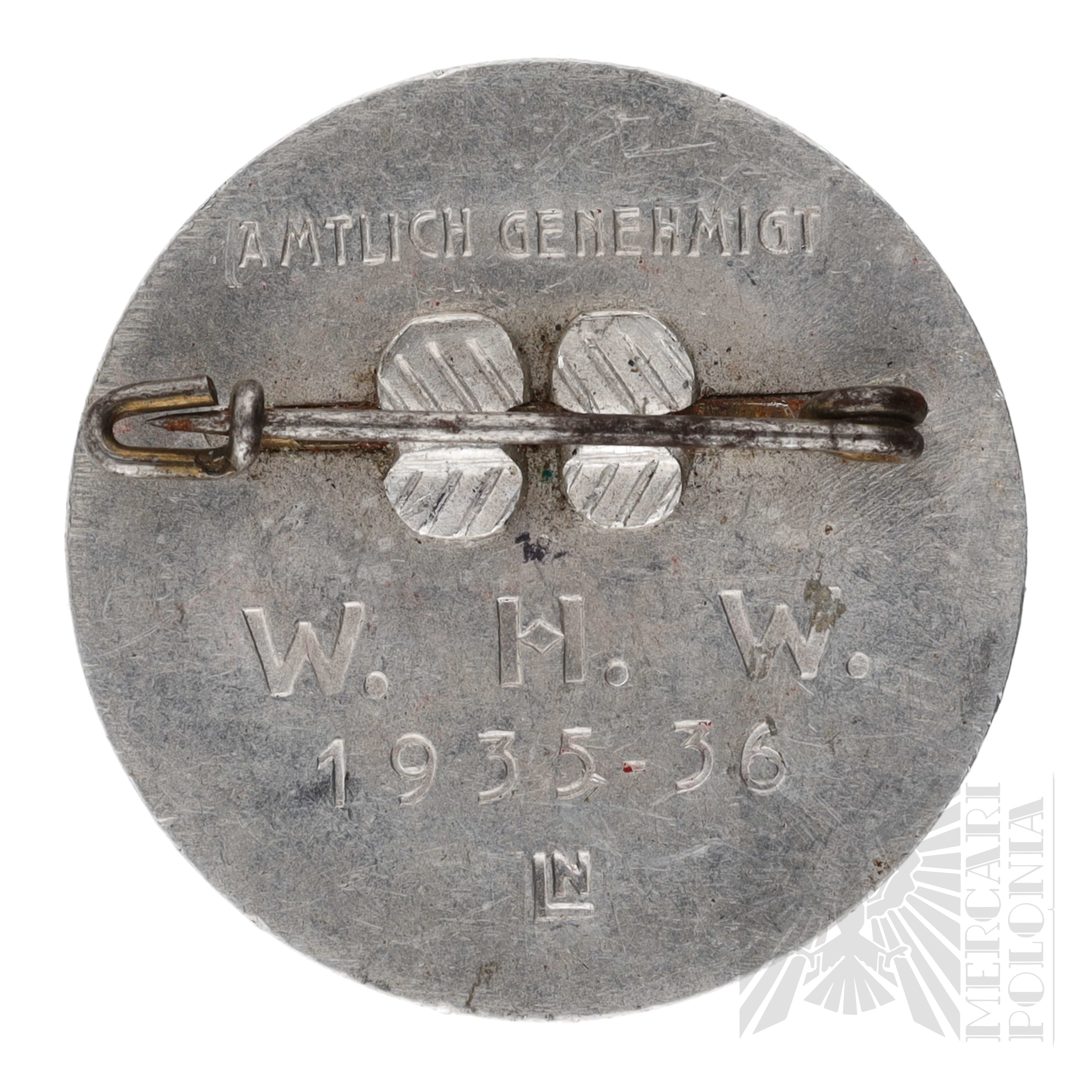 Odznaka Niemieckiej Pomocy Zimowej. Na awersie wizerunek Hitlera Średnica 3 cm, na agrafke, sygnowana na rewersie “AMTLICH GENEHMIGT W.H.W 1935 . 36 LN"
