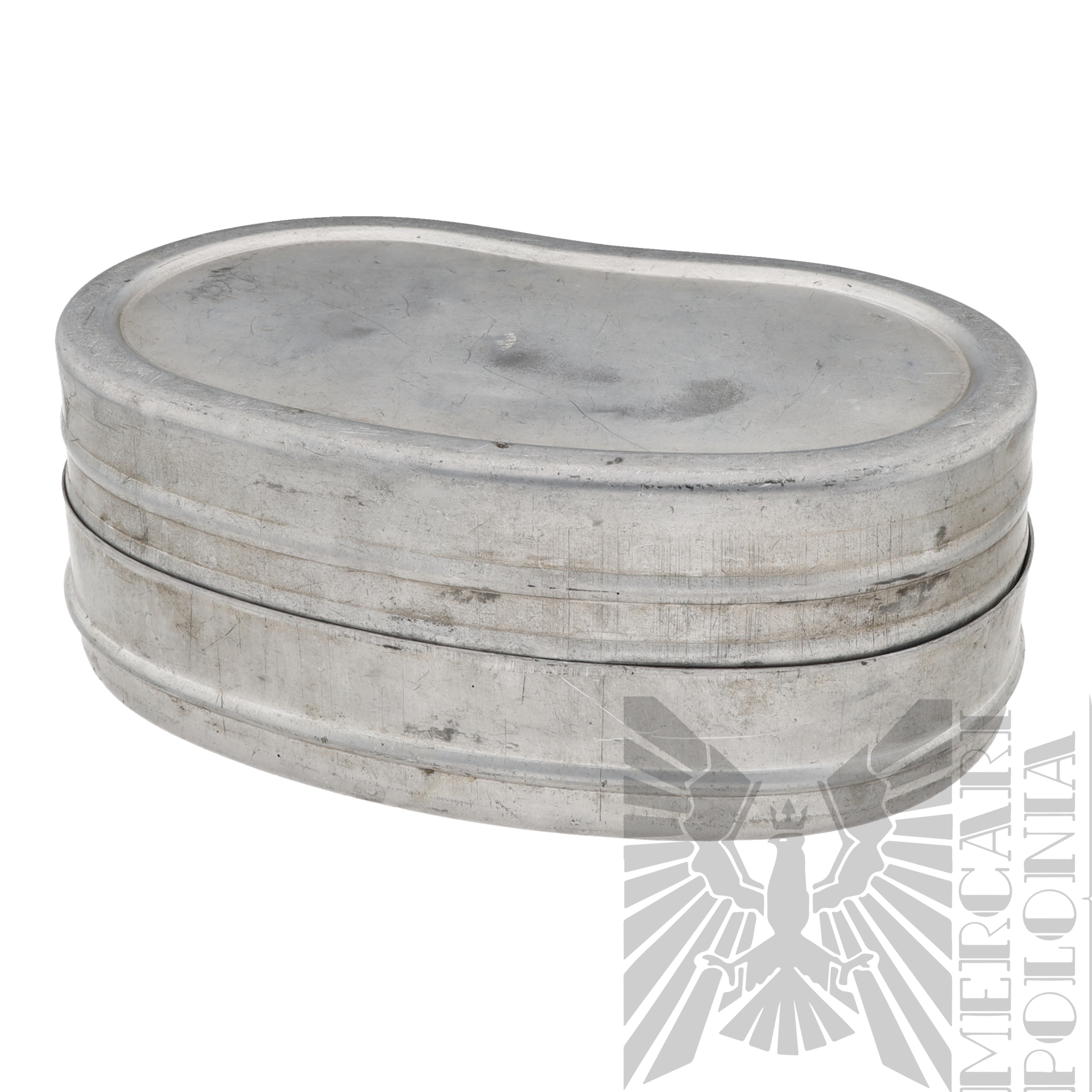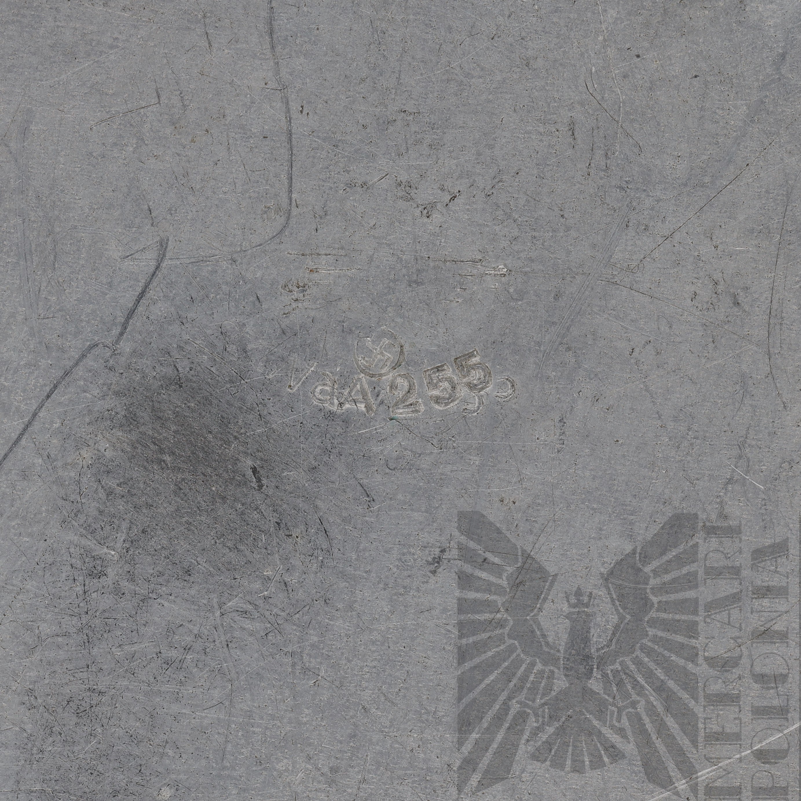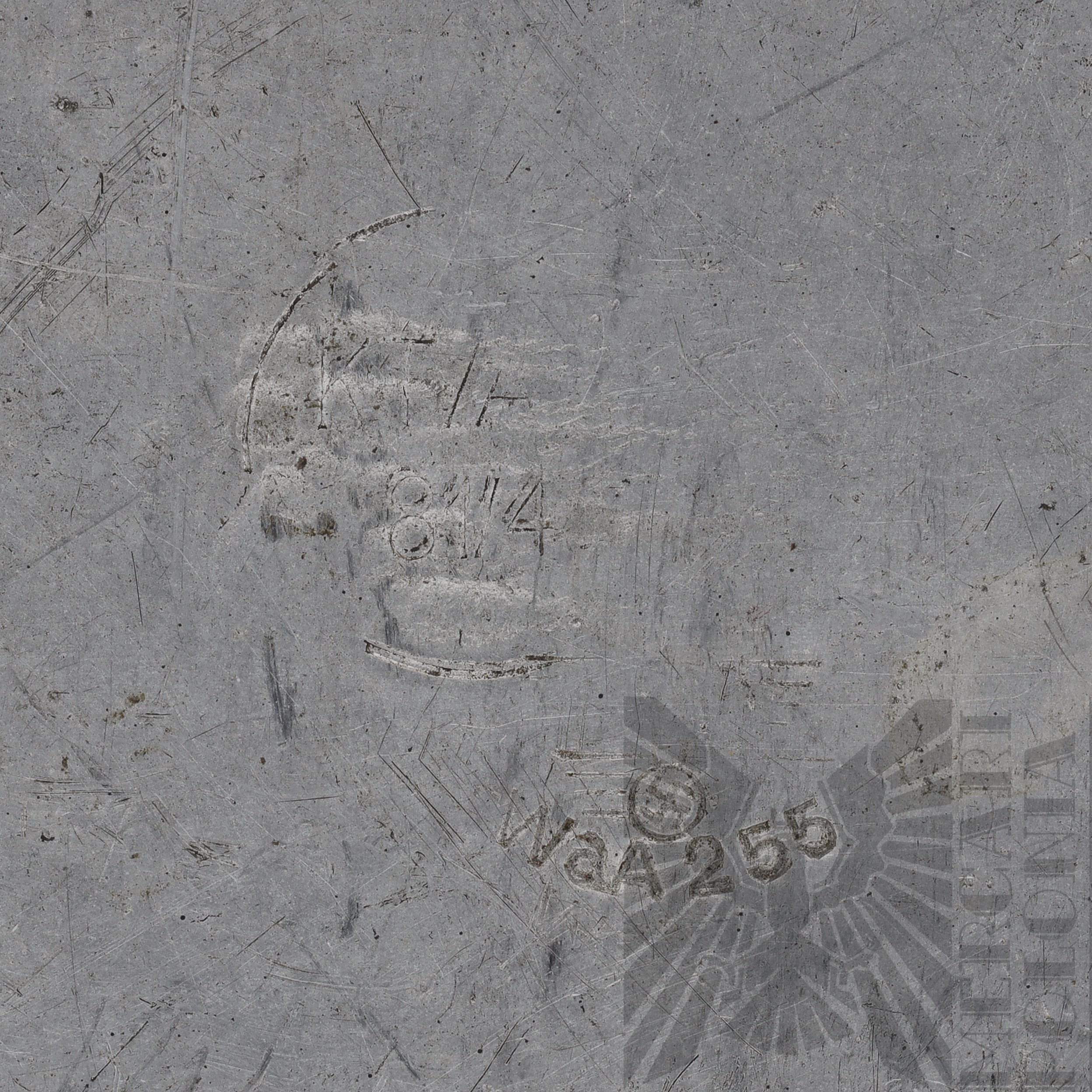 Przydziałowa puszka Wehrmachtu na racje żywnościowe lub pieczywo, posiada ona stemple odbioru wojskowego “Waffenamt” oraz wytartego orła ze swastyką, sygnowana “WaA 255”.