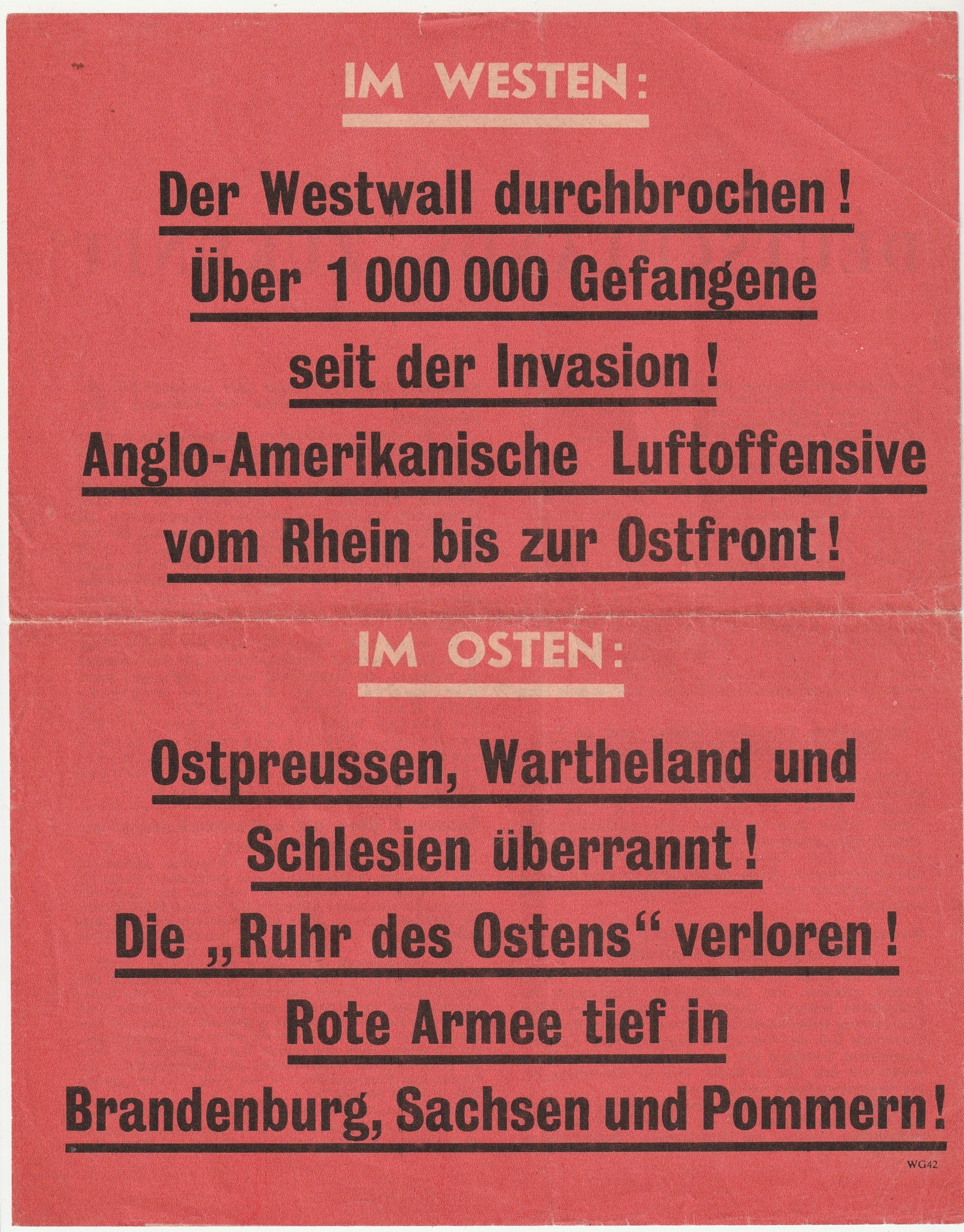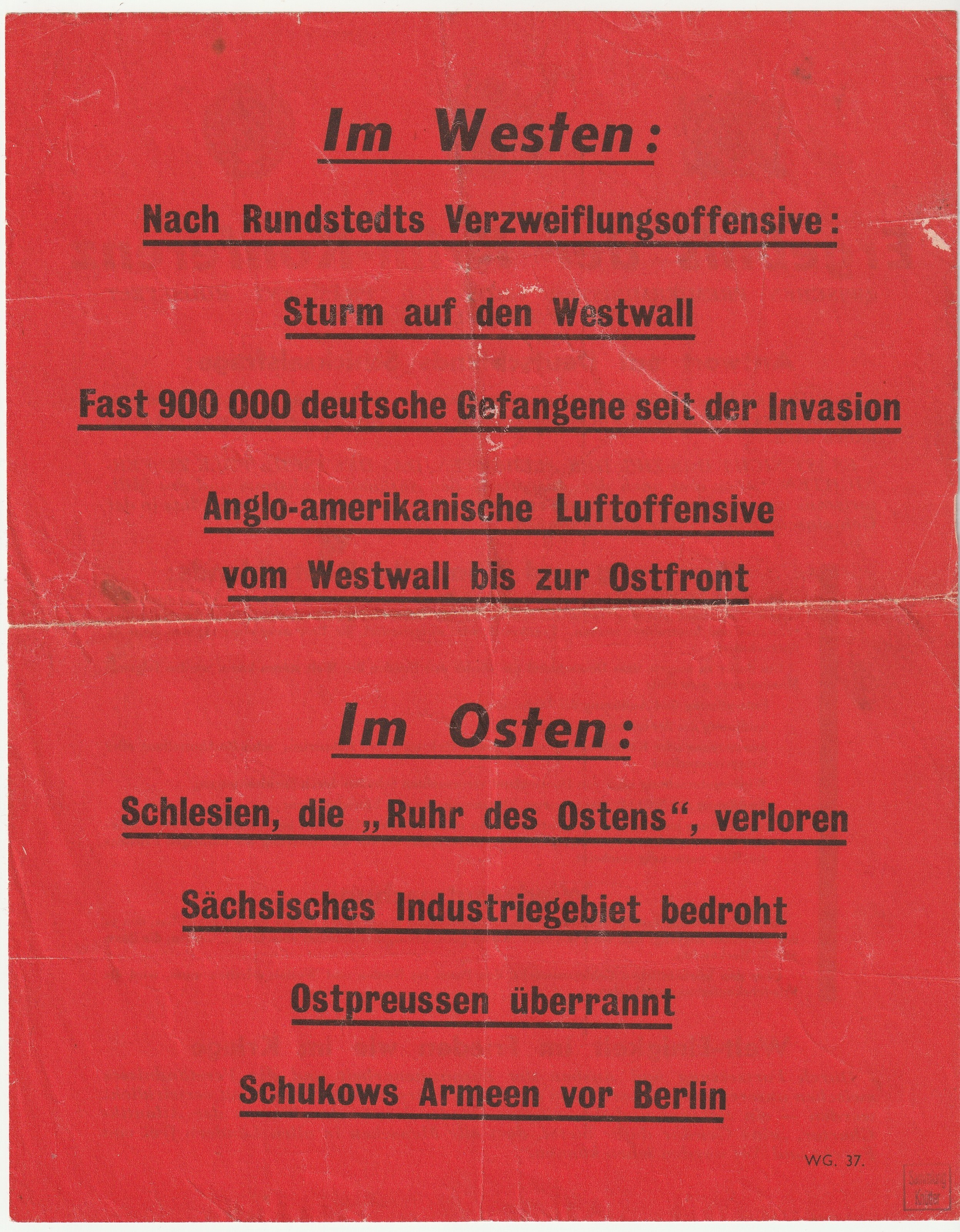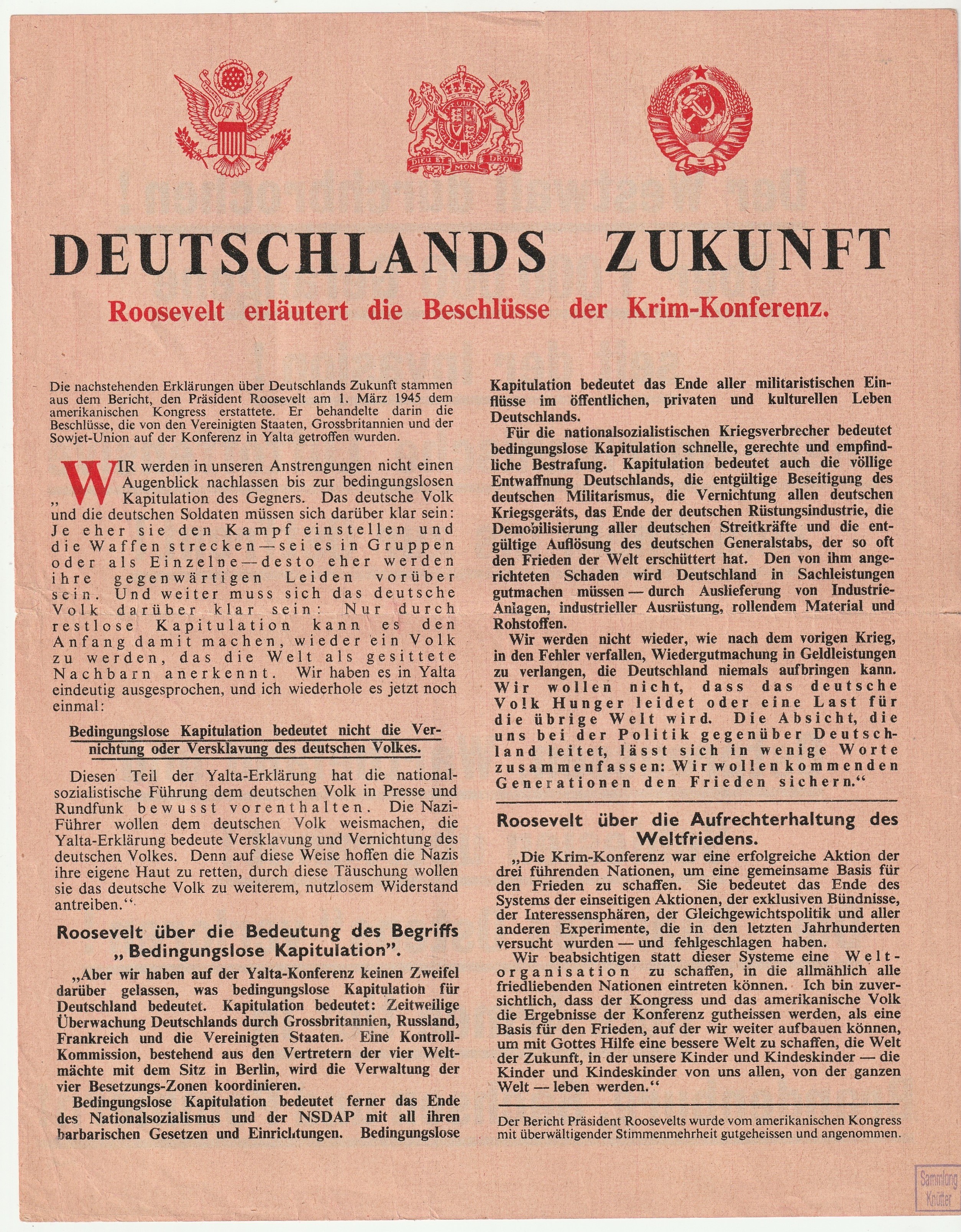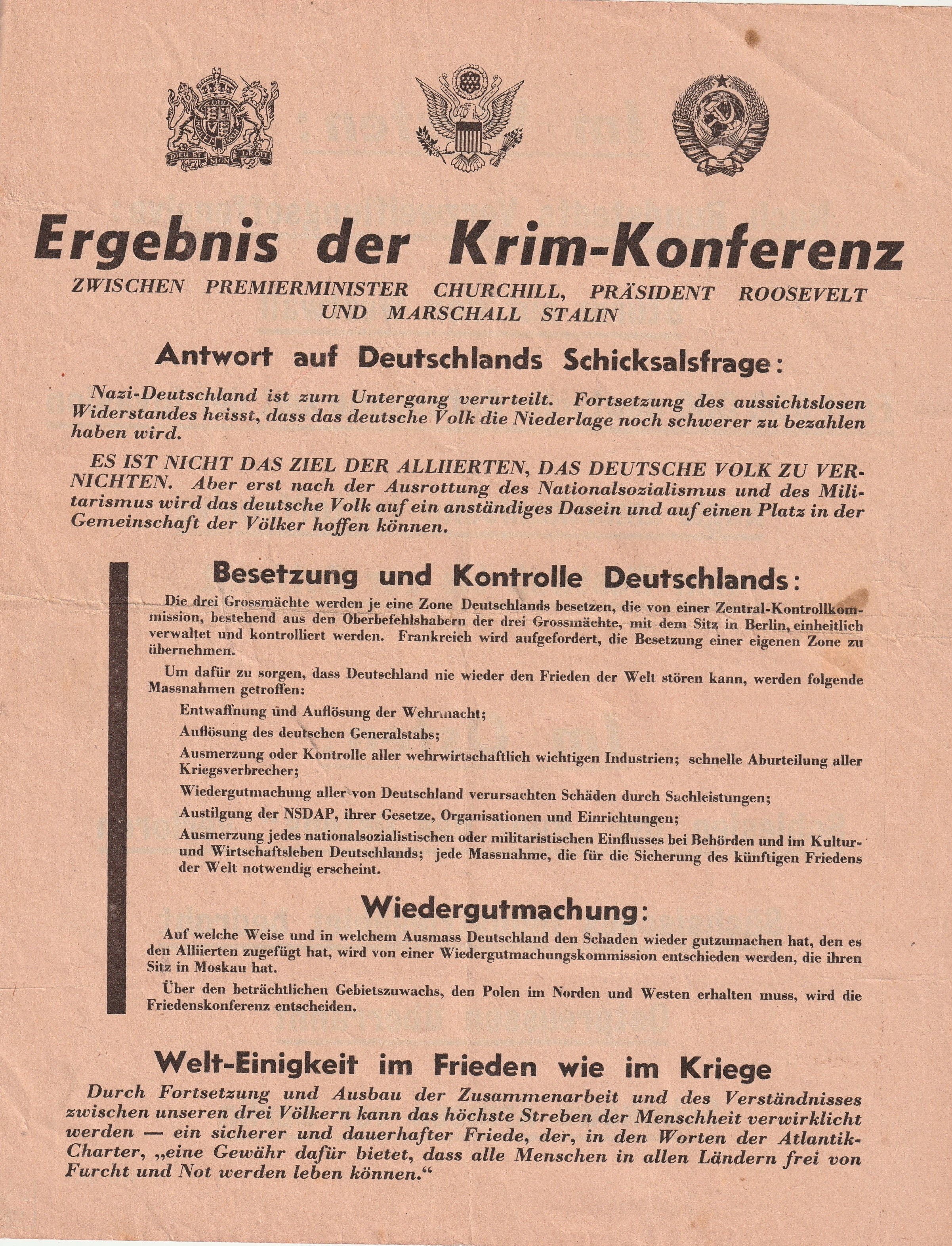 JAŁTA 1945. Ulotki alianckie z lutego-marca 1945, przedstawiające wyniki konferencji jałtańskiej; ślady złożeń, zagięcia narożników; wym. ok. 210x265 mm: 1) Ergebnis der Krim-Konferenz…, główne postanowienia odnośnie Niemiec, zapewnienie, że celem nie jest unicestwienie narodu niemieckiego; zapowiedź, że o nabytkach terytorialnych Polski zadecyduje konferencja pokojowa, na verso relacja z frontu zachodniego i wschodniego (Śląsk stracony przez Niemcy); 2) Deutschlands Zukunft – prezydent Roosevelt o decyzjach konferencji jałtańskiej, na verso relacja z frontu zachodniego i wschodniego (opanowane przez Sowietów Prusy Wschodnie, Kraj Warty i Śląsk); razem 2 sztuki.
