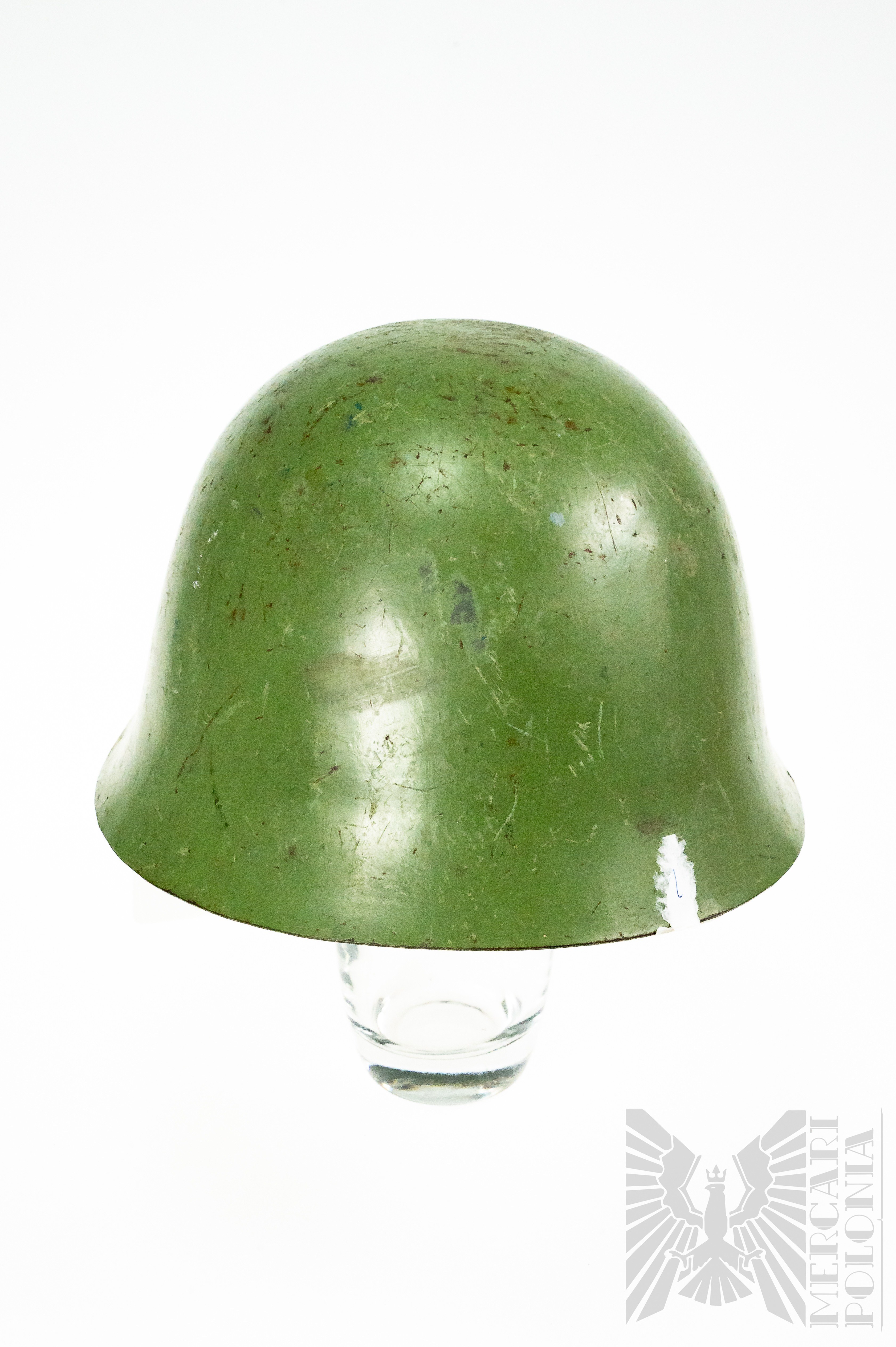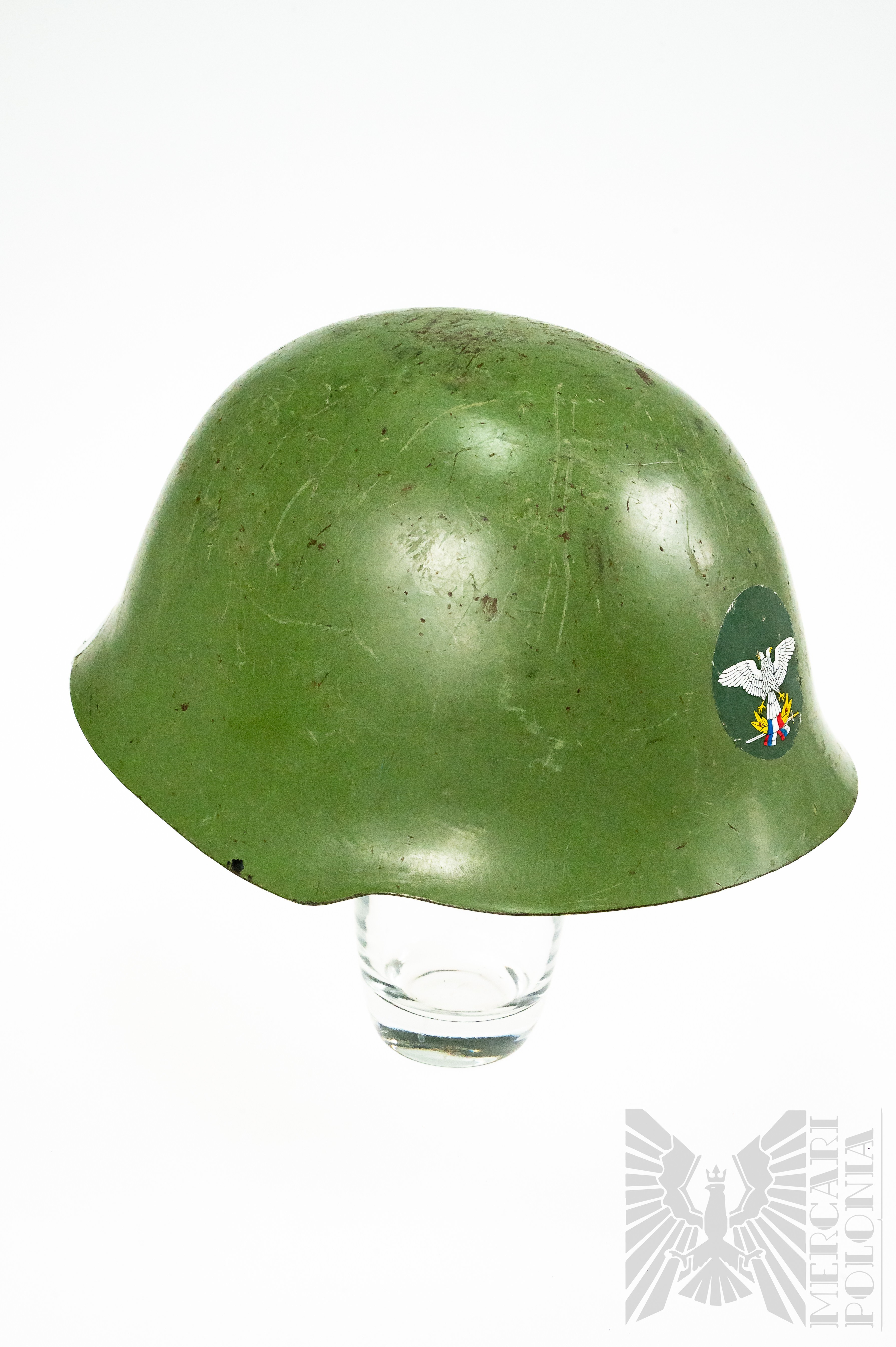Hełm stalowy pokryty zieloną farbą kamuflażową, na przedzie widoczny okrągły emblemat Sił Lotniczych i Obrony Przeciwlotniczej Sił Zbrojnych Serbii i Czarnogóry, podpinka parciana.