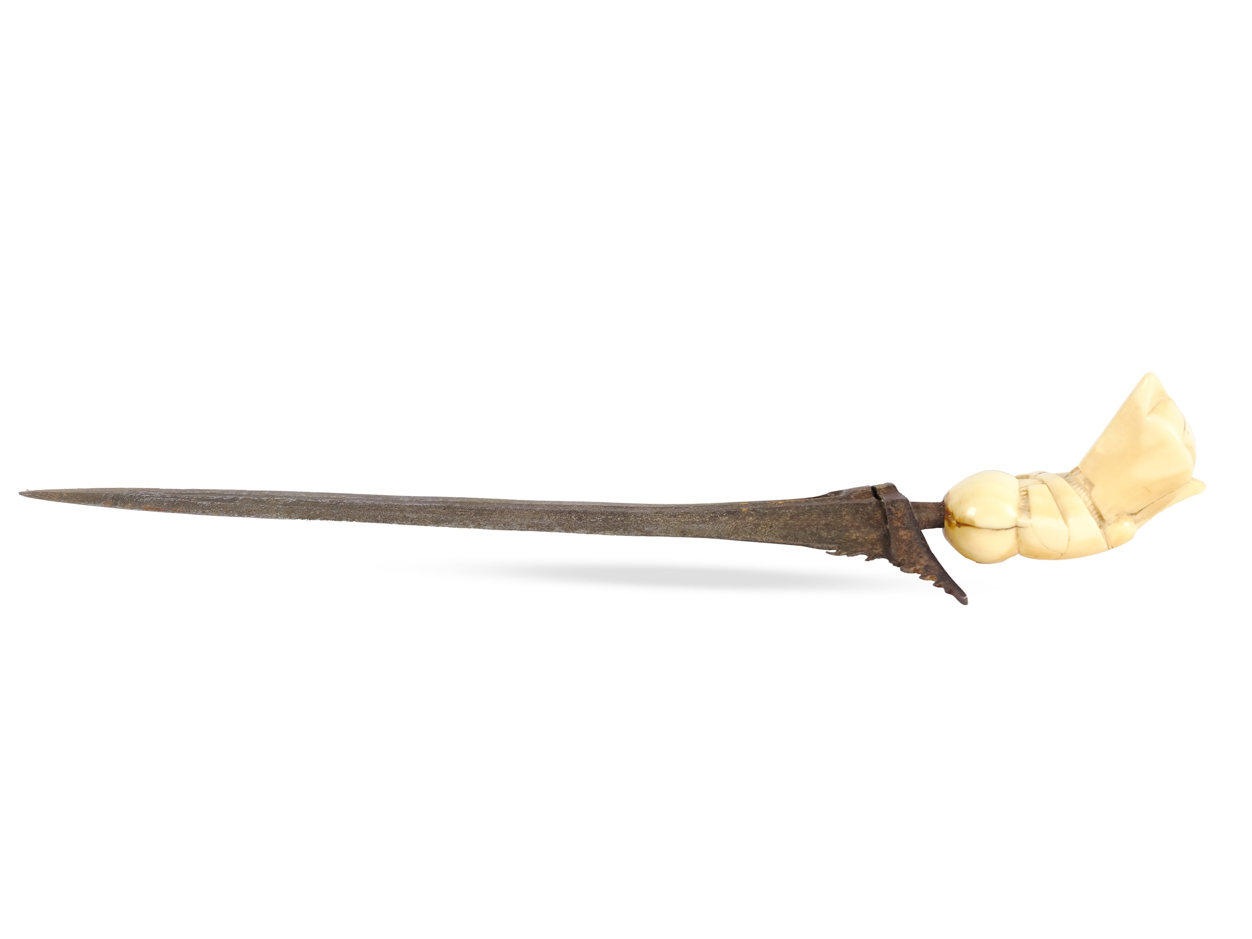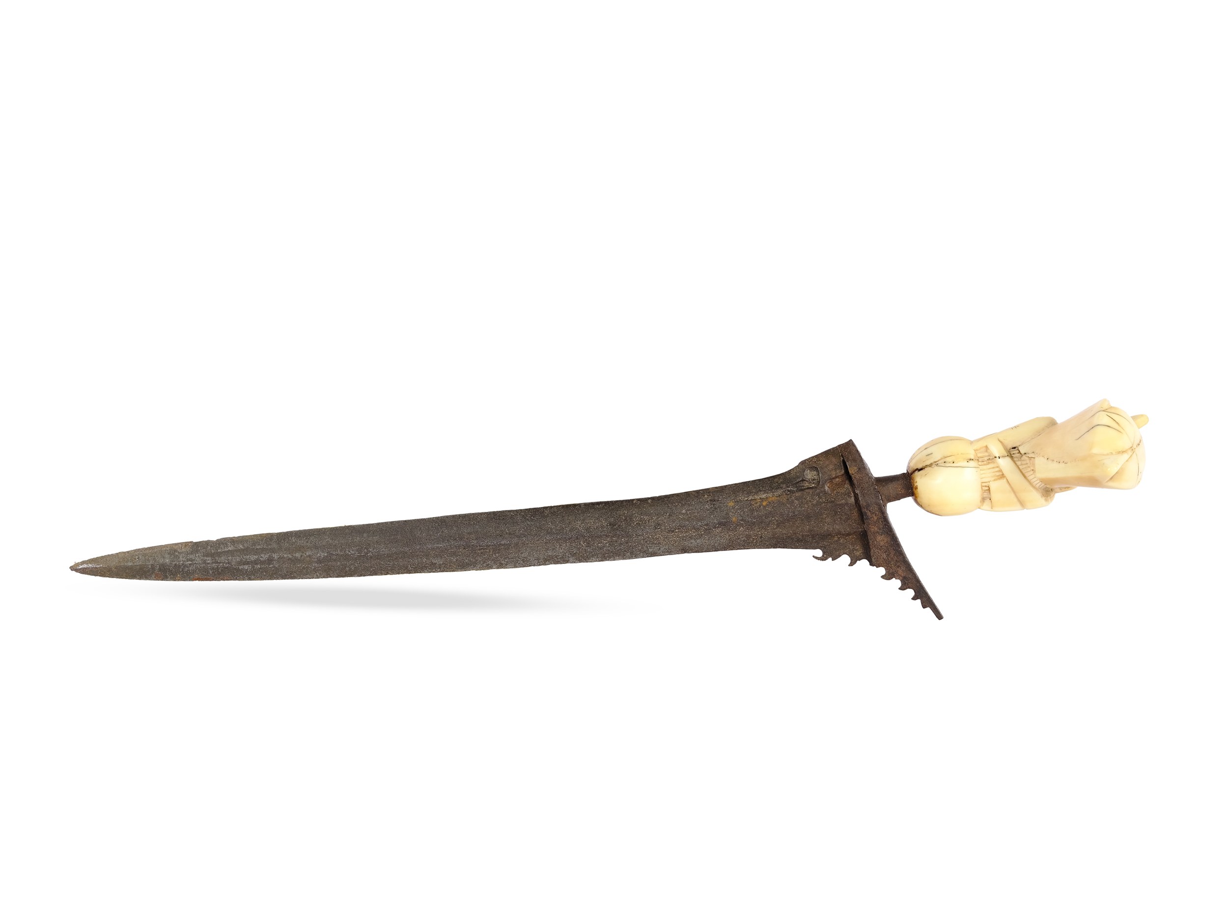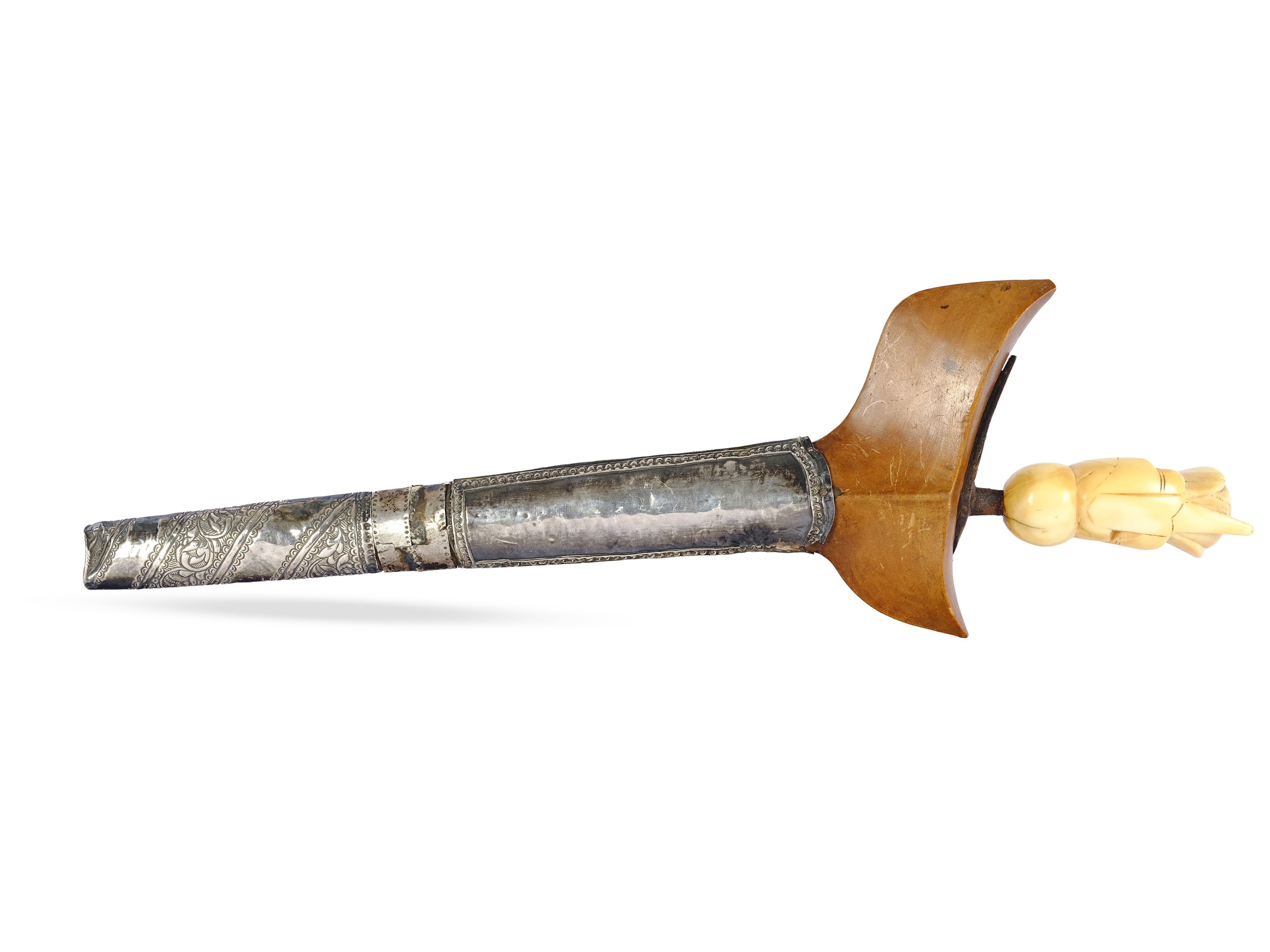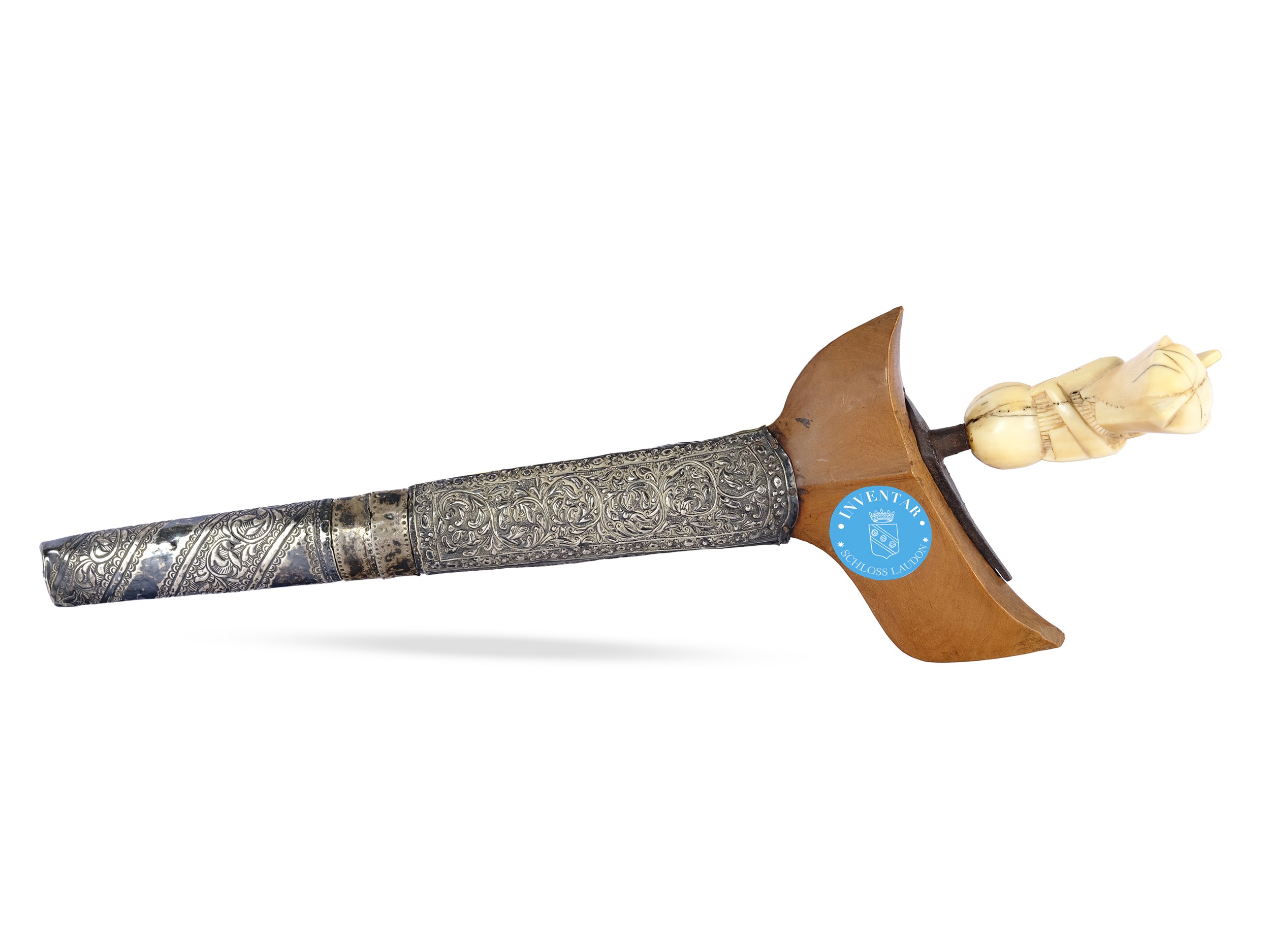 Kris with very old straight blade (pamor not recognisable) and handle in the shape of a Jawa Demam, a mythological hybrid of man and bird. The grip ring is missing. The scabbard is made of wood and covered with sheet silver with finely embossed floral decoration.