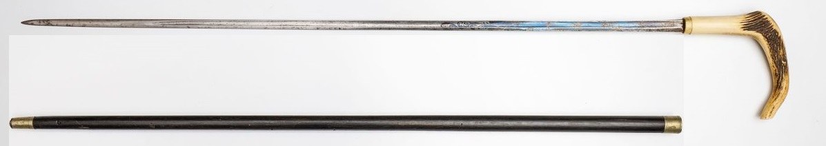 Drewno toczone, czernione, biały metal, poroże, dł. 91 cm