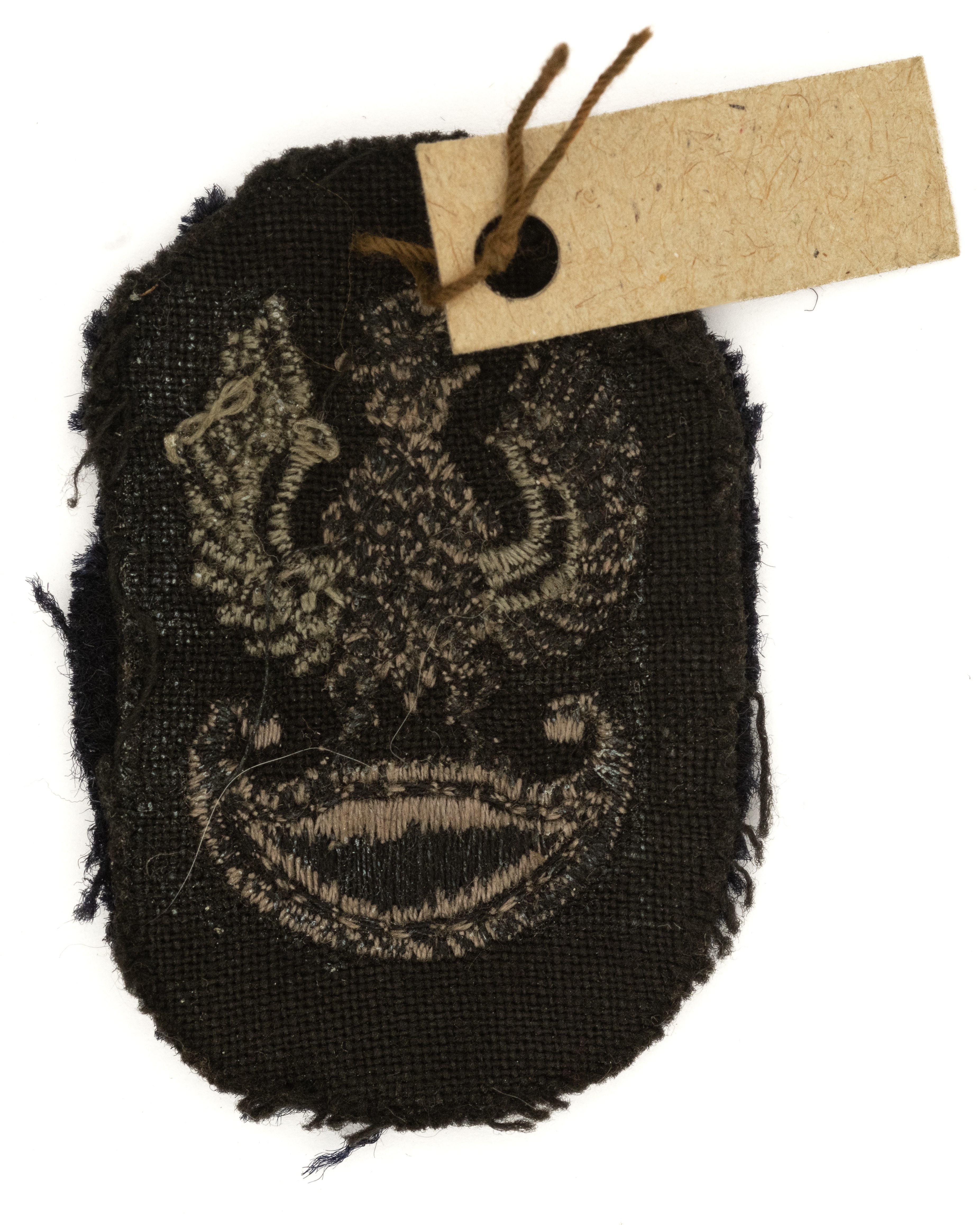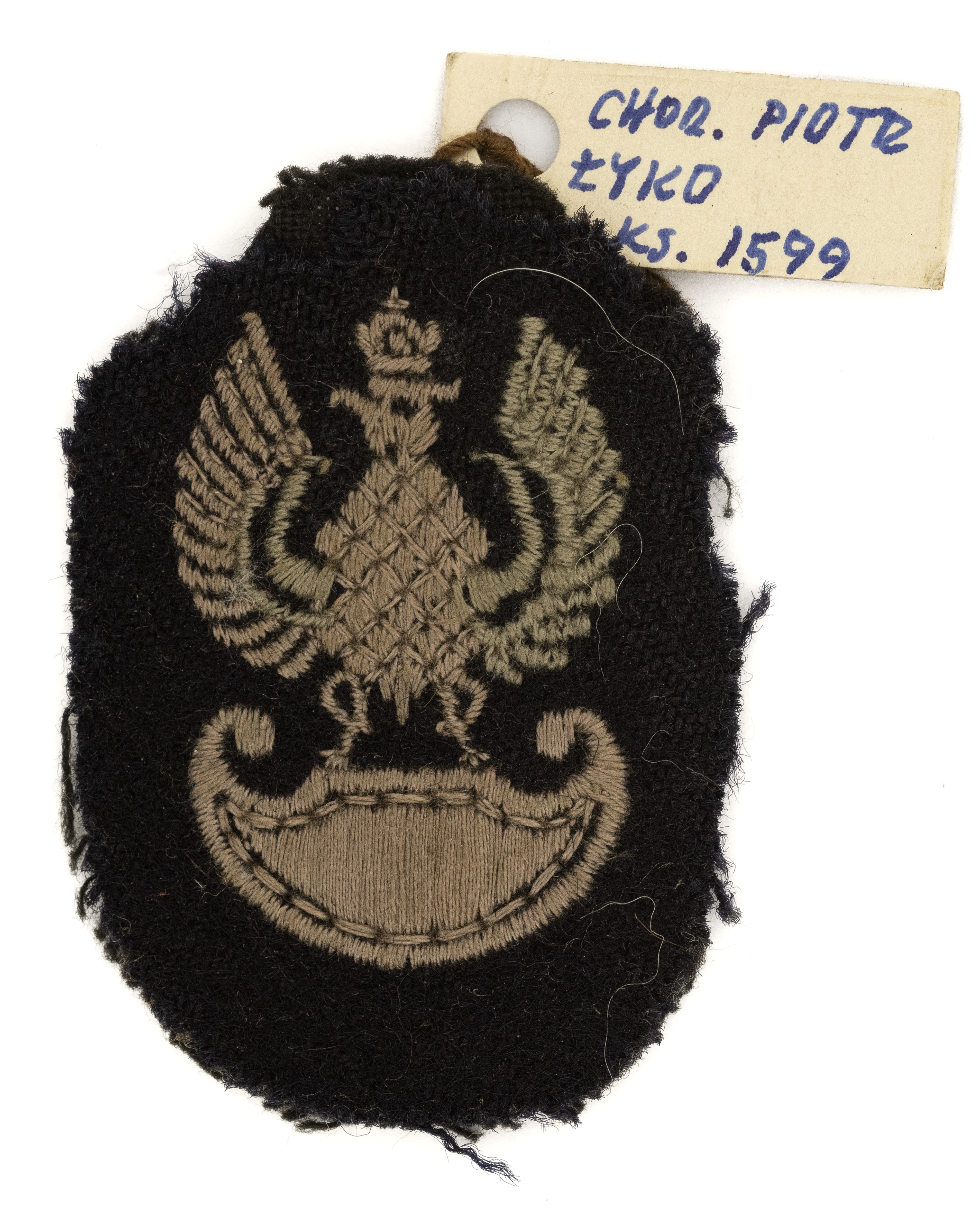 54x38mm. Haft maszynowy szarą nicią na sukiennym podkładzie w kolorze czarnym. Na rewersie doczepiona karteczka z numerem KS.1599 Chor. PIOTR ŁYKO , Lit. Tomasz Zawistowski, Polskie orły do czapek w latach 1939-45, str. 72. Stan bardzo dobry.