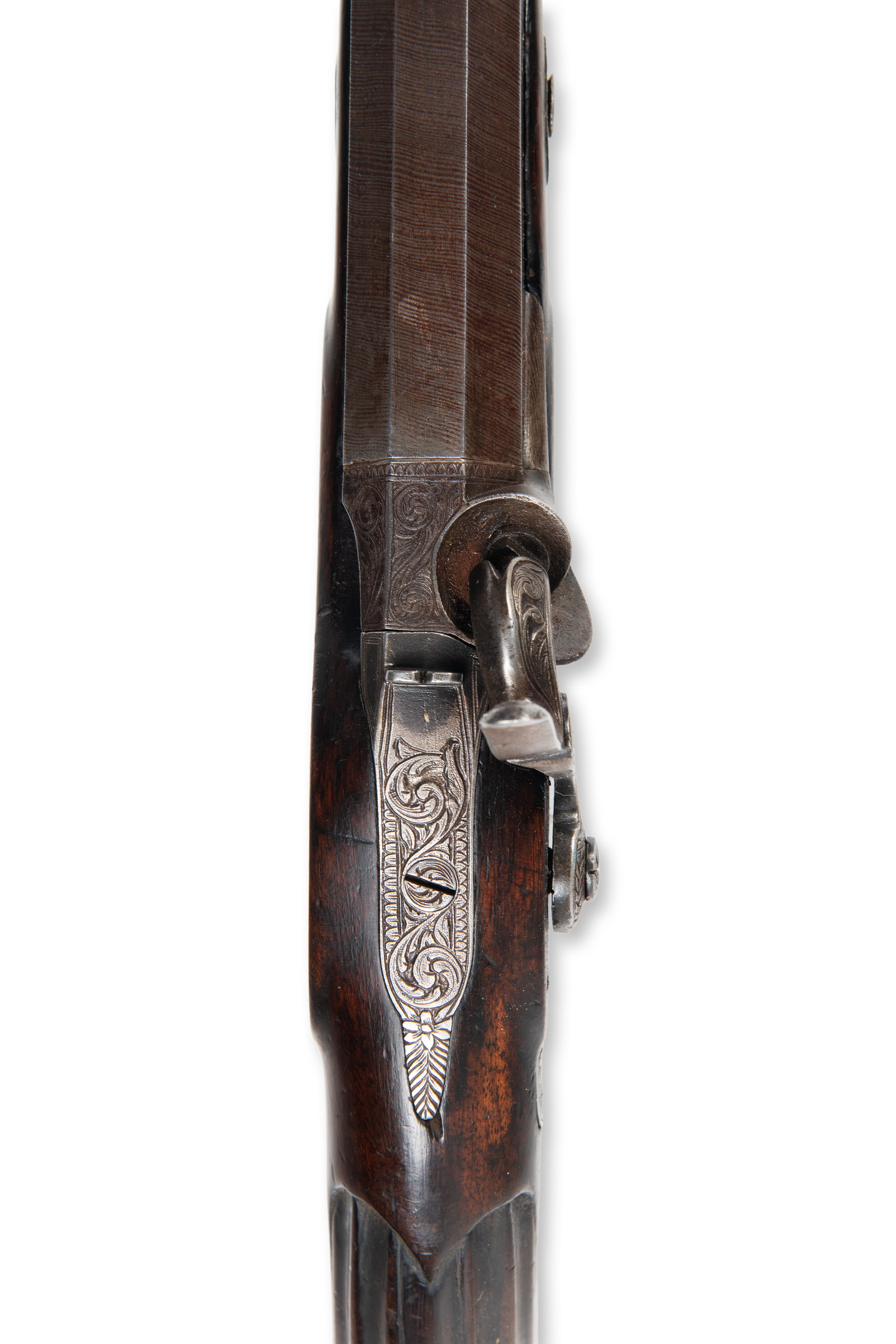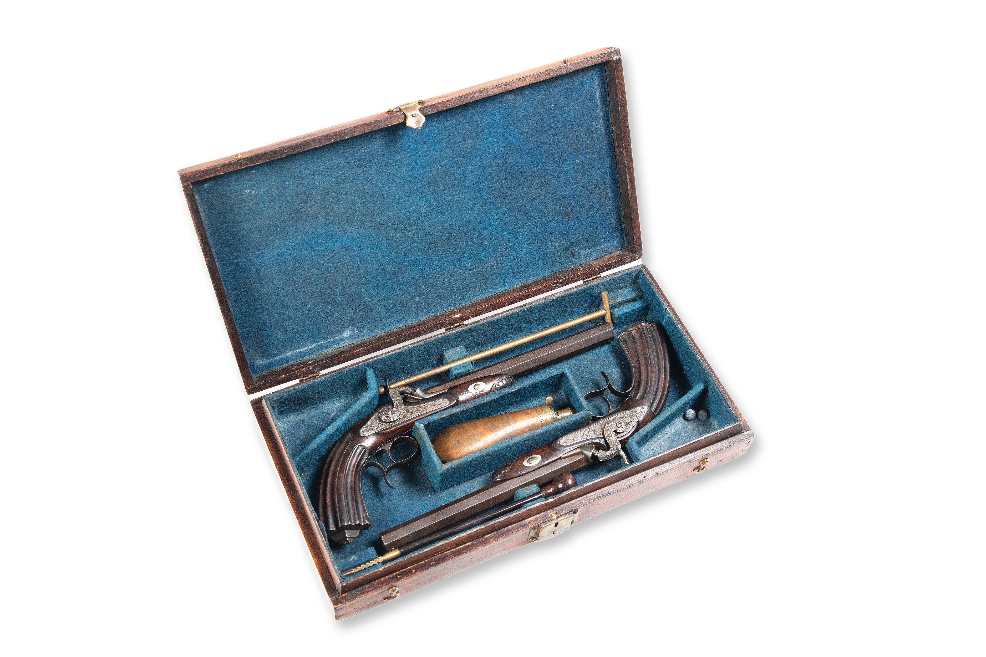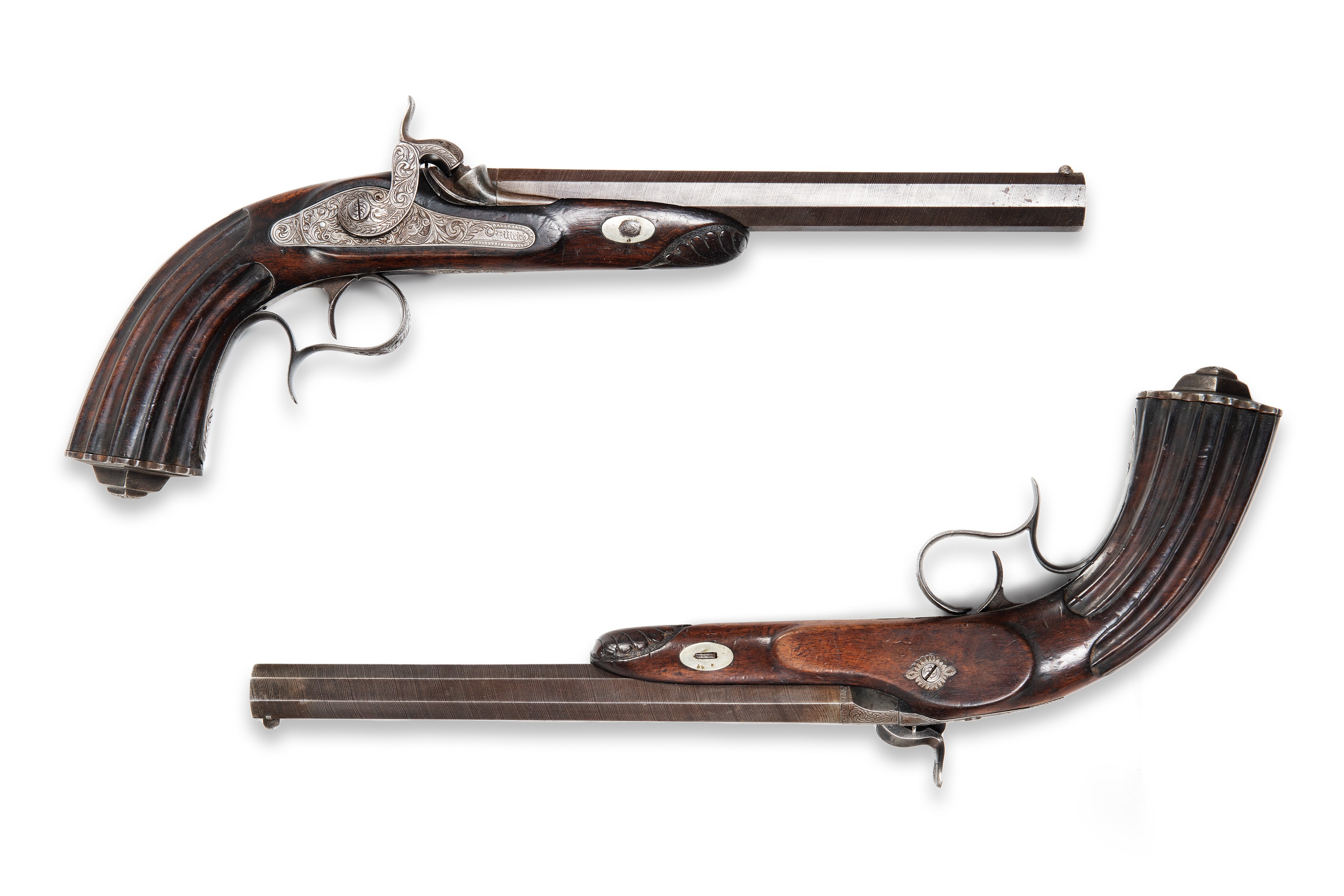 A pair of percussion pistols made around 1840 in Bern/Stuttgart, Switzerland. The lock plates are signed "F. Ulrich". The pistols are stored in a cartridge, which, in addition to the weapons, contains a powder magazine and a magazine, indicating a complete set of accessories for the use and maintenance of weapons. The cartridge is in good condition and provides protection for these historic guns. This set is an excellent example of 19th century Swiss craftsmanship. A later cassette.***IMPORTANT NOTICE***