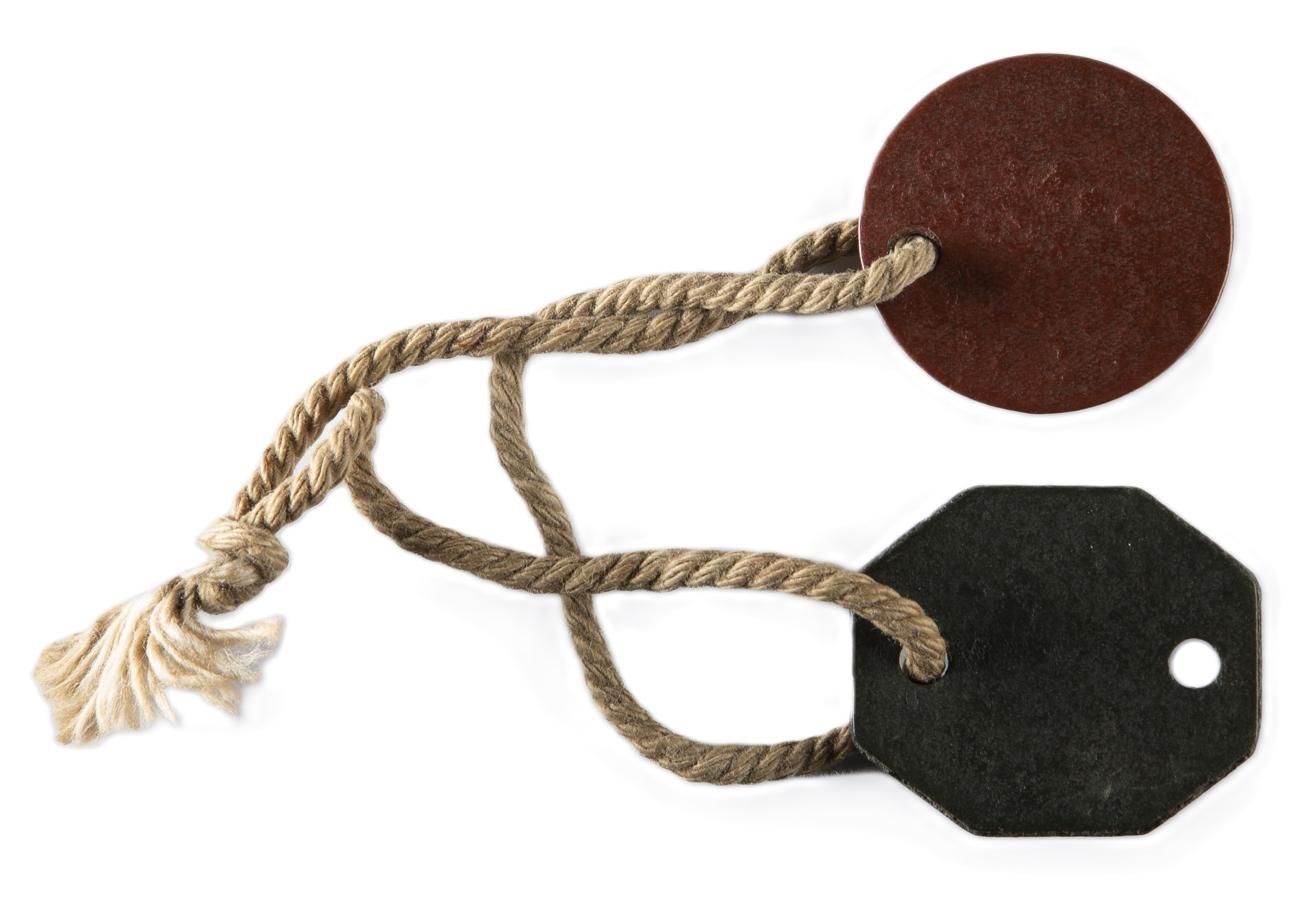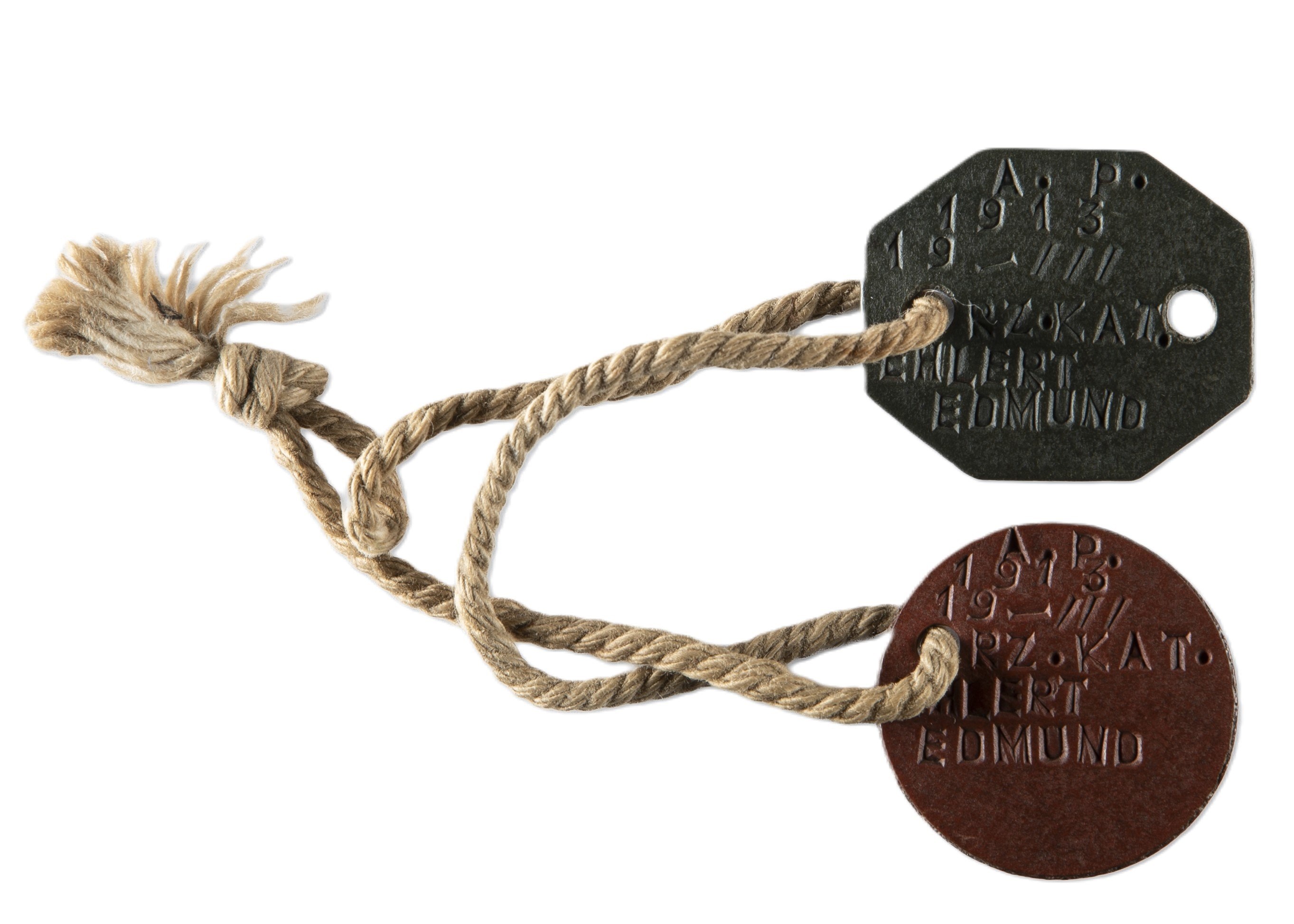 Para nieśmiertelników połączonych sznurkiem. Tworzywo sztuczne. Wybite dane: "A.P. 1913 19 - RZ. KAT. EHLERT EDMUND. Stany dobre.
