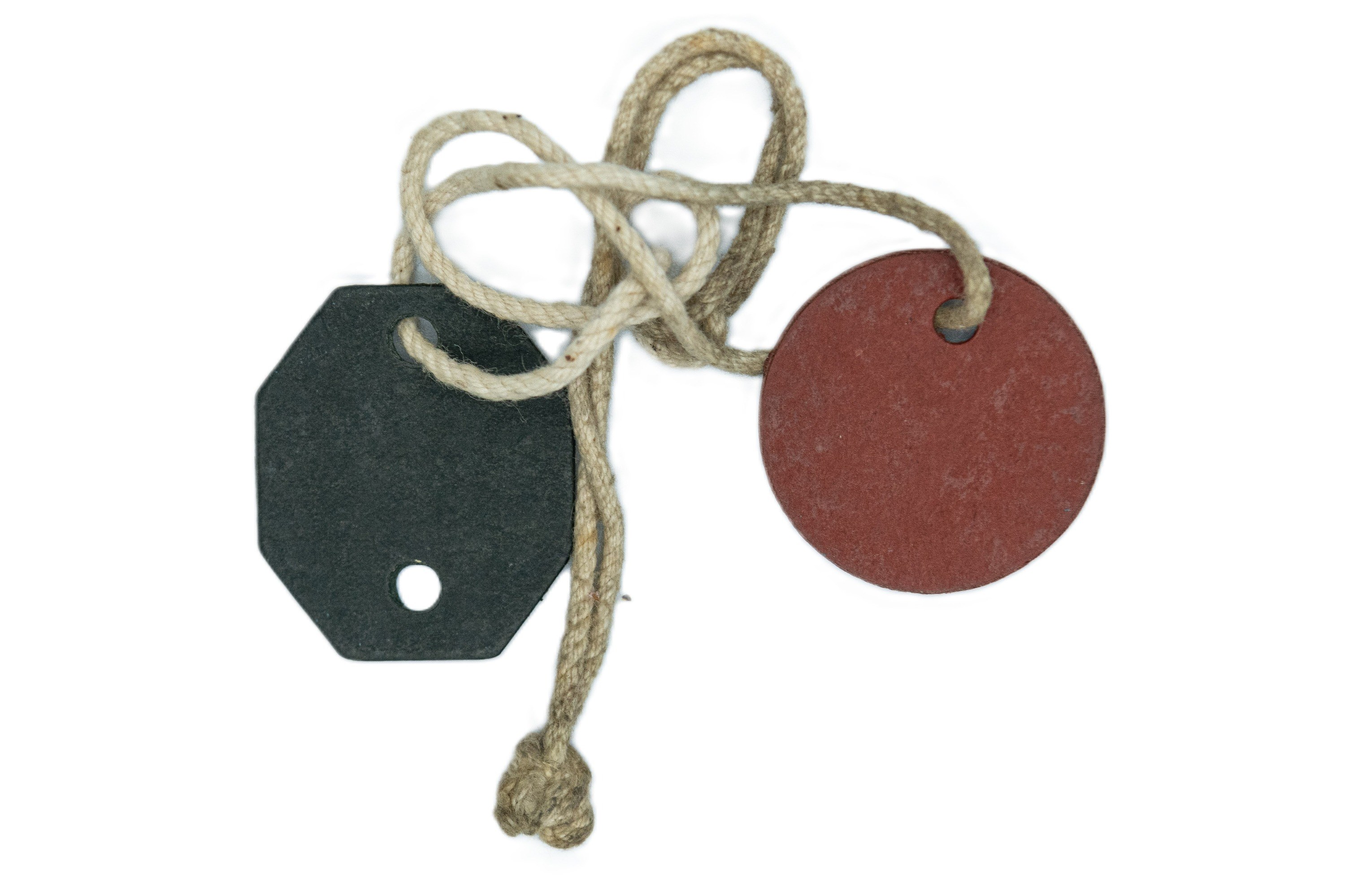Para nieśmiertelników PSZ na Zachodzie, połączone oryginalnym sznurkiem, tworzywo sztuczne. Wybite dane: "A.P. 1923 1036-III RZ.K, AT. SMOLIŃSKI KAZIMIERZ". Stany dobre.