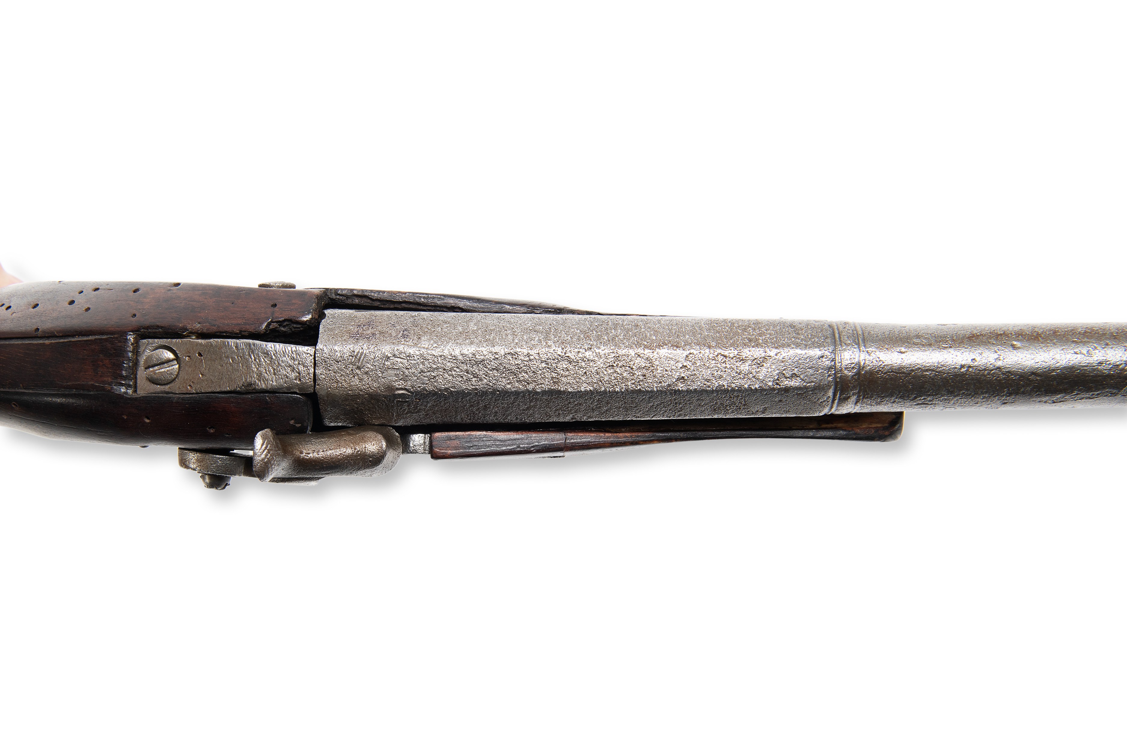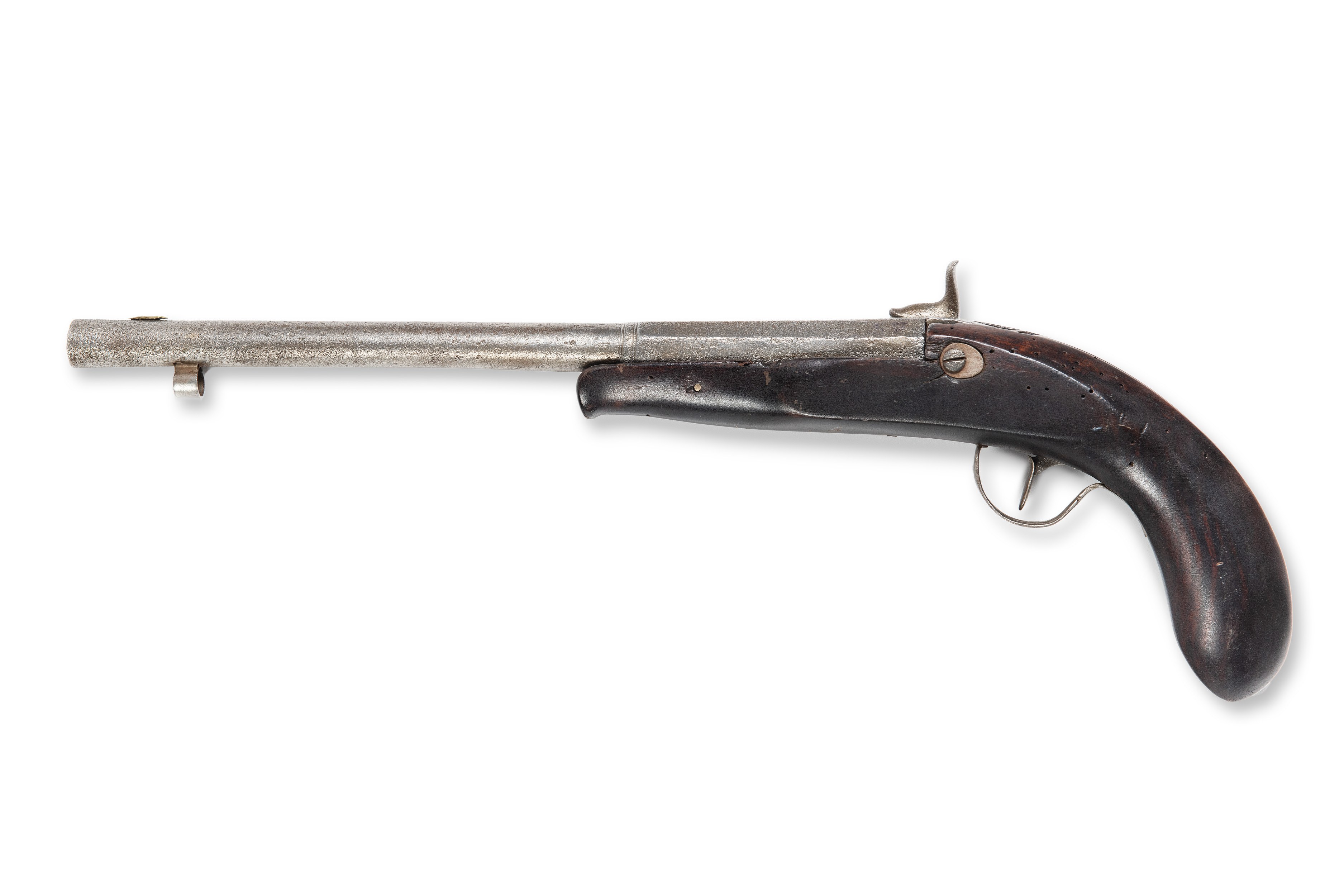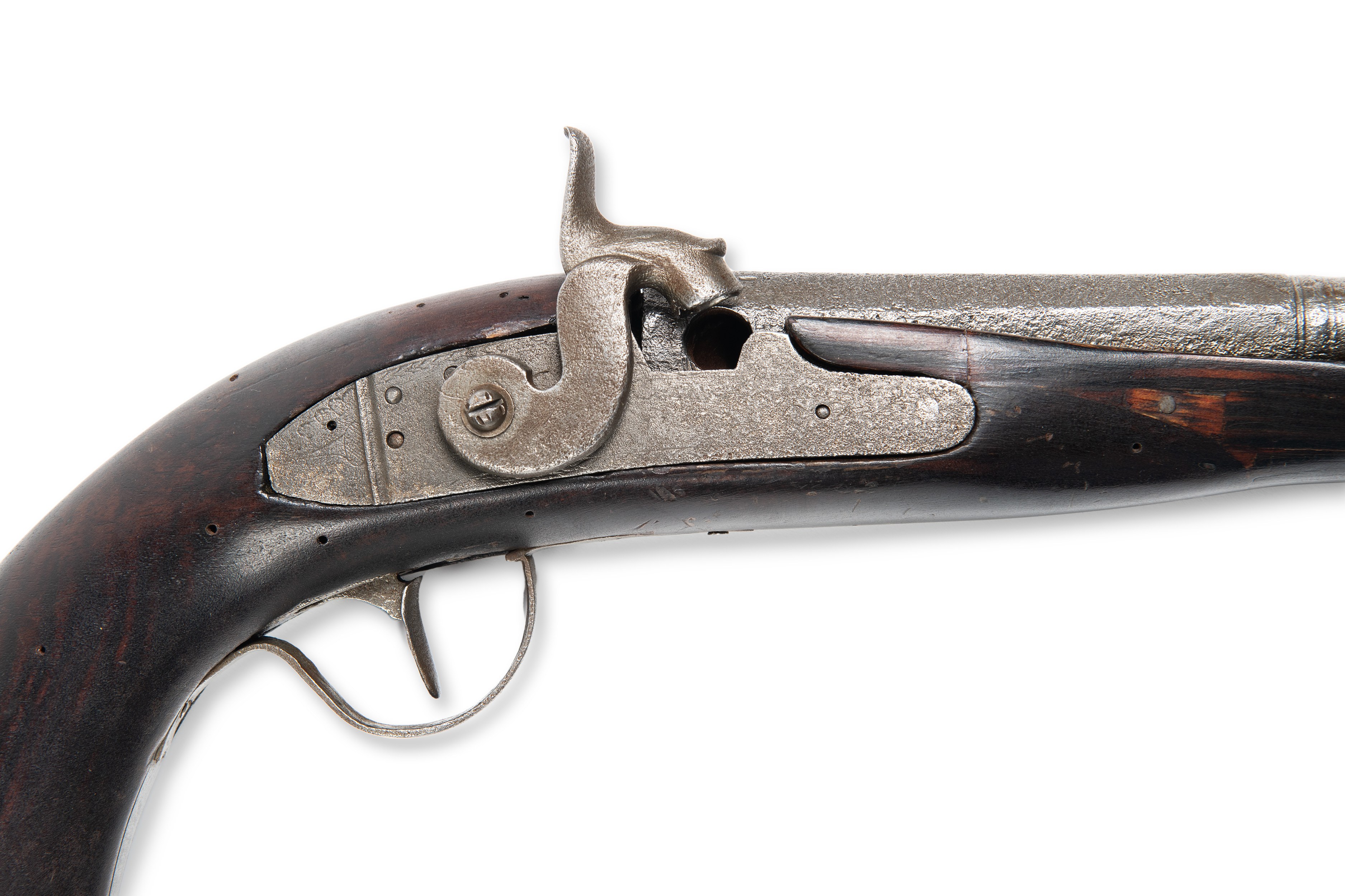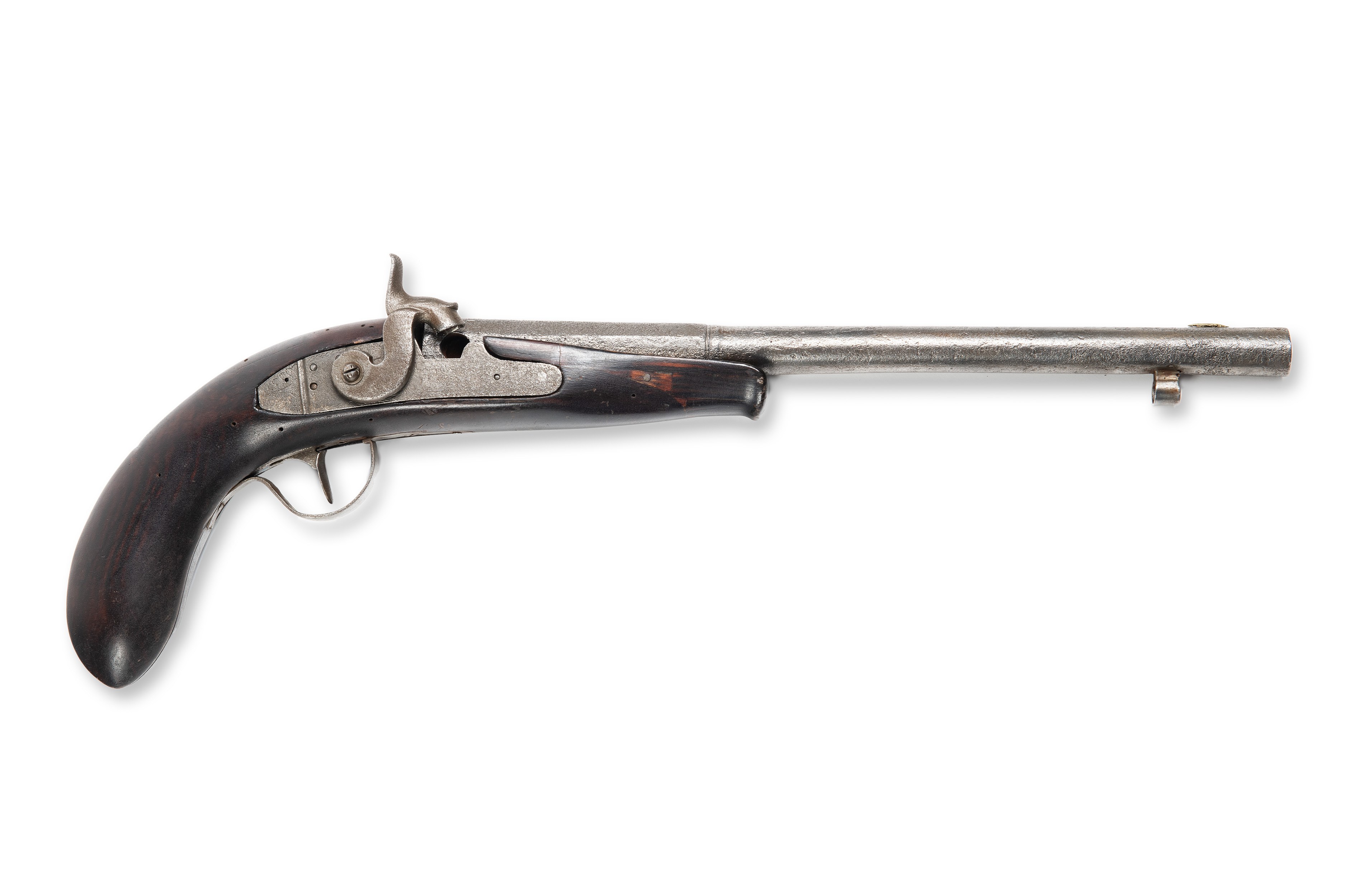 Percussion pistol from around 1830, assembled from parts of several guns. Both the barrel and the lock were originally flintlock, while the piston is missing. The metal parts show extensive chipping marks, indicating intensive use and natural wear. This weapon combines historical elements and shows the evolution from flintlock weapons to a percussion mechanism.***IMPORTANT NOTICE***