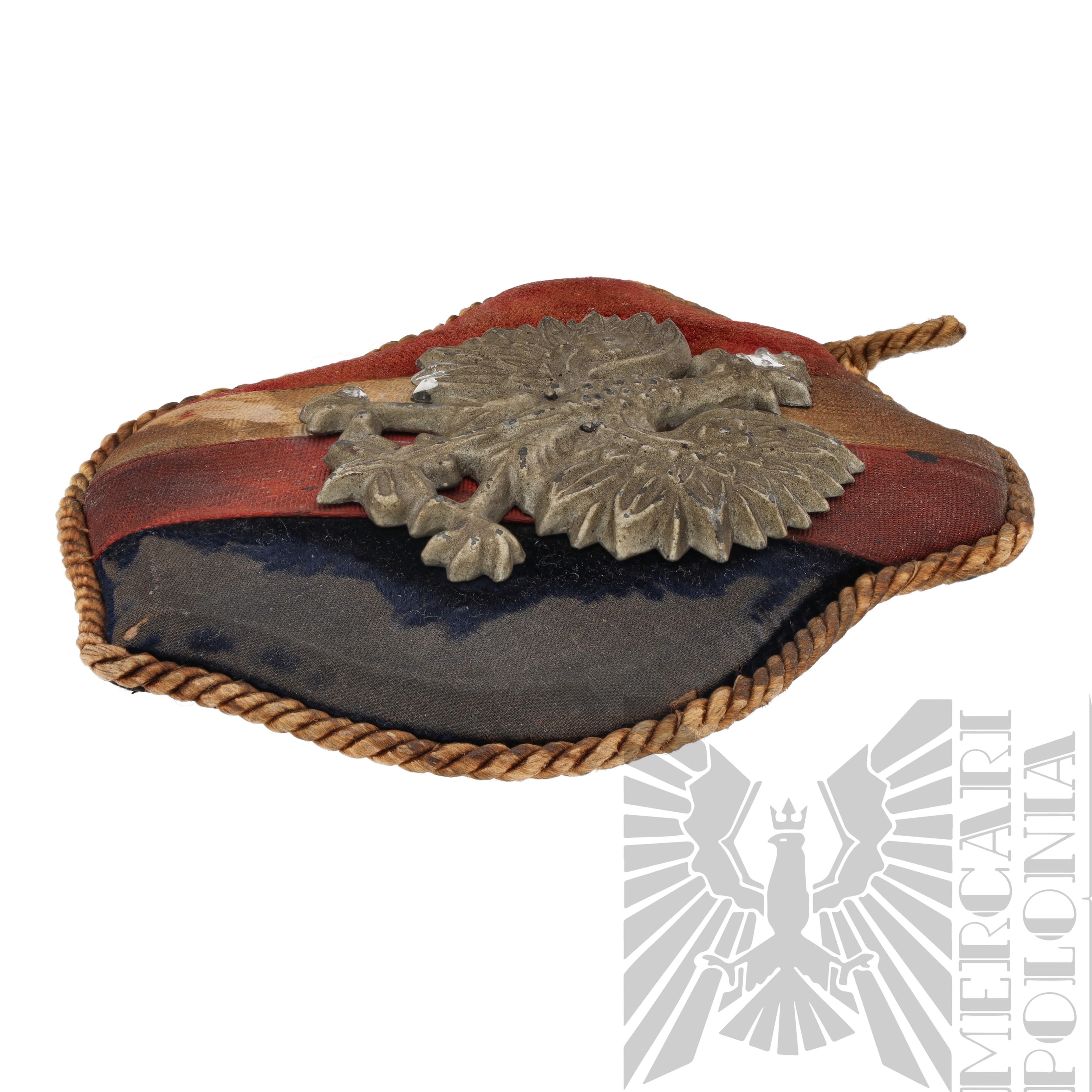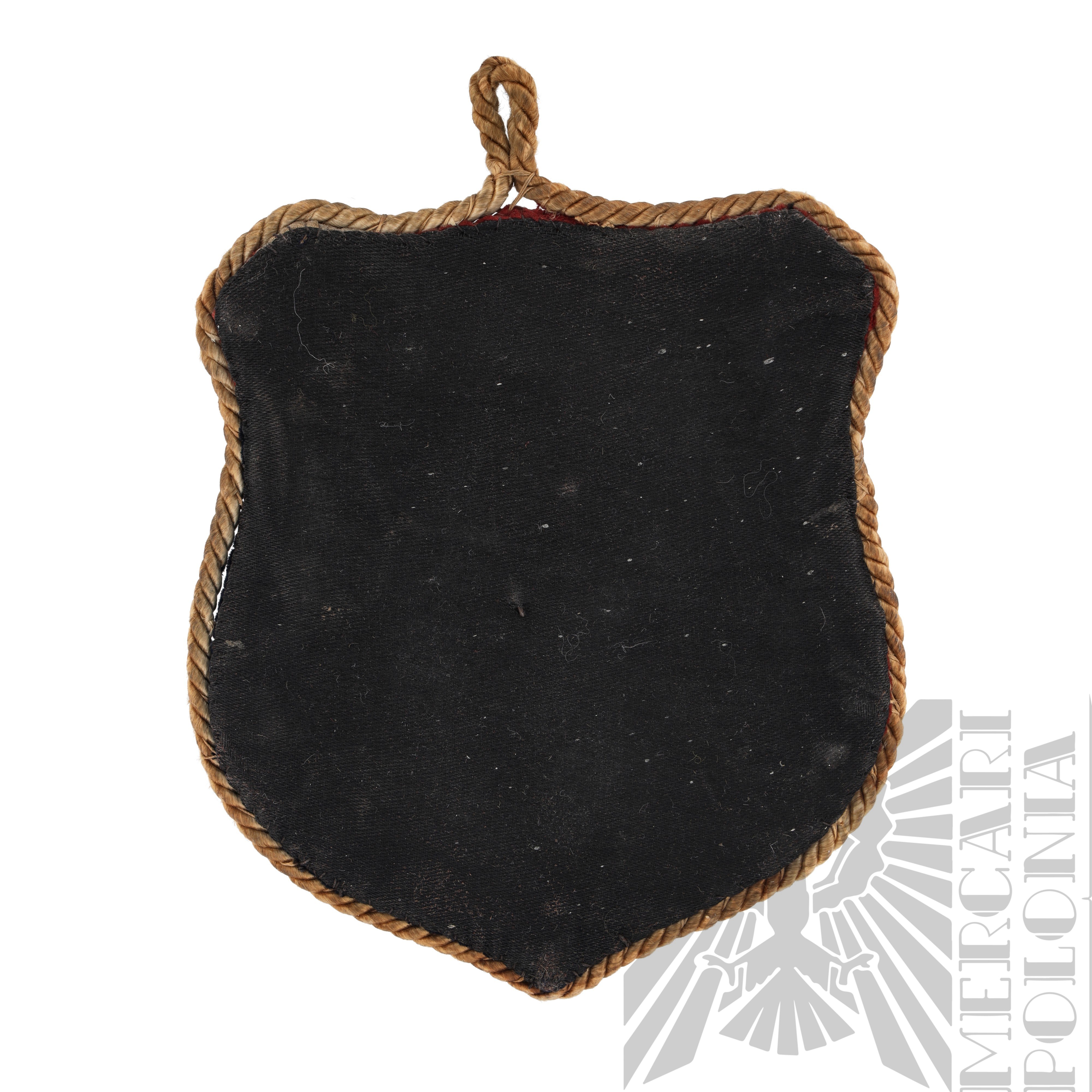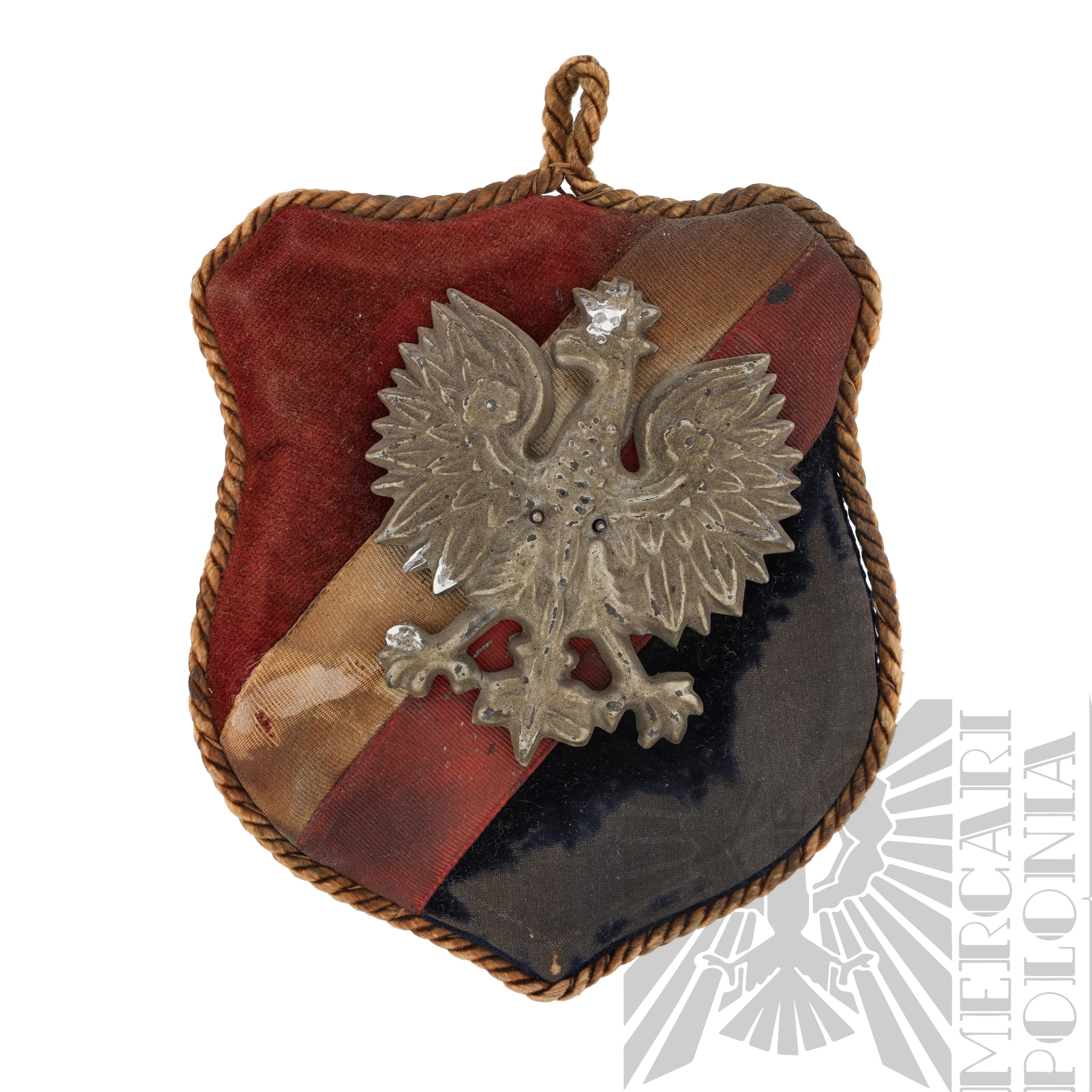 Ozdobna tarcza patriotyczna wykonana w okresie 2 wojny światowej na Zachodzie. Tarcza kolorze czerwonym i granatowym z biało-czerwonym paskiem pośrodku z nałożonym orłem państwowym wz.27, tarcza otoczona sznurkiem, na górze widoczna pętla do zawieszenia.