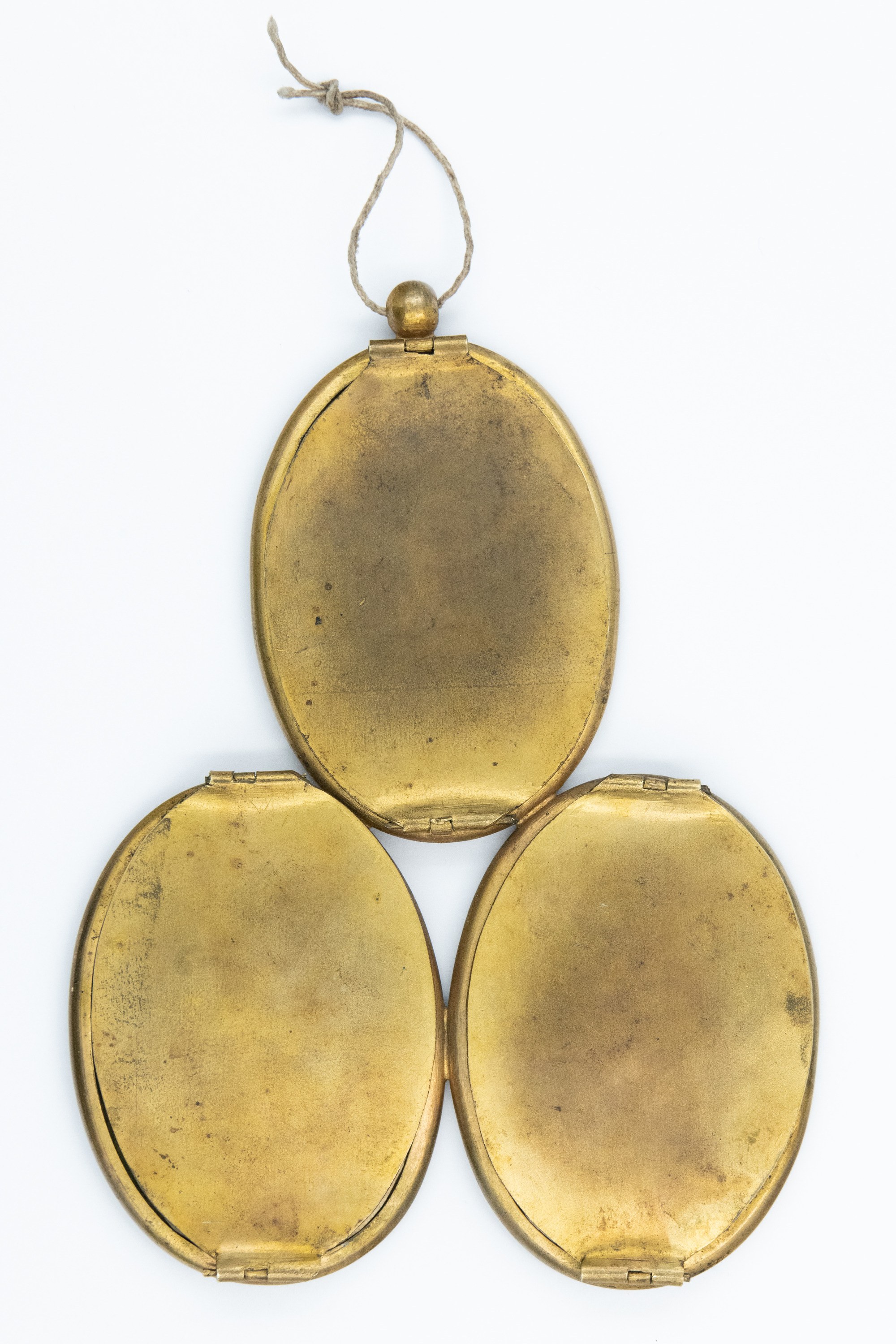 Ramka trójpolowa z herbem Rzeczypospolitej Obojga Narodów (Pogoń i Orzeł) oraz Krzyżem. 14,5 x 10,5cm (całość) wymiar pojedynczego pola 5,3 x 7,3cm. Wykonana z mosiądzu, złocona. W najwyższej ramce Krzyż z koroną cierniową i datą 1861 (Masakra na placu Zamkowym w Warszawie) w dwóch dolnych Pogoń i Orzeł. Rysunek tuszem podmalowany akwarelą. Bardzo ciekawy patriotyk! Stan bardzo dobry.
