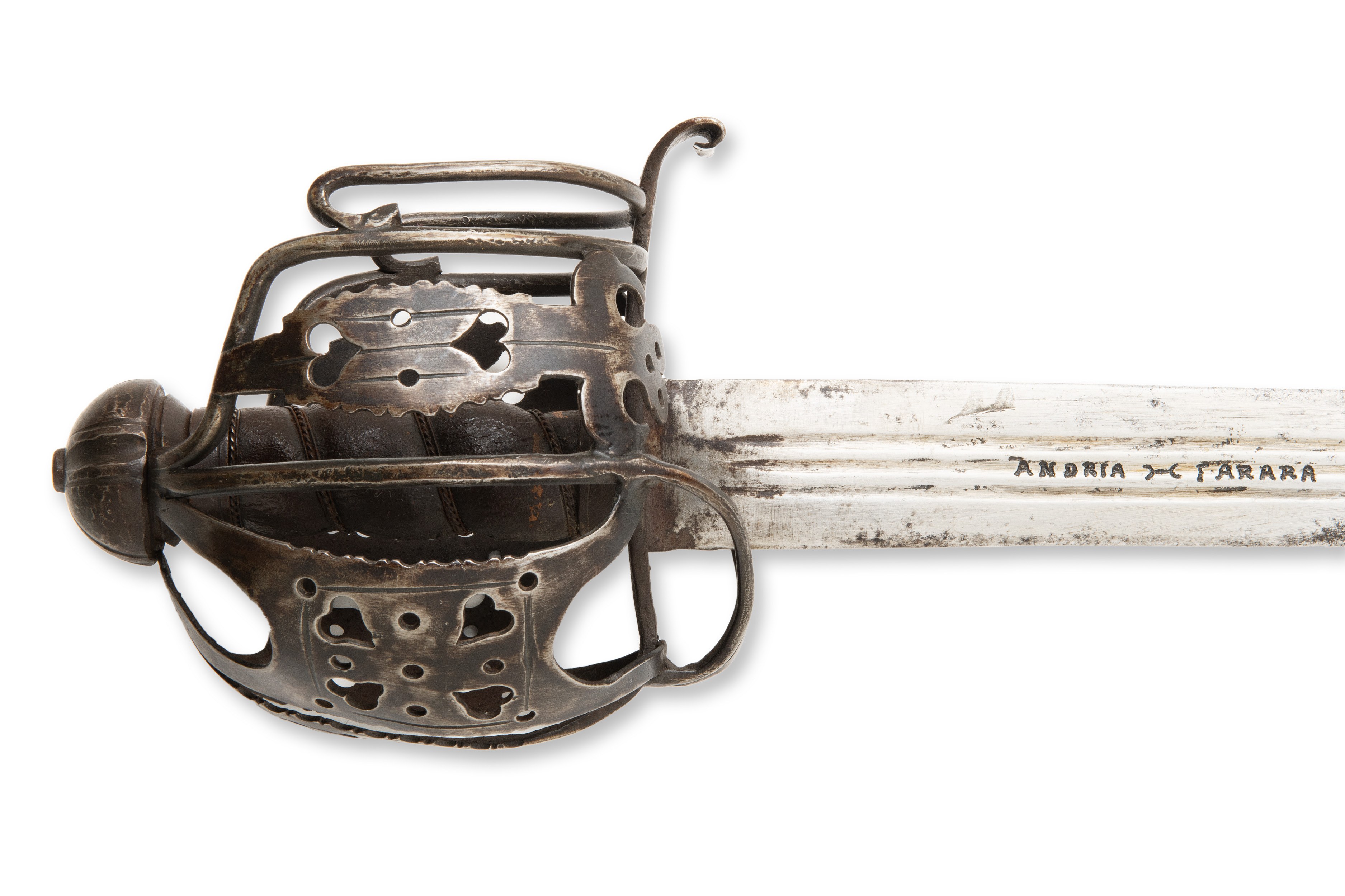19th / 20th century Scottish Claymore one-handed sword, signed "Andria Farara" on the blade. Andria Farara was an Italian swordsman of excellent reputation, whose blades were highly prized and used long after his death, often counterfeited. Fitted with a 19th century Tuareg blade, this sword is unsheathed. Basket later.***IMPORTANT NOTICE***