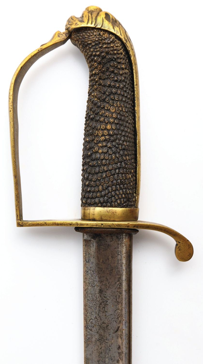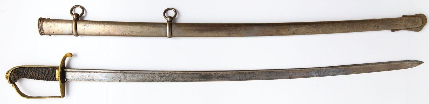Stal, mosiądz, drewno, skóra (szagryn), pochwa stalowa, dł. w pochwie 105 cm, bez pochwy 100 cm, głowni 87 cm, szer. 30mm, gr. 8 mm, waga całk bez pochwy 690 g, głowica w formie lwiej głowy