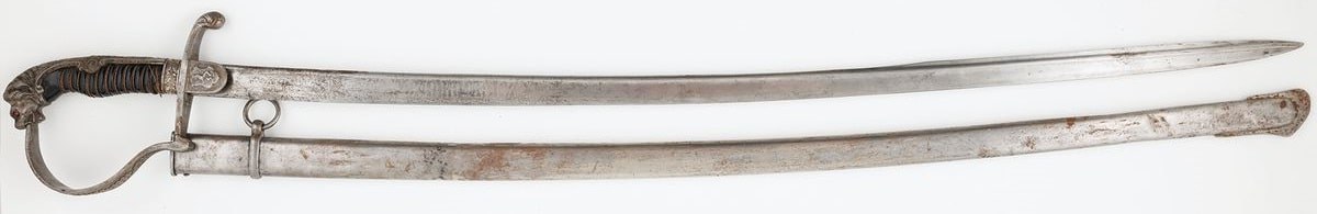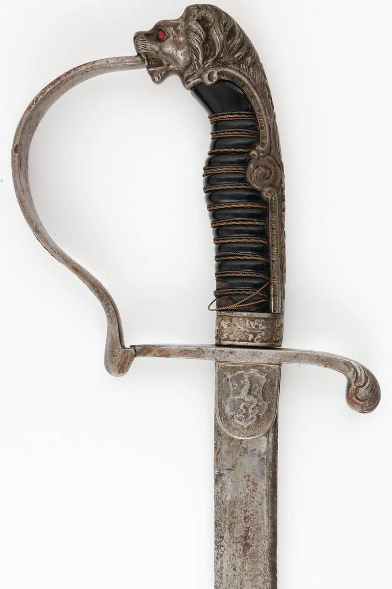 Stal, bakelit, kamienie jubilerskie, dł. cłk. w pochwie 99,5 cm, bez pochwy 97,5 cm, głowni 84 cm Na głowni trawienie: ornament roślinny; korona / I (monogram cara Ferdynanda I); СЪ НАШИВО ГЪ; na tarczce jelca lew - godło Bułgarii Puncowanie: wojownik z młotem / E.P. & S Szabla wg wzoru niemieckiej szabli wz 1882 tzw. „lowenkopf”. Cena wywoławcza 3000 Estymacja 3600 - 4000 zapytaj o obiekt