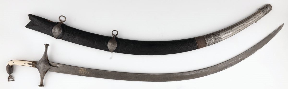 Głowa stalowa - damast, na zewnętrznym płazie napity złotem ozdobny napis alfabetem arabskim, jelec i okucie rękojeści stalowe, okładziny z kości; pochwa drewniana, łubkowa, obita skórą, okucia stalowe