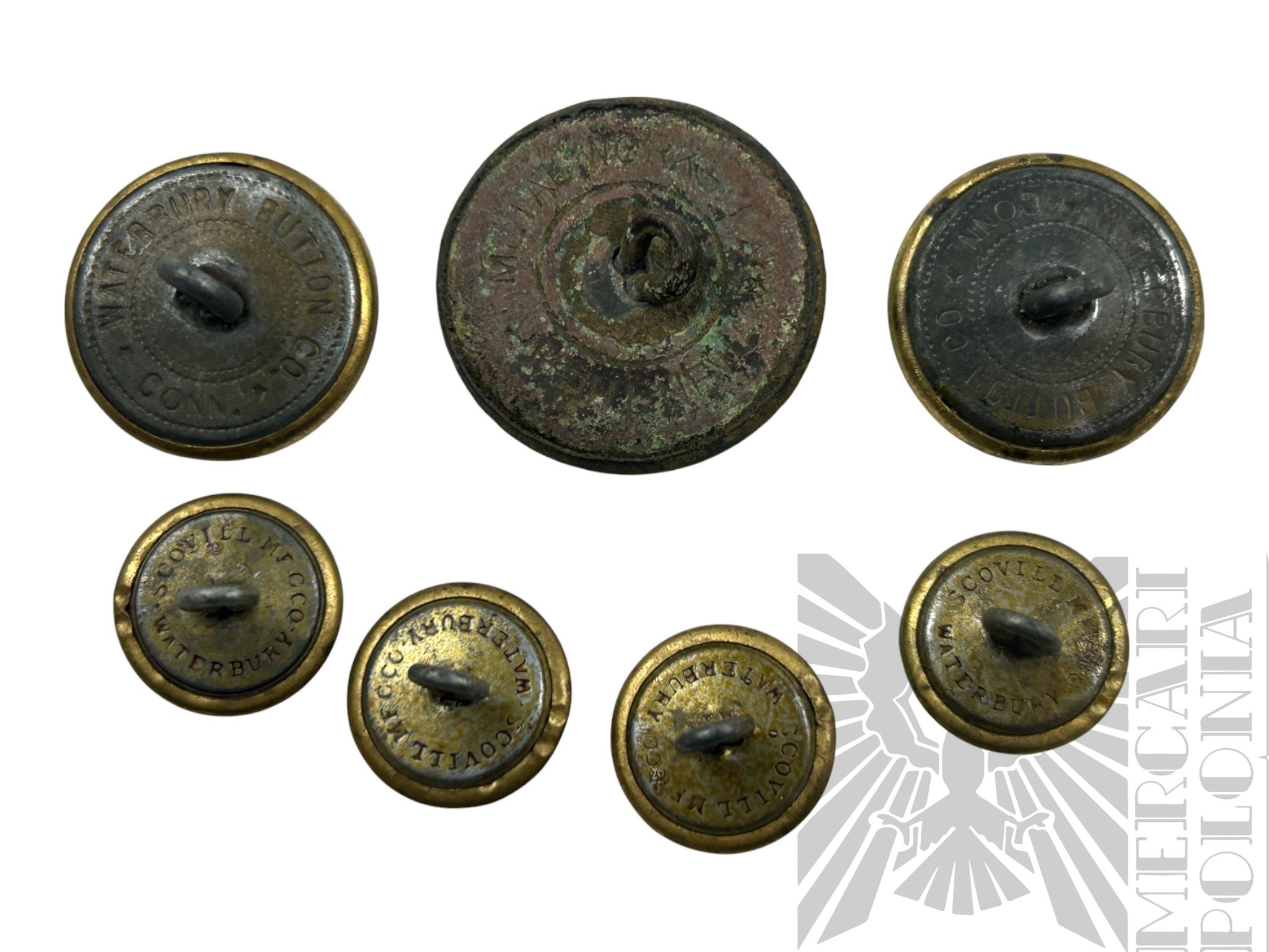 Zestaw 7 guzików Armii Amerykańskich używanych w okresie 1 i 2 wojny światowej, w zestawie są cztery guziki małe, dwa średnie i jeden duży.