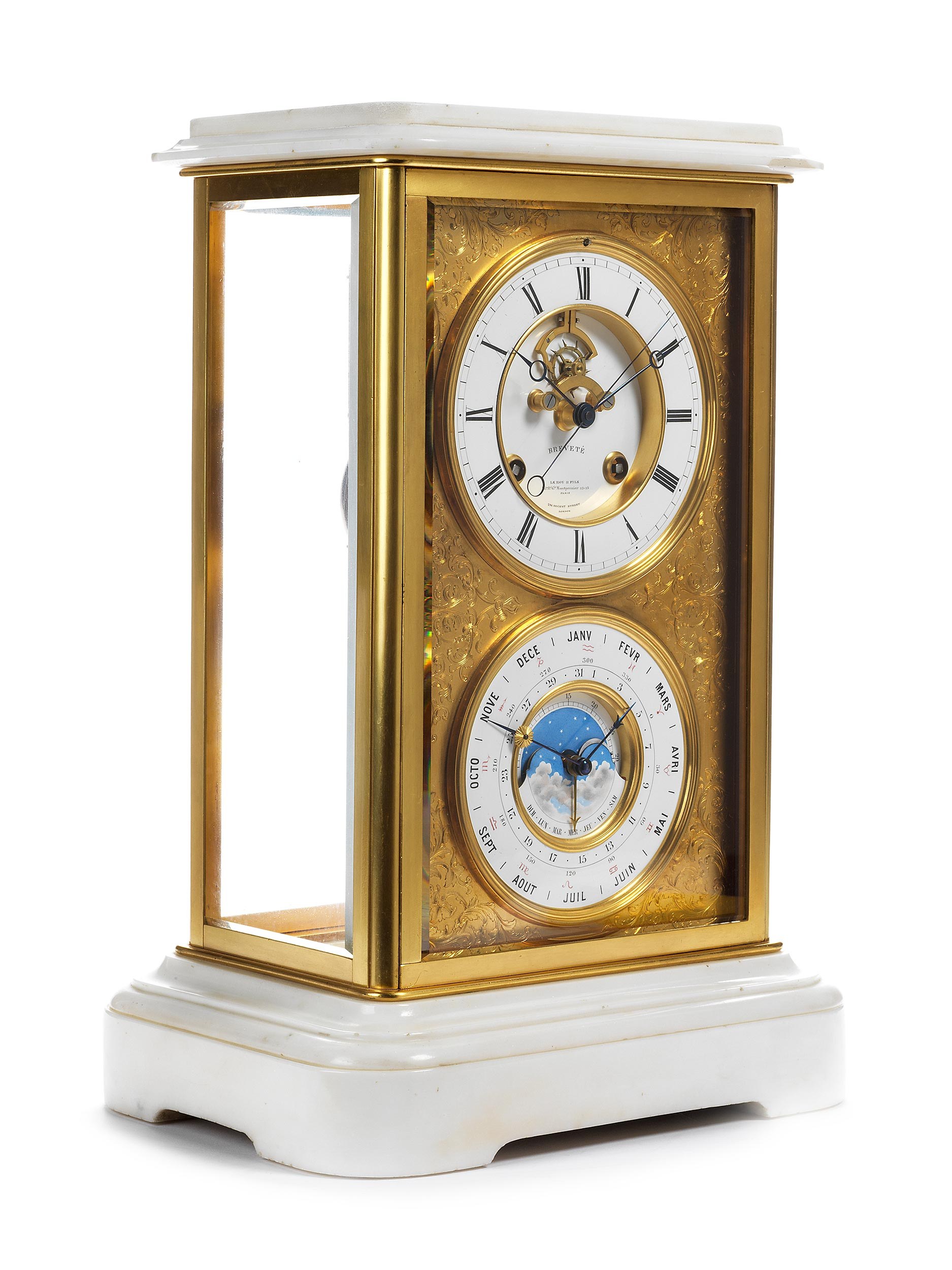 Marmor, vergoldete Bronze und Emailzifferblätter. Strenger, hochrechteckiger Gehäuseaufbau, allseitig verglast mit Randfacettenschliff in vergoldeten Rahmungen. Sockel und Deckplatte in weißem Marmor. Frontplatine vergoldet und reich mit Arabeskendekor graviert und ziseliert, darauf zwei weißemailierte Ziffernringe mit römischen Stunden, sowie darunter mit französischen Monats- und Tagesangaben, mittig Mondphase in Blau mit Sternen und separatem Monatszeiger. Die Brequet-Zeiger gebläut, zusätzlicher Sekundenzeiger. Das Werk an drei Seiten einsehbar; Pendel an Metallfederaufhängung, Feinregulierung oberhalb XII. Schlagwerk für Halbstunden- und Stundenschlag auf Glocke. Ankerbewegung im Ziffernring sichtbar. Gute Erhaltung, Werk nicht geprüft. (14101015) (11)