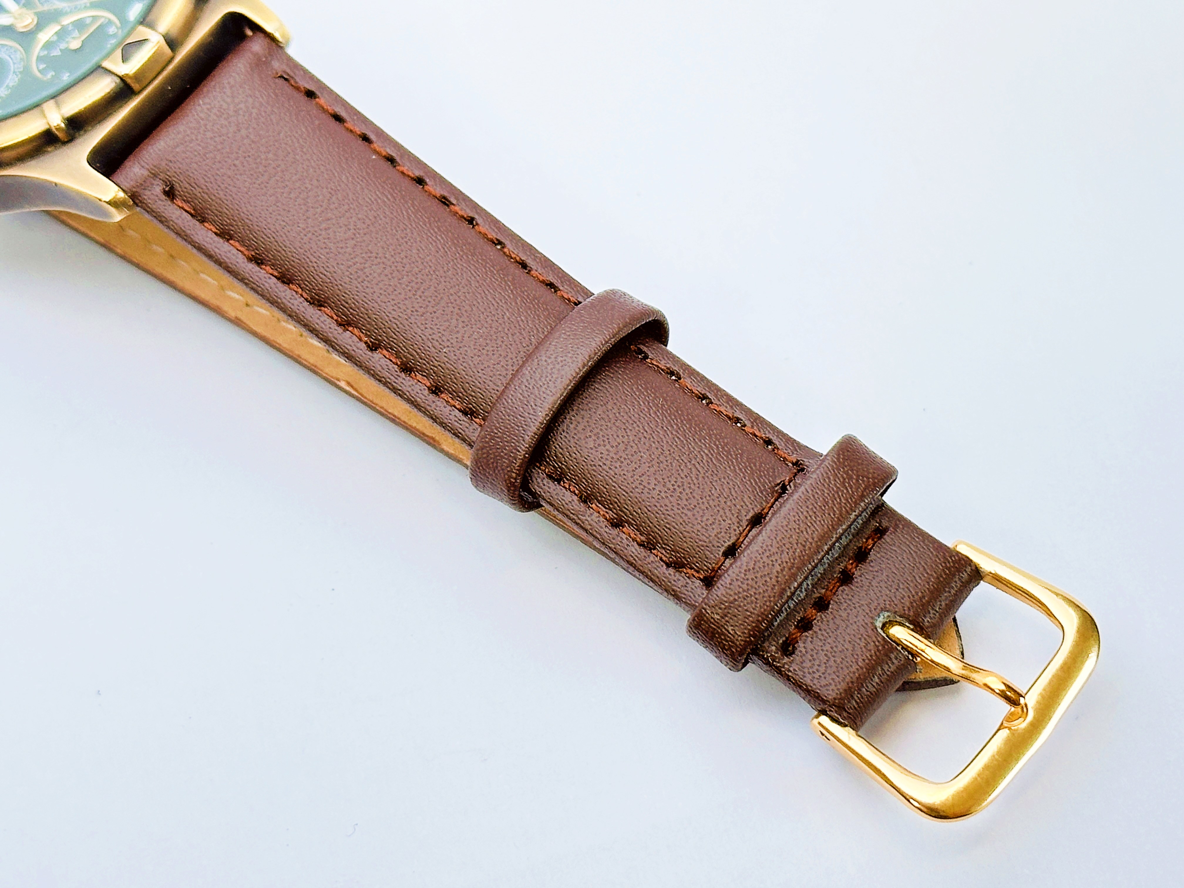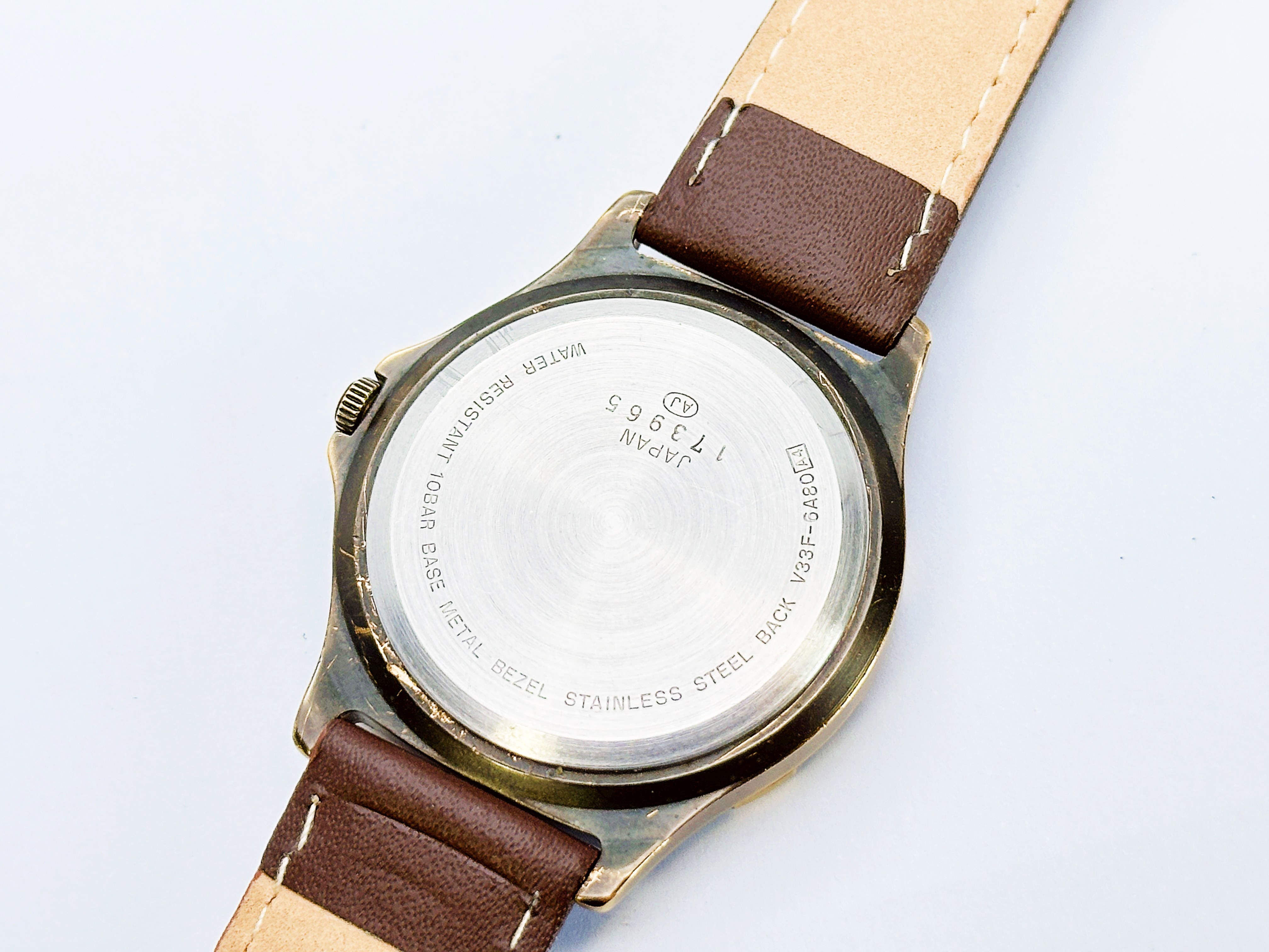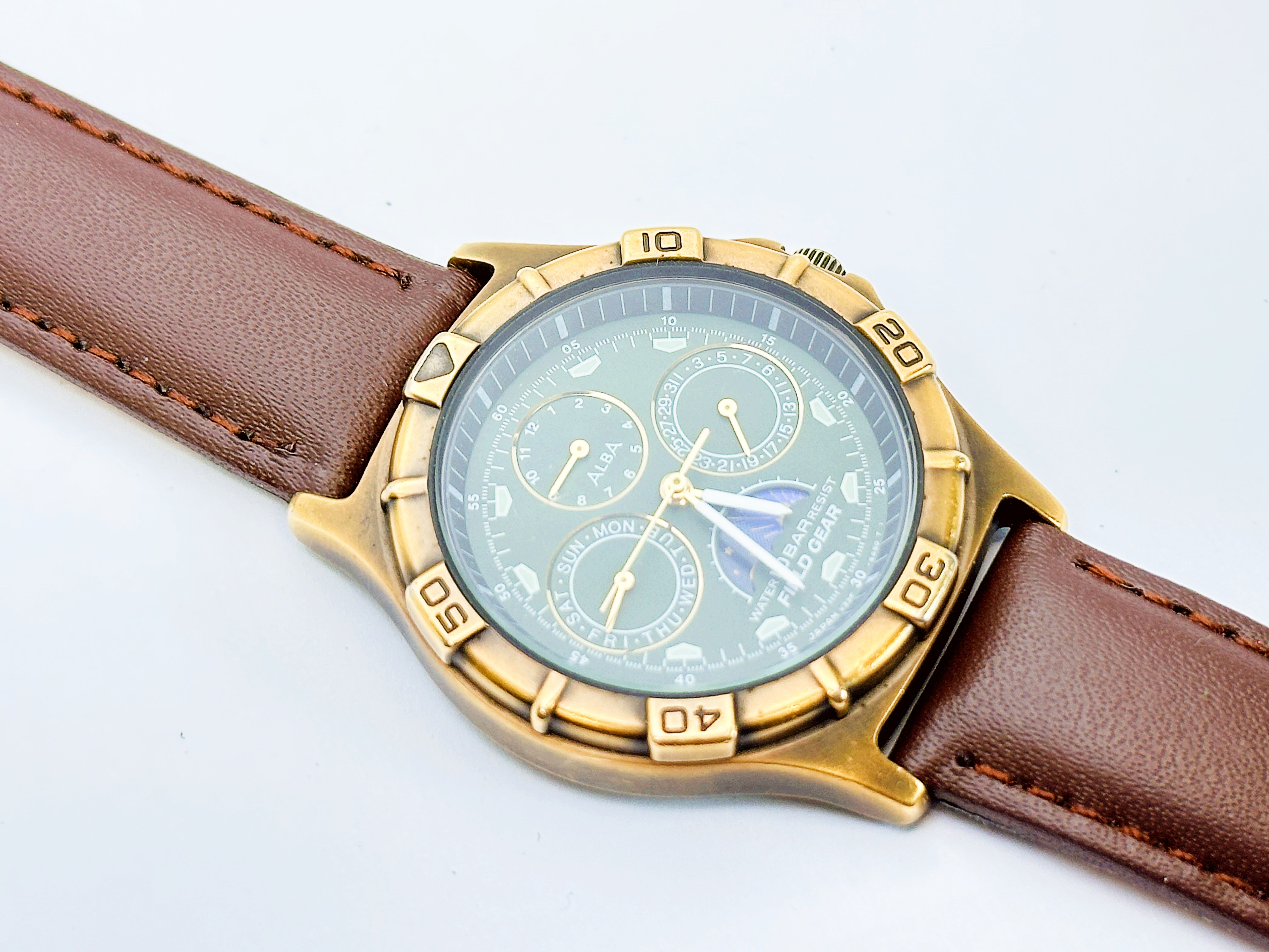 Zegarek kwarcowy, WR100M, z pełnym datownikiem oraz wskaźnikiem pozycji słońca i księżyca. Numer na deklu: 173965 oraz V33F-6A80. Nowy skórzany pasek. Zegarek na chodzie. Stan wizualny bardzo dobry, widoczny na zdjęciach