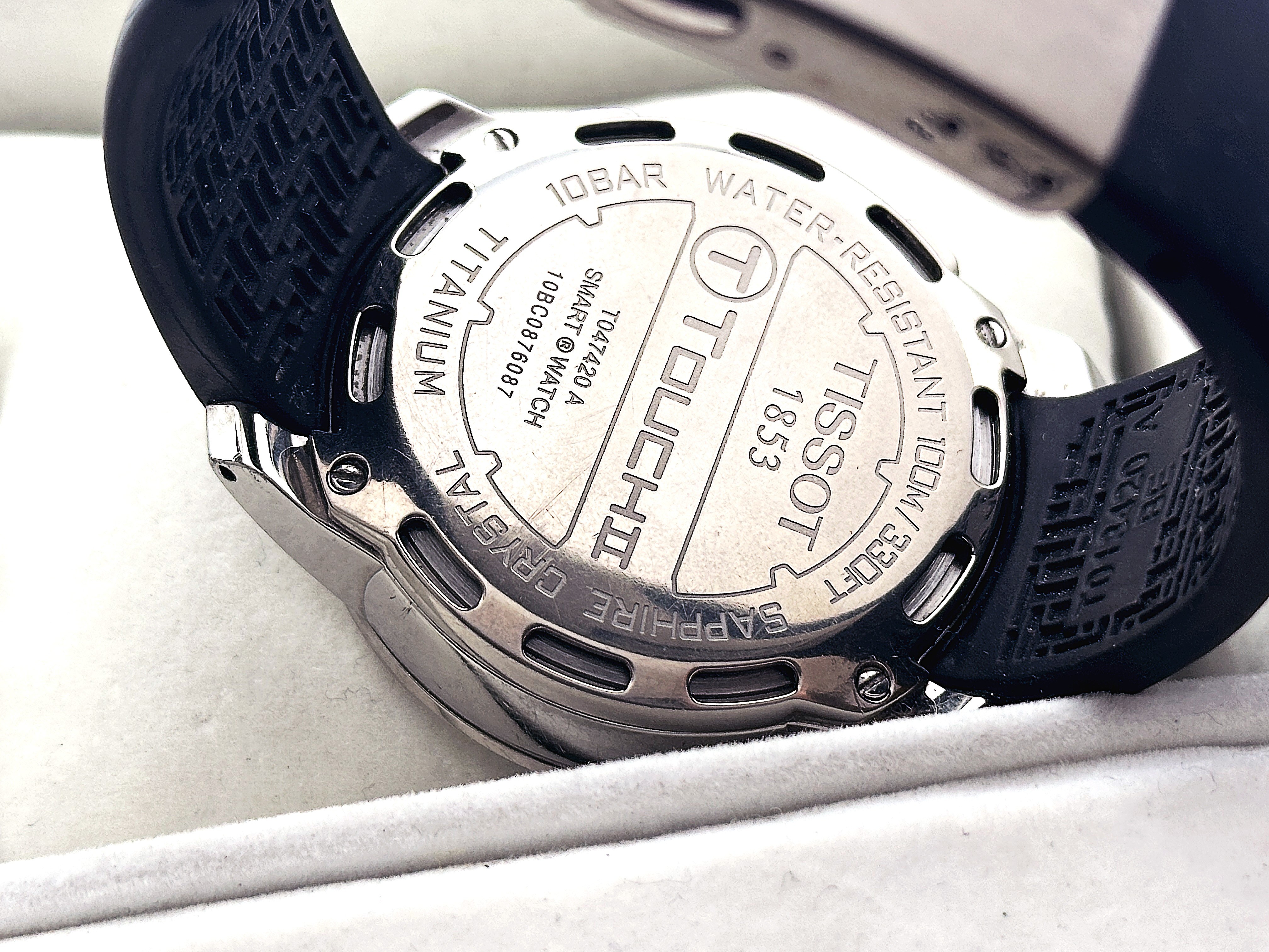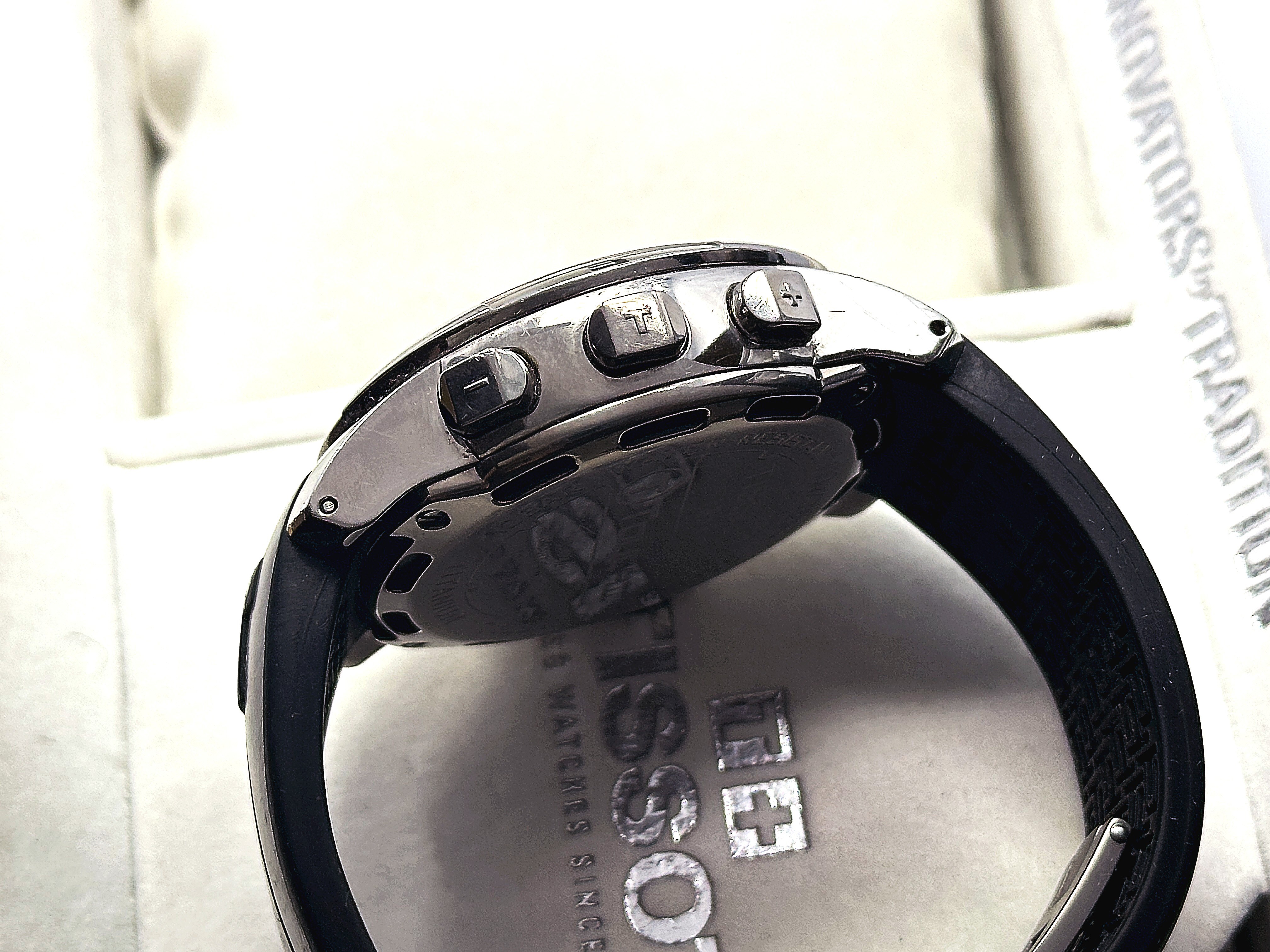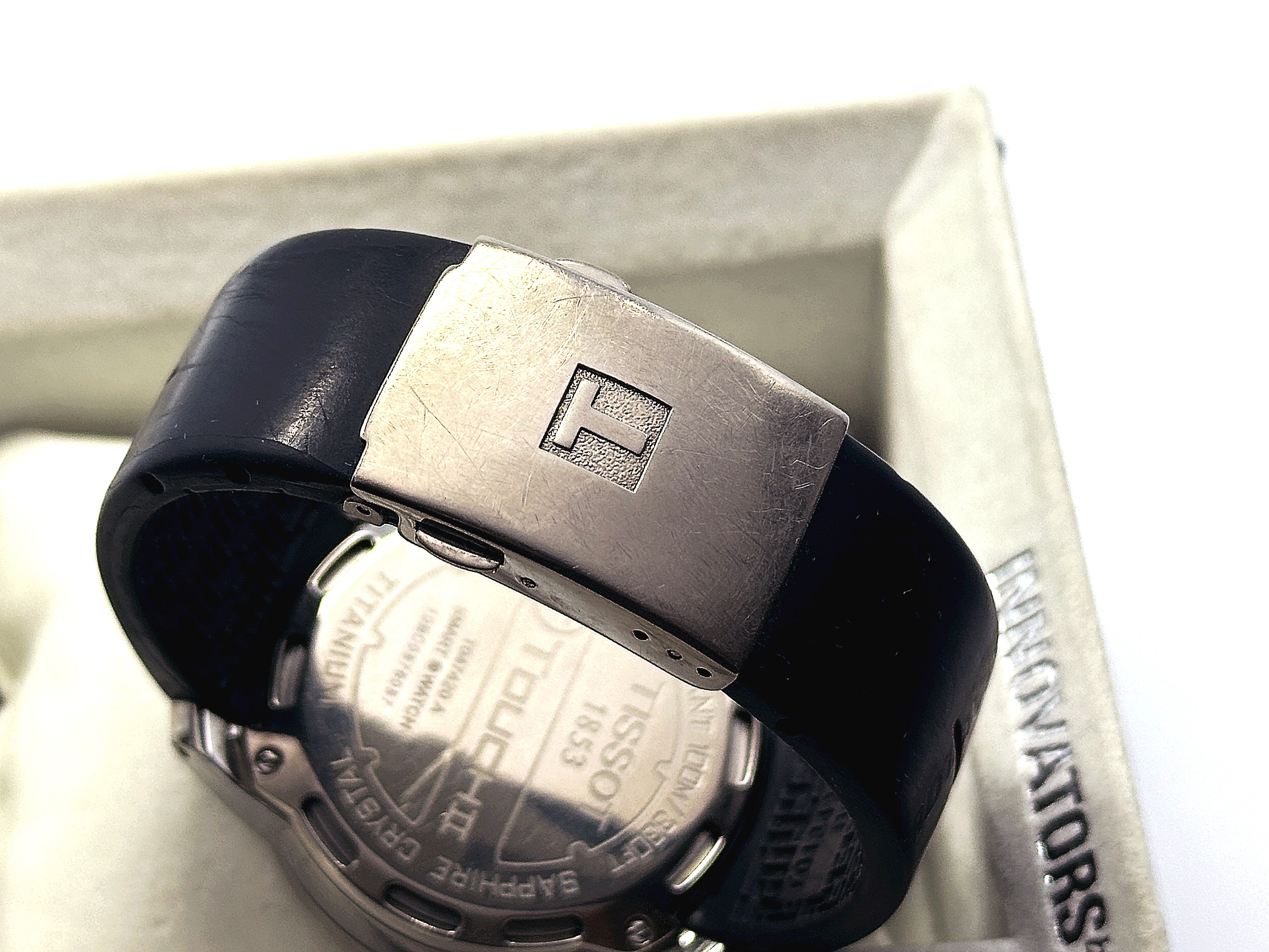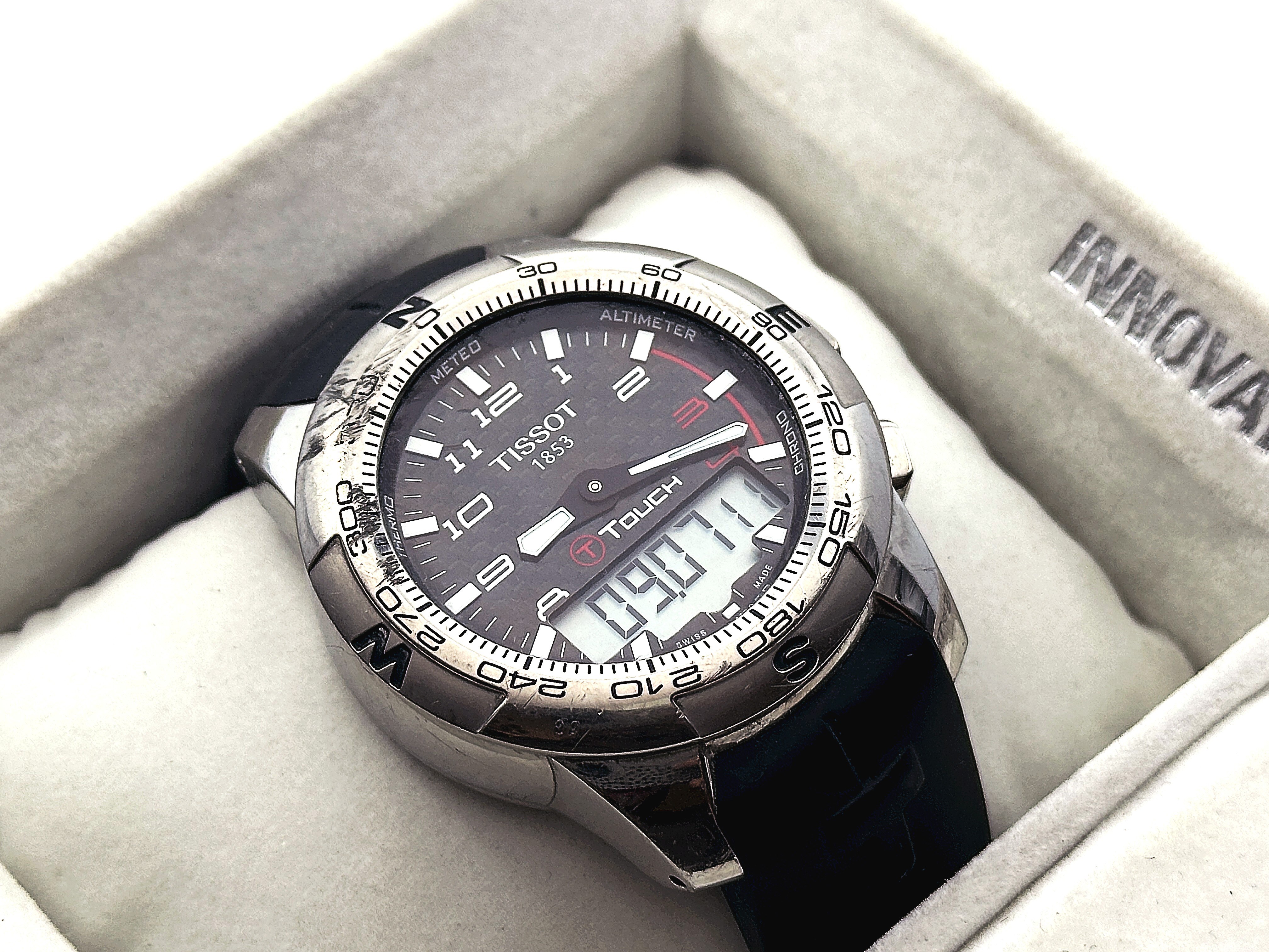Zegarek stalowo-tytanowy, kwarcowy, z kompasem, termometrem, alarmem itd. Numery na deklu: T047420A. OryginalnY pasek Tissot. Zegarek na chodzie, wymaga serwisu/kalibracji. Stan wizualny używany, głownie uszkodzenia na bezlu, widoczny na zdjęciach