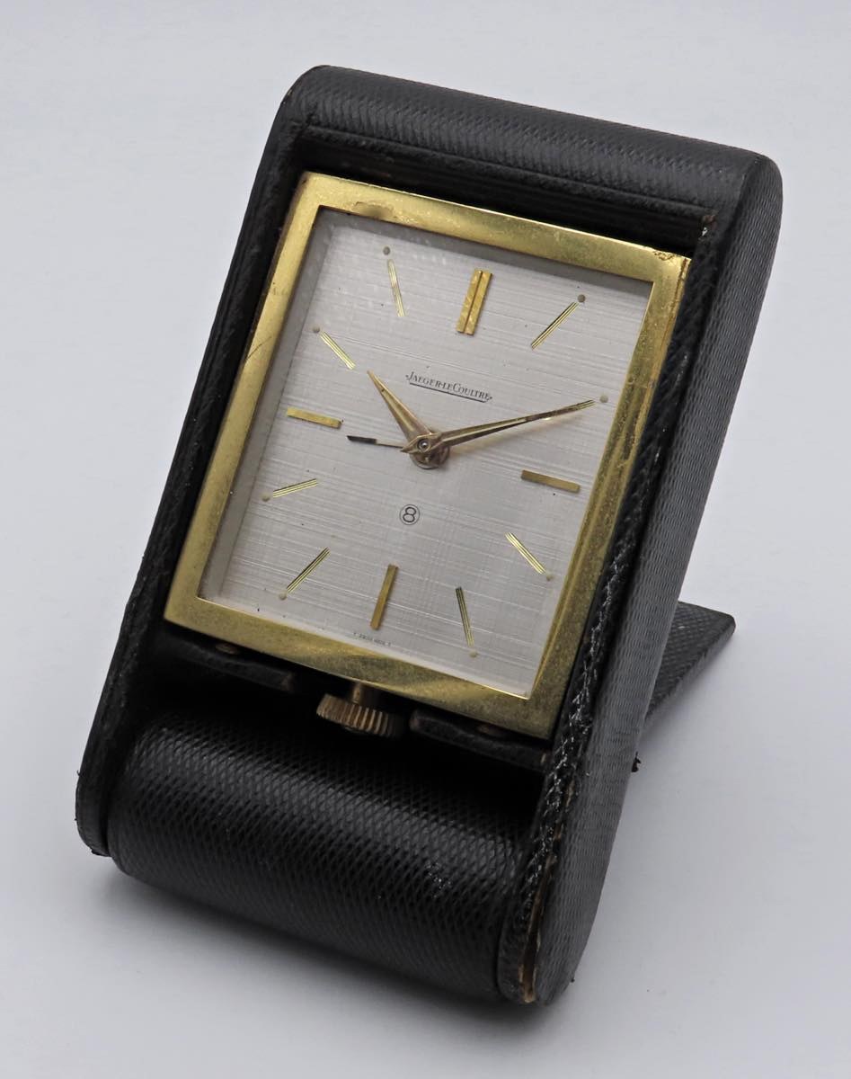 JAEGER LE COULTRE. Orologio da viaggio. Riserva di carica 8 giorni. Oggetto in pelle e ottone con sportello di apertura che diventa base di appoggio. Misure 10x6,5x1,5 cm (da chiuso). Oggetto in discrete condizioni generali. Funzionante, ma il movimento non è stato testato per la precisione del tempo.